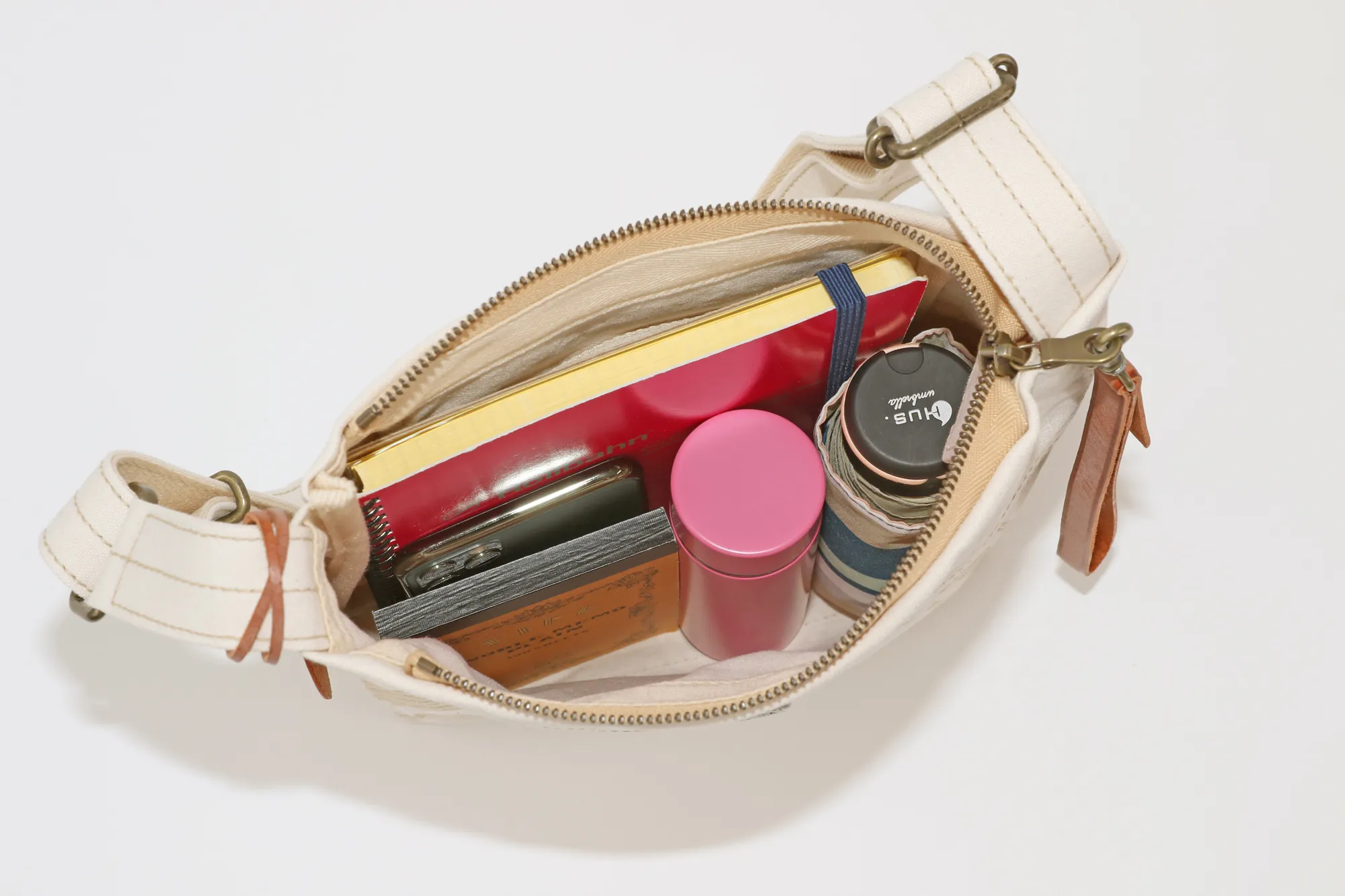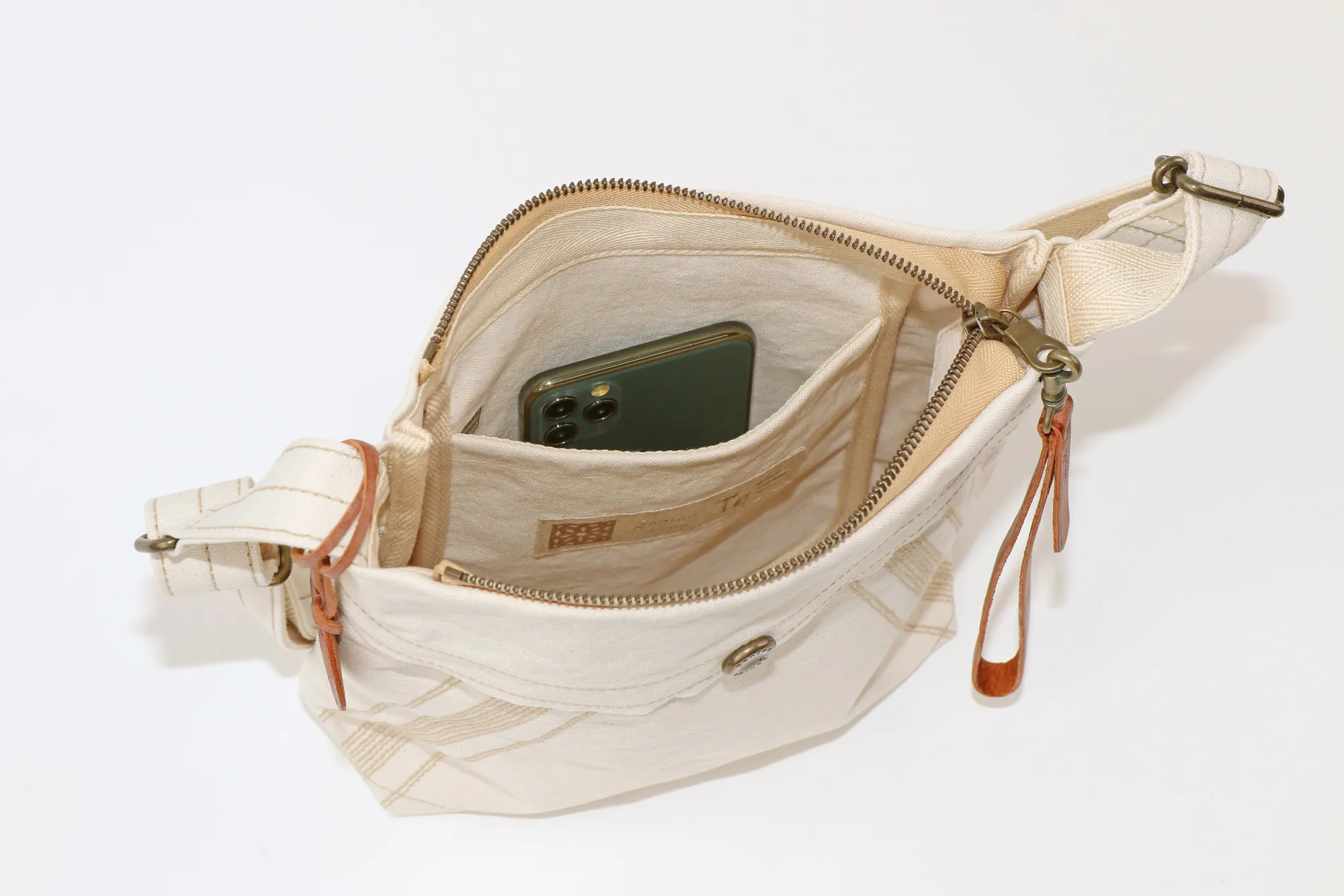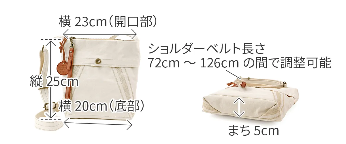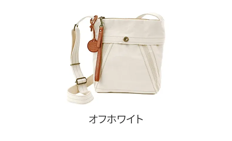 薄く適度な張りの高密度キャンバスを用い、一重仕立てで仕上げた、ショルダーバッグシリーズ。ビンテージミリタリーのヘルメットバッグ由来の前胴ポケットと、ミモザステッチがアクセント。 開閉しやすさを考慮した長めな革引手とチャームは着脱可能。汚れたら手洗いできます。経年変化を存分に楽しめる薄口タンニン染めの生地を採用。 どのモデルの胴面も、一枚の布地を畳んでマチ幅を確保し、角張りが出ずらい構造を提案。骨張りが少なくなり、身体に優しい使い心地になるようにしました。 印象的な前胴のミモザステッチは、装いのアクセントとしてアクティブなイメージを与えるとともに、ボディをコンパクトに見せてくれる視覚的効果も同時に得られます。 内装釣りポケットはいずれもスマホや手帳が縦に収まる寸法を確保。軽さに重点をおいた仕様です。 〈素材の特性・メリット〉 打ち込み良い岡山県倉敷児島の伝統的11号シャトルパラフィンハンプを採用。ありのままの無染色の綿糸の色=生成りのキャンバスを使いました。 縦に口金財布やペットボトルがジャストで収まるコンパクトサイズのミニショルダー。散歩~街歩き程度にちょうどよいサイズ感で、必要最低限な収納を充分に満たします。