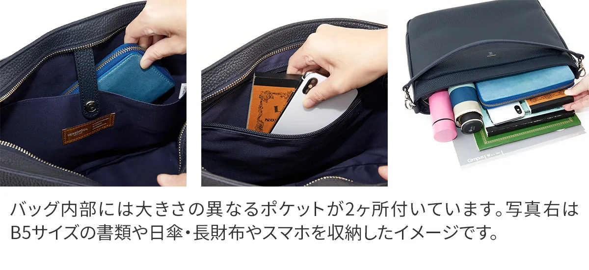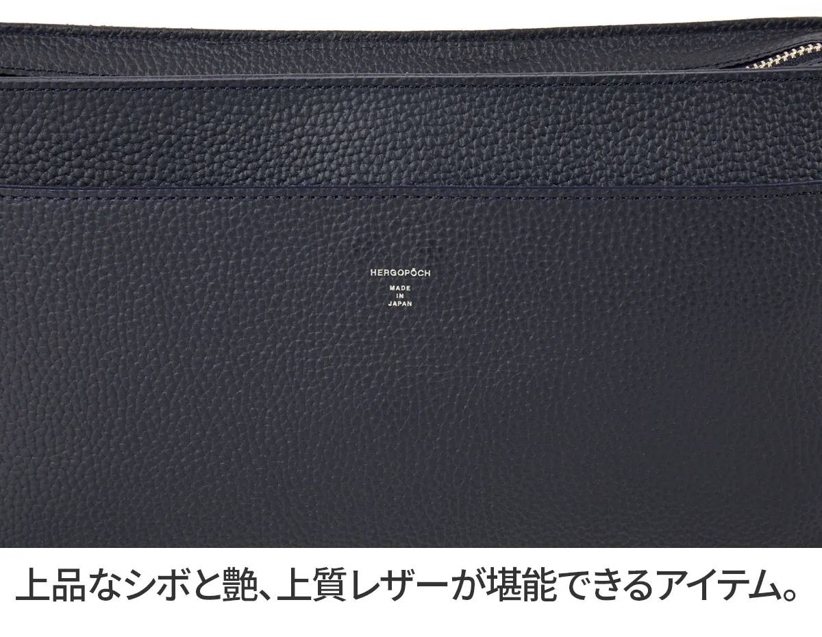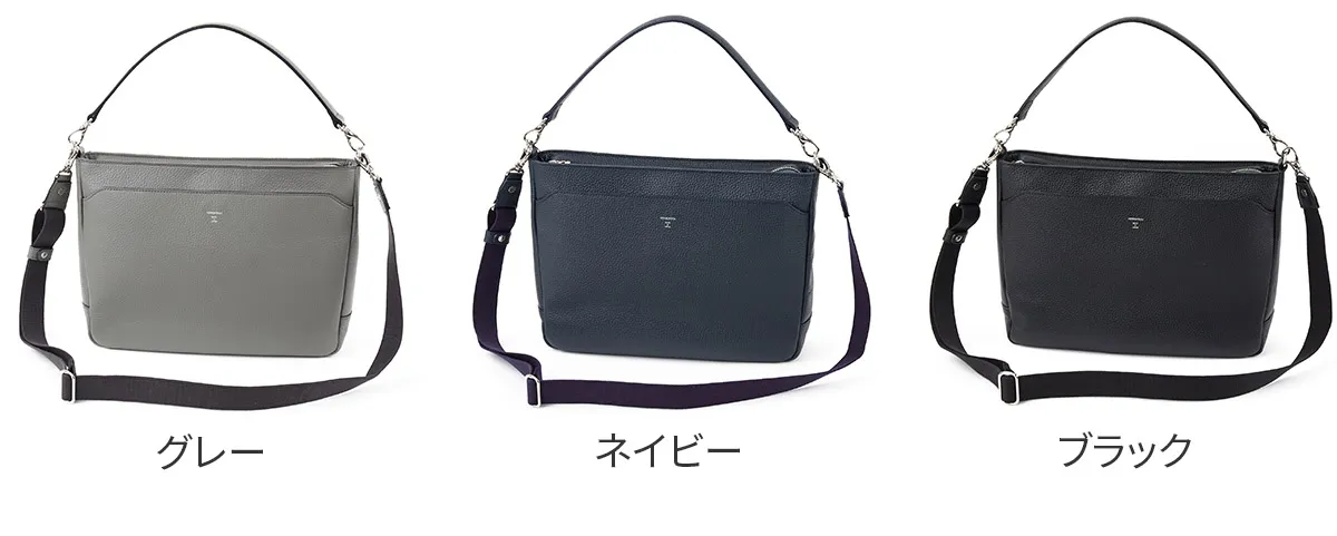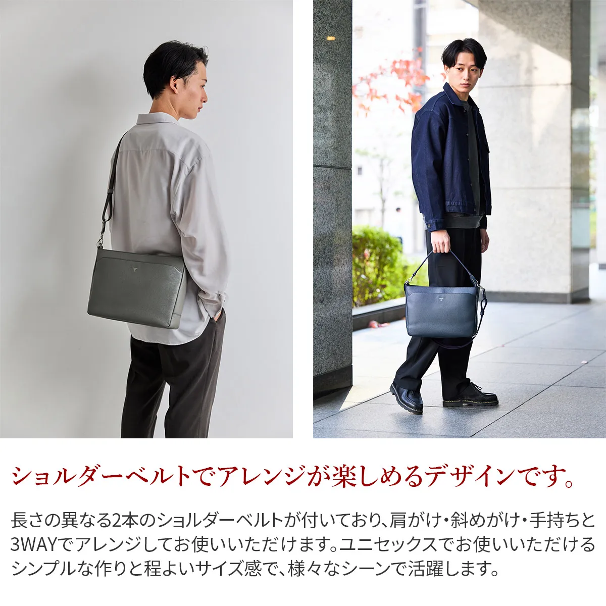 軽さと発色の良さが特徴のエンボスレザー。自然なシボを再現した型押しを施しています。 表面に傷がつきにくく、付いても型押しのおかげで気になりません。 経年変化による色の変化が生じにくく、綺麗なままお使いいただけるタイプのレザーです。 エンボスレザーの2wayショルダーバッグです。 取り外し可能な2本のショルダーベルトで、シーンやコーデに合わせてアレンジをお楽しみいただけます。 ベーシックゆえに華美なデザインは施さず、素材の良さを堪能していただけます。外装表裏に設けたポケットが使い勝手良く、内装にも複数ポケットを備え仕分け性能に優れます。