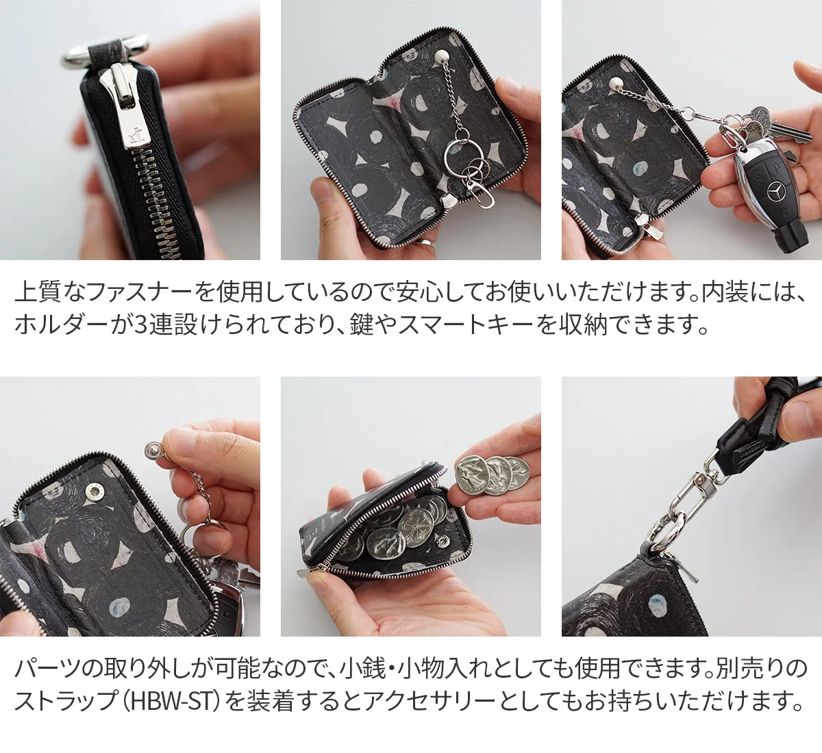 ヘラルボニーとの特別なコラボレーションによるキーケース。 内装にはキーリングとフックが付いており、鍵の種類に合わせて使い分けができます。 キーリングパーツを外せば、コインや小物を収納できるマルチケースとしても活躍。 さらに、別売りのストラップと組み合わせることで、まるでアクセサリーのように持ち歩くことができます。 シンプルなデザインは、どんなコーディネートにも自然に馴染み、さりげなくアートを日常に取り入れることが可能に。 キーリングとフックを備え、鍵の種類に合わせてスマートに使い分けが可能なキーケース。 パーツがボタンになっているため、取り外しが可能です。 シーン、用途に応じて使える、機能性の高いアイテムです。 ※キーケースのみの販売です。
