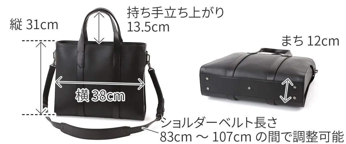 ベジタブルタンニンレザーのトートバッグ。 A4、14インチPCに対応するサイズです。 横に広がらないフォルムはスーツスタイルにも合わせやすく、サイドのまとめ方やパーツ使いといったディテールにこだわったトートバッグです。 2種類のレザーを使い分け、本体には使うほどに馴染むソフトヌメ革を、ストラップや部分パーツには国内では希少なピット鞣しのヌメ革を使用しています。 経年変化を楽しめる本格的なレザーと、マットな金属パーツがクールで男らしい印象を作ります。 ≪素材の説明≫ 「2種類のベジタブルタンニンレザーを使用」 本体の革には、ソフトヌメ革を使用。 ベジタブルタンニン鞣しの下地にじっくりとオイルを揉み込み、さらに染料染め段階でパラフィン(石蝋)を加えています。 それにより使うほどに馴染み、美しい艶と味わい深い経年変化が楽しめるレザーに仕上がっています。 ベルト、ハンドル、ショルダーストラップなどの耐久性を求められるパーツにはヌメ革(ピット槽鞣し)を使用。 植物樹脂タンニンが入った槽に長期間つけ込むピット鞣しによるこの本ヌメ革は、革本来の風合いが感じられる染料仕上げです。 使い込むと美しい艶が現れるとともに、ハードな使用環境でも耐える堅牢さを持ちます。 かっちりとしたフォルムの端正なトートバッグ。 2種類のレザーを使い分けたマテリアルが特徴的で、HERGOPOCHらしいこだわりのバッグに仕上がっています。 ハリのある革を使用しており使いはじめはかっちりとした印象ですが、使うほどに革に柔軟性が加わり“こなれた印象”が出てきます。 ビジネススタイルにもマッチするスマートなデザインなので、オンオフ問わず合わせられる逸品です。 ショルダーベルトが付属しており、スタイルにあわせてショルダー持ちも可能。