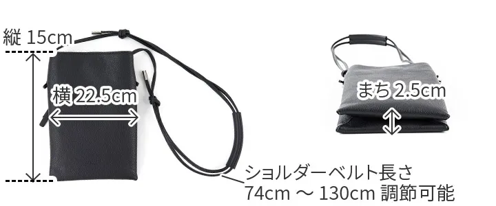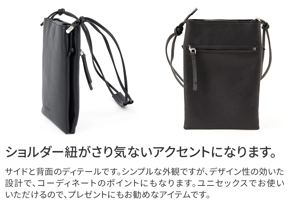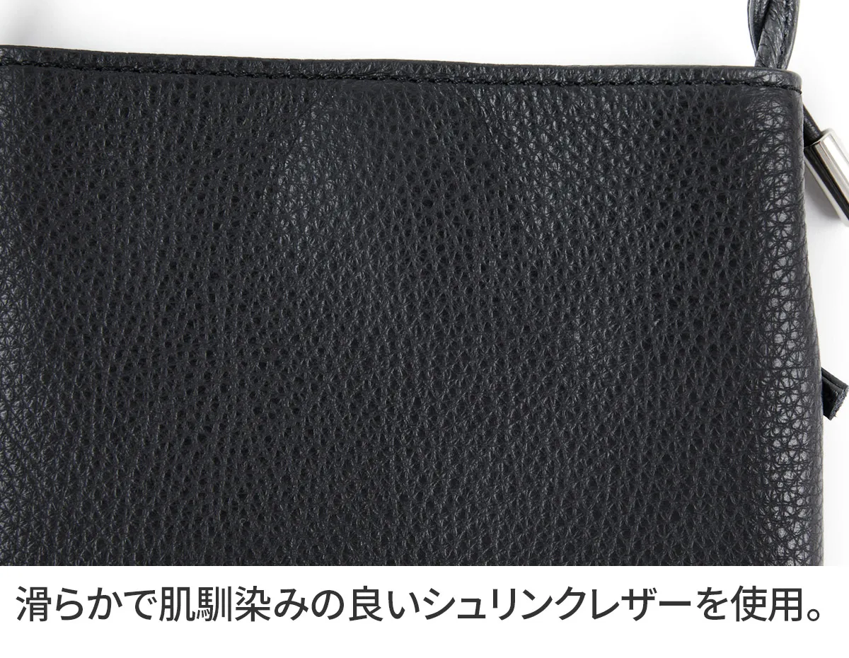 素材は原皮選びから鞣(なめ)し、仕上げまで、革の本場であるイタリアのタンナーで品質管理され作られています。 この原皮は、タンナーが扱うトップクオリティーの生地のみから選ばれ、長時間ゆっくりとミーリングされた天然のシュリンクレザーです。 革の質感をしっかり感じられるように表面はごく薄いコーティングにしているのは、同時に衣類への色移りがしないような特別な加工でもあります。 ソフトシュリンクレザーを使用した2ルーム仕様のショルダーバッグ。 細いショルダー紐、2つのバッグをくっつけたようなユニークな見た目がポイントです。 内装で仕切られており同等の荷室が2つ存在します。 背面にはファスナーポケットも備えているので、コンパクトサイズながら仕分け性能に長けています。