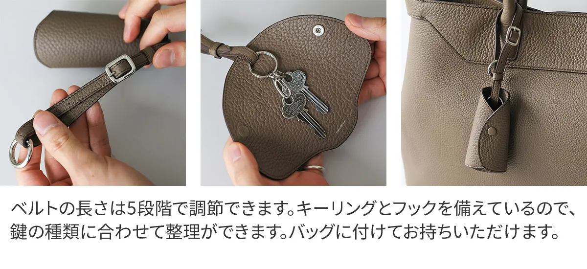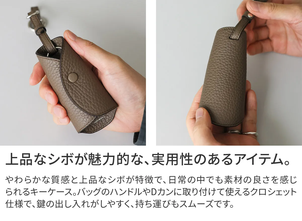 フランスの老舗タンナーRemy Carriat社のシュリンクレザー「トリヨンラグーン」を使用したクロシェットキーケース。やわらかな質感と上品なシボが特徴で、日常の中でも素材の良さを感じられる仕上がりです。バッグのハンドルやベルトループに取り付けることで、アクセサリー感覚で持ち運べます。 付属のリング型カラビナにより、Dカンなどへの着脱もスムーズ。内装にはキーリングとフックを備えており、鍵の種類に合わせて整理が可能です。シンプルなデザインながら、使い勝手にも配慮した仕様。日常使いの中で自然に馴染む、実用性と質感を兼ね備えたキーケースです。