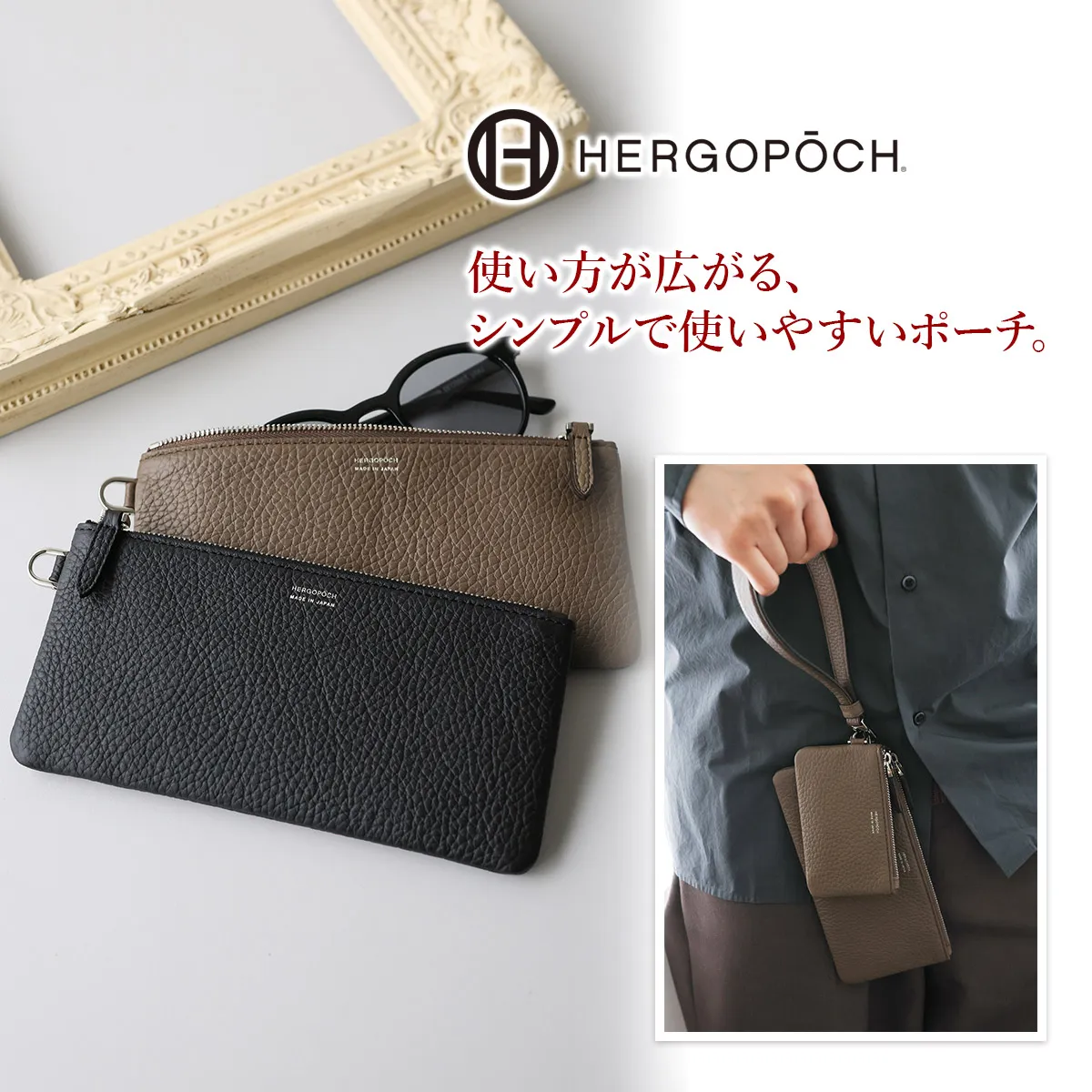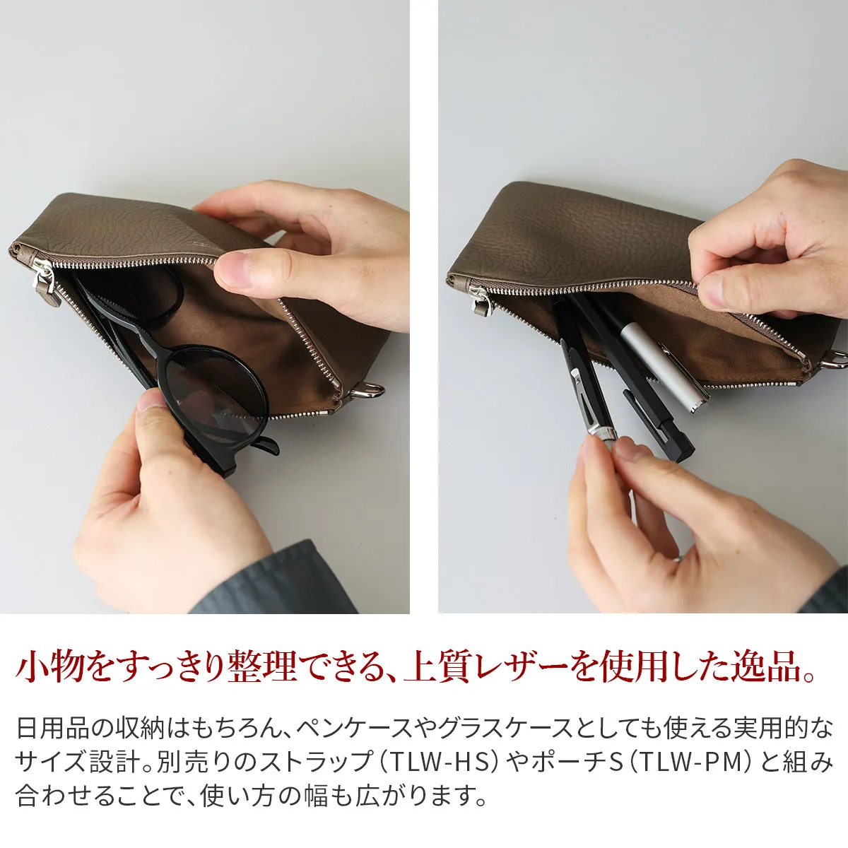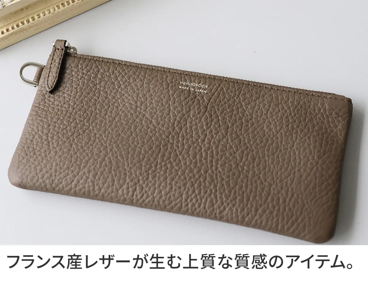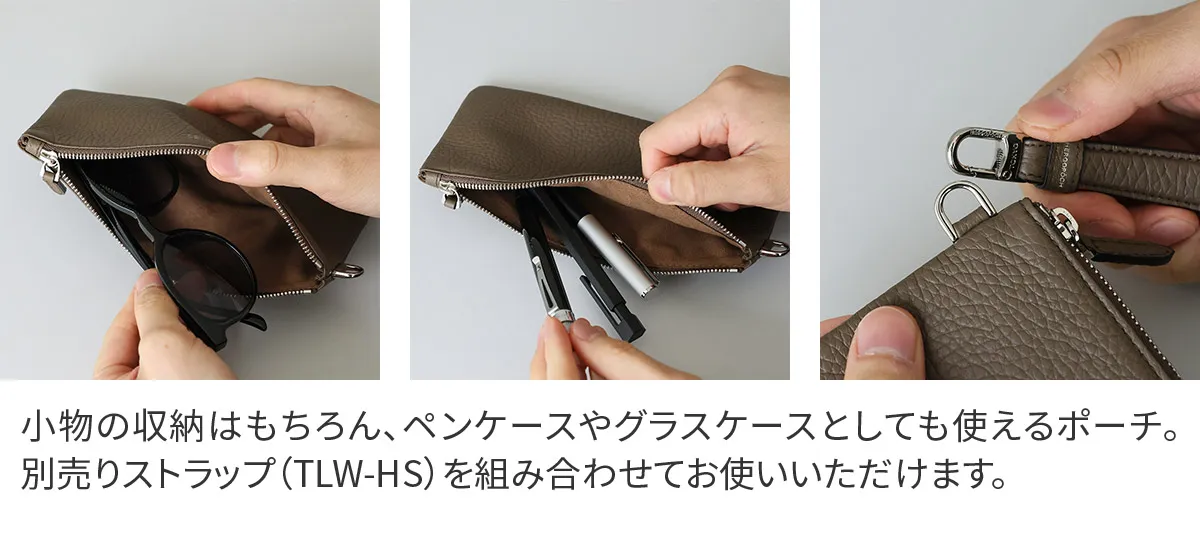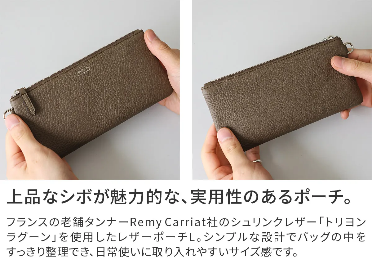 フランスの老舗タンナーRemy Carriat社のシュリンクレザー「トリヨンラグーン」を使用したレザーポーチL。やわらかな質感と上品なシボが特徴で、落ち着いた存在感のある仕上がりです。日用品の収納はもちろん、ペンケースやグラスケースとしても使いやすく、幅広い用途に対応します。 シンプルな設計でバッグの中をすっきり整理でき、日常使いに取り入れやすいサイズ感。別売りのハンドストラップやポーチSと組み合わせることで、持ち運びや収納の幅を広げることも可能です。用途やスタイルに合わせて使い方を変えられる、汎用性の高いレザーポーチです。