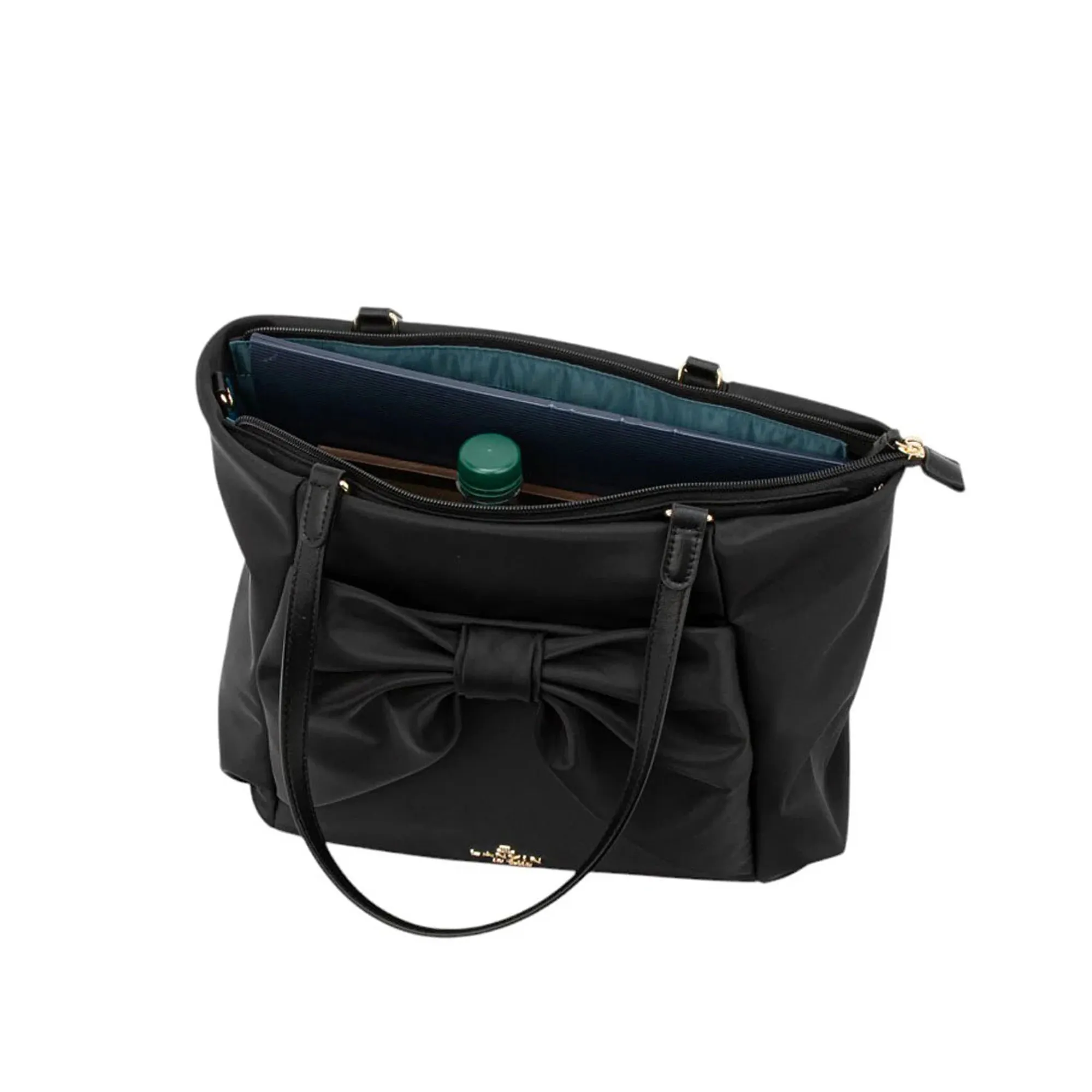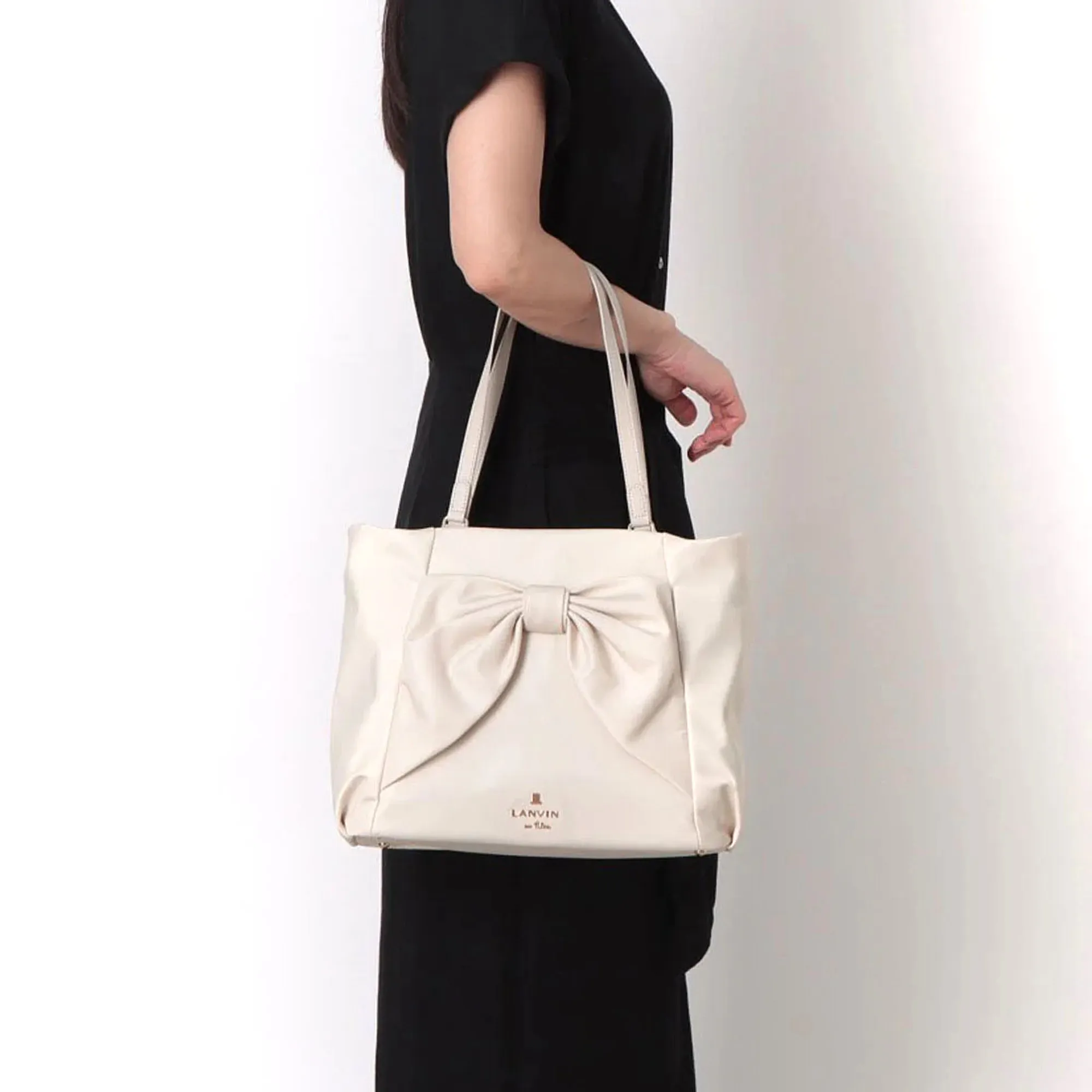 上品なリボン使いが印象的な「ジョエル」シリーズのトートバッグ。 生地の美しい光沢感を活かした立体的なリボンディテールが、クチュールライクな雰囲気を演出し、ランバン オン ブルーらしいエレガンスを感じさせます。 フロントに大胆にあしらったリボンがデザインの主役となり、シンプルなコーディネートに華やかさをプラス。 フレッシュなアイボリーカラーは肌なじみが良く、季節を問わず取り入れやすいのも魅力です。 A4サイズが収納可能な実用的なサイズ感で、通勤や通学はもちろん、きちんと感が求められるシーンにも対応。 デザイン性と収納力を兼ね備え、日常を上品に彩るトートバッグです。