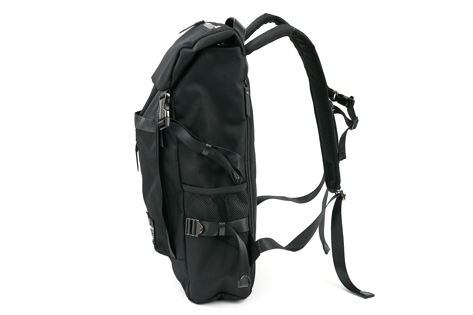 洗練されたデザインと収納力を両立させたバックパック。 デザインのポイントとして用意されたフロントのウェビングテープにはカラビナなどを付けて使用してもOK。 すぐに取り出したいスマホや小物を入れられます。フロント、バックのポケットには止水ファスナーを使用し、水分の侵入を防ぎます。 素材には高密度ナイロン「N/ROBICR」を使用し、上品な光沢とドレープ感を実現。 シンプルながら機能的な設計が、移動の多い通勤・通学・旅行で頼れるバッグです。
