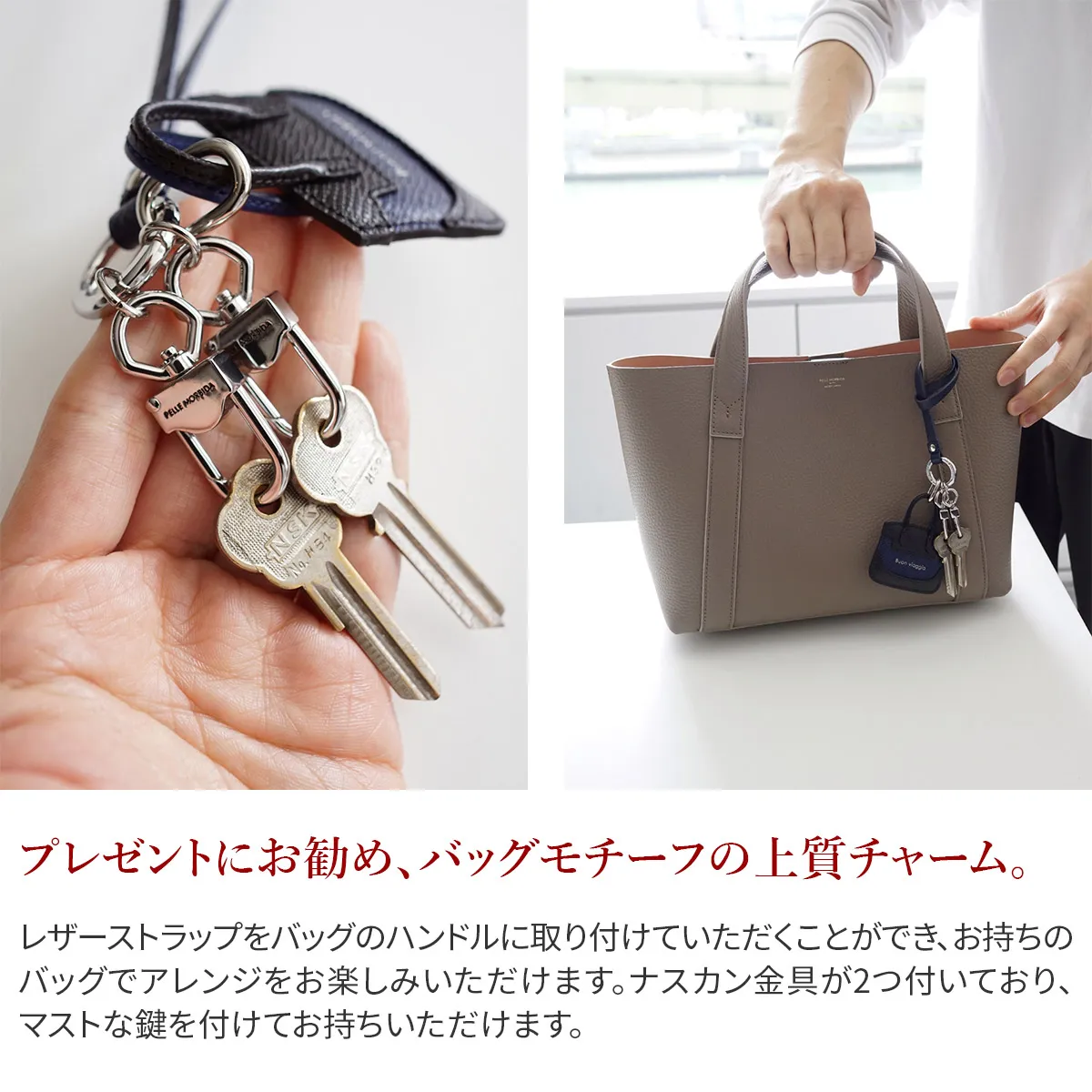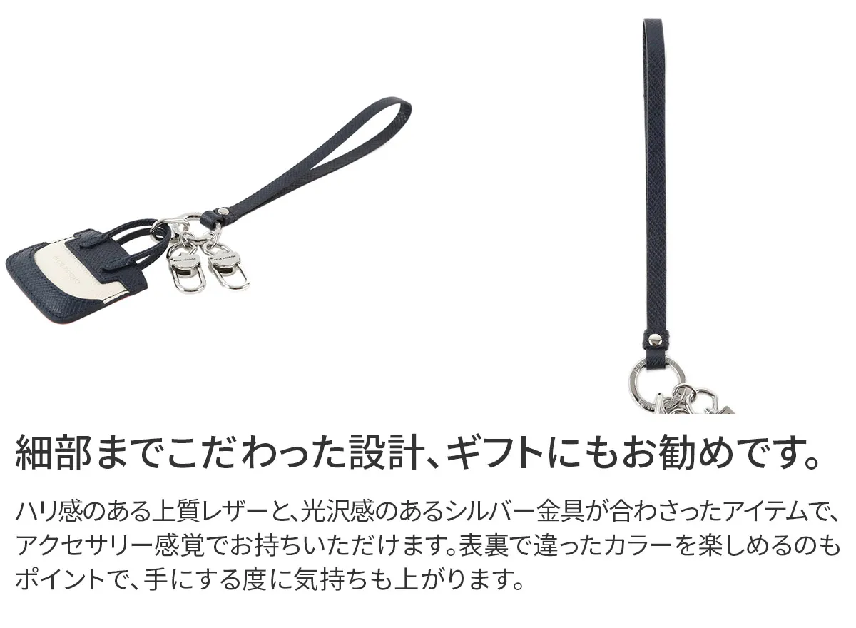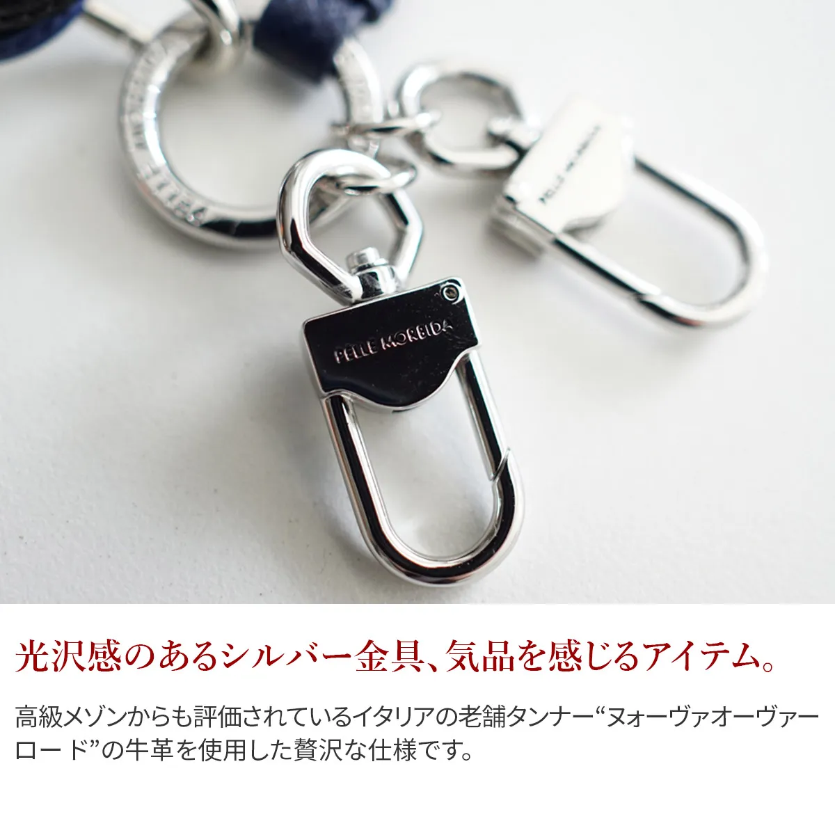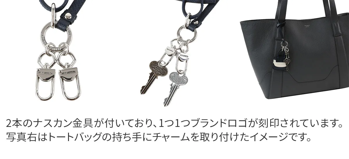 高級メゾンからも評価されているイタリアの老舗タンナー“ヌォーヴァ オーヴァーロード”の牛革を使用した贅沢な仕様です。 細部まで丁寧に縫製された、高級感のあるアイテムです。バッグに取り付ることでアレンジをお楽しみいただけます。 ホルダーが2連付いており、ブランドロゴが刻印されています。