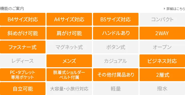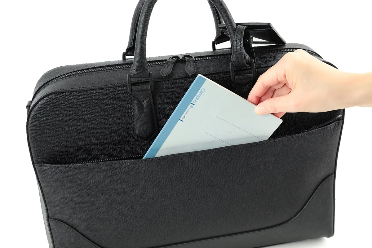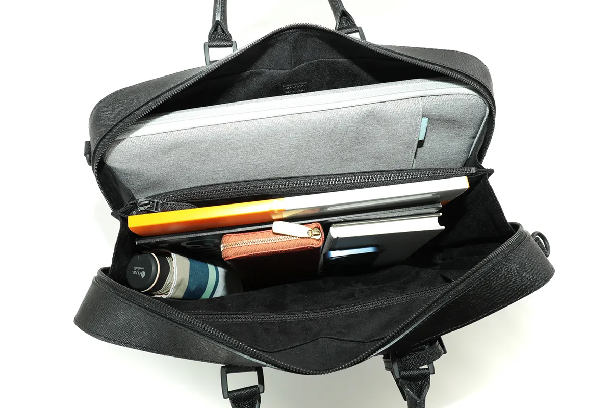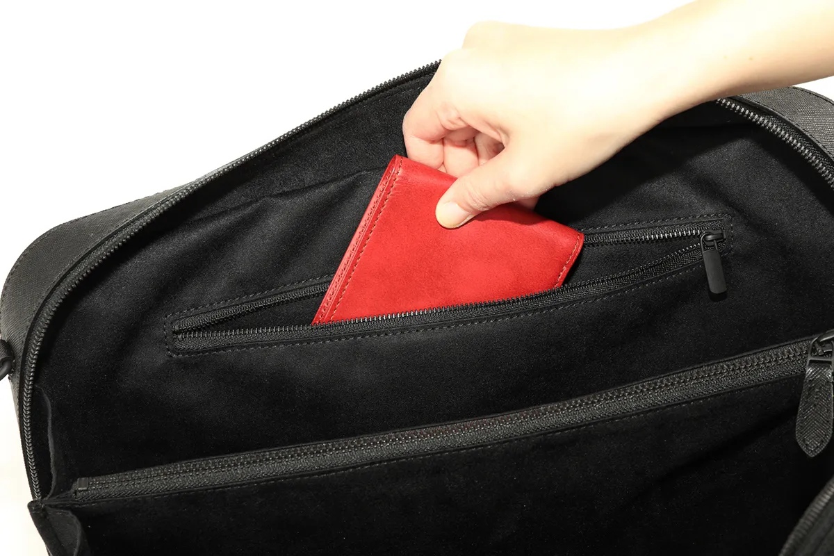 シンプルなデザインが、より一層洗練された大人の雰囲気を醸し出します。ジップから内装のボタン、ステッチまですべてブラックの仕上りです。ショルダーストラップで斜めがけにすることもでき、ストレスフリーで使える逸品です。 細かな筋を格子状に並べたサフィアーノ調の型押しによって大人の色気を演出するとともに、キズや汚れなども目立ちにくいのが特徴です。内装にはマイクロライトスエードを使用しており心地よい肌触りになっています。