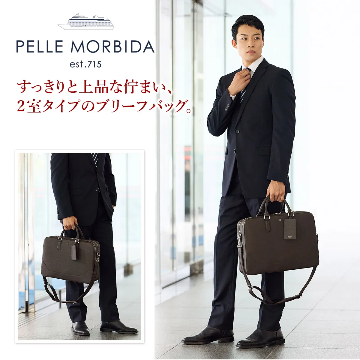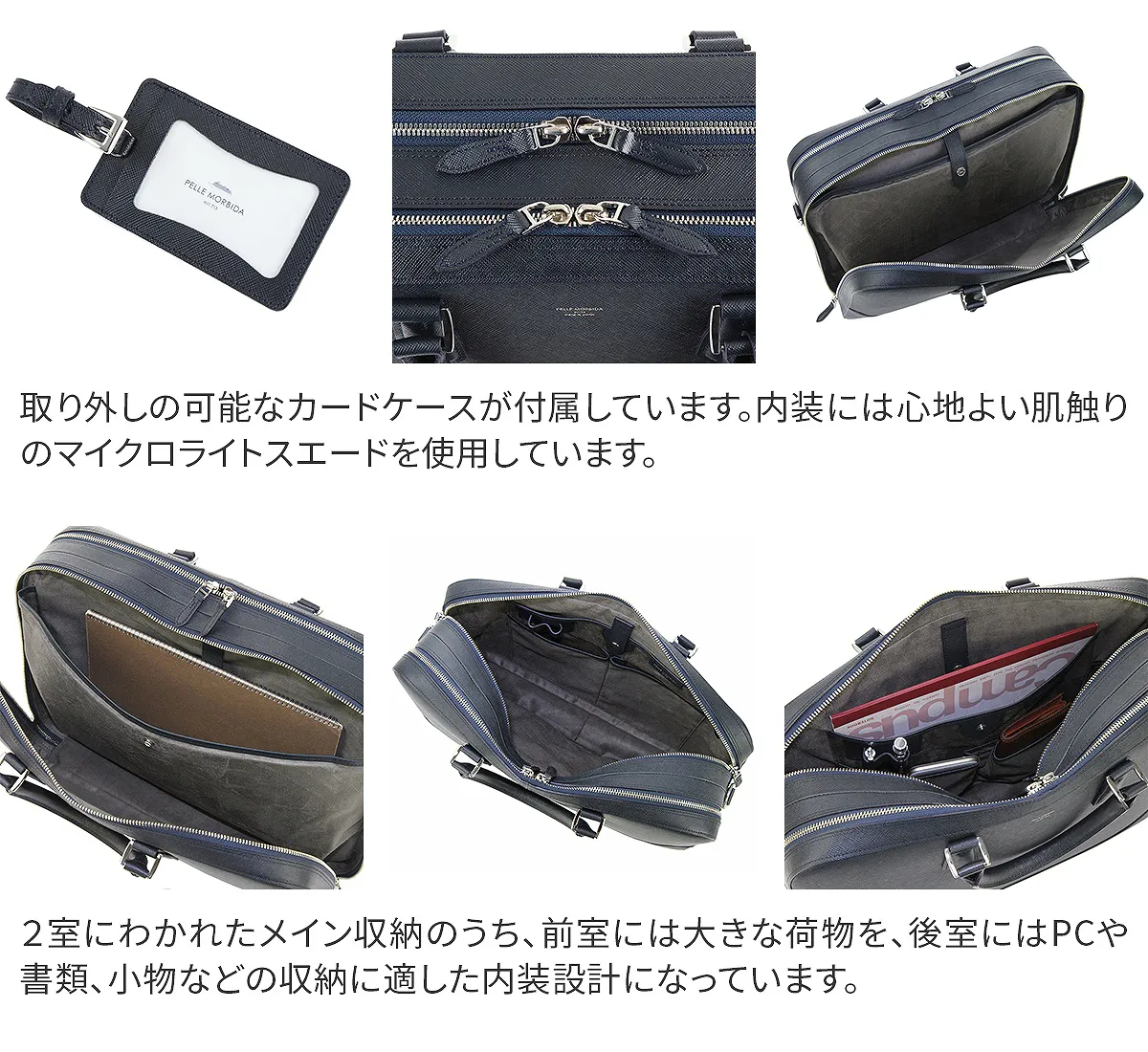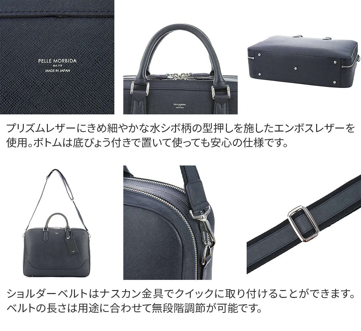 PELLE MORBIDA(ペッレ モルビダ) Capitano (キャピターノ) エンボスレザー B4ブリーフケース 2室タイプ(ショルダーベルト付属) PMO-CA014 充実した機能が詰まった、スタイリッシュなブリーフバッグ。