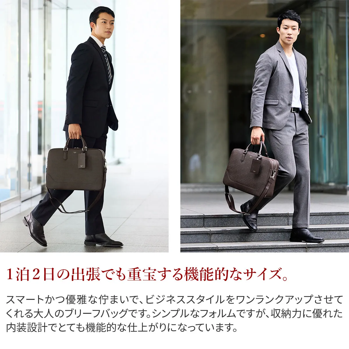 ビジネスシーンで活躍するブリーフも、スタイルによって選びたいもの。このブリーフバッグは張り感のある革を、切り替え部分少なく贅沢に使用することでドレッシーな表情を引き出しました。インポートもののような雰囲気が魅力的でスーツスタイルはもちろん、軽やかなスタイリングにもマッチします。