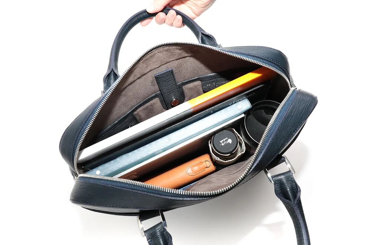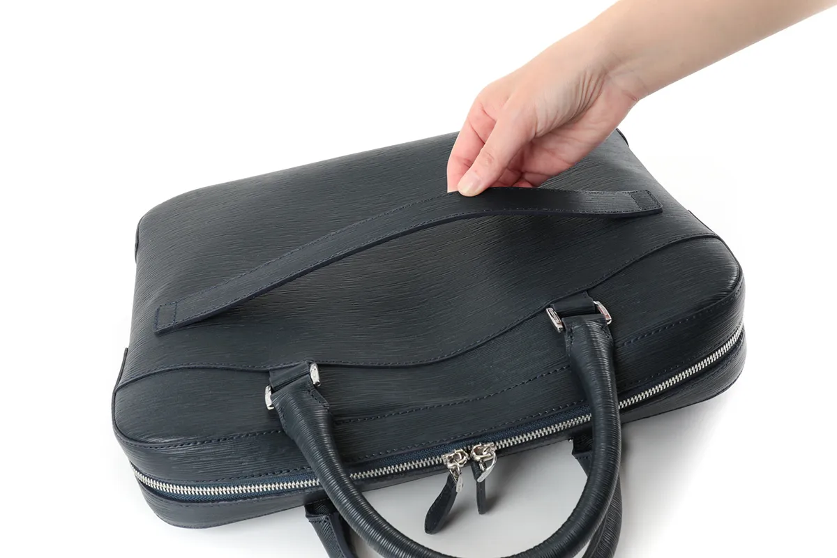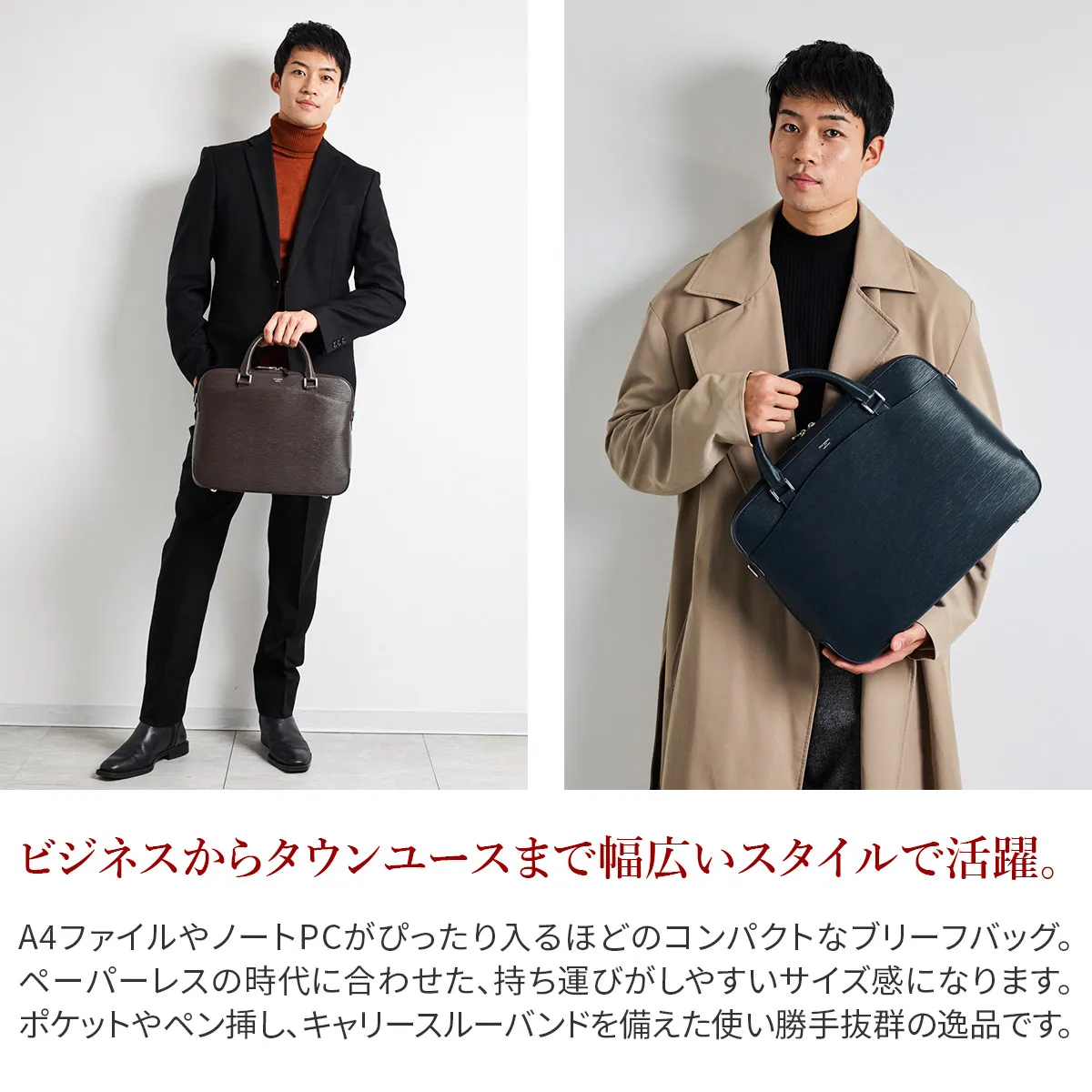 A4ファイルやノートPCがぴったり入るほどのコンパクトなブリーフバッグ。ペーパーレスの時代に合わせた、持ち運びがしやすいサイズ感になります。ポケットやペン挿し、キャリースルーバンドを備えた使い勝手抜群の逸品です。 波のような大らかさを普遍的で飽きのこない模様に落とし込んだオリジナルの型押しレザーを使用しています。しっかりとした質感の堅牢な牛革に上品な型を押すことで、重厚かつ優美な雰囲気を演出してくれます。