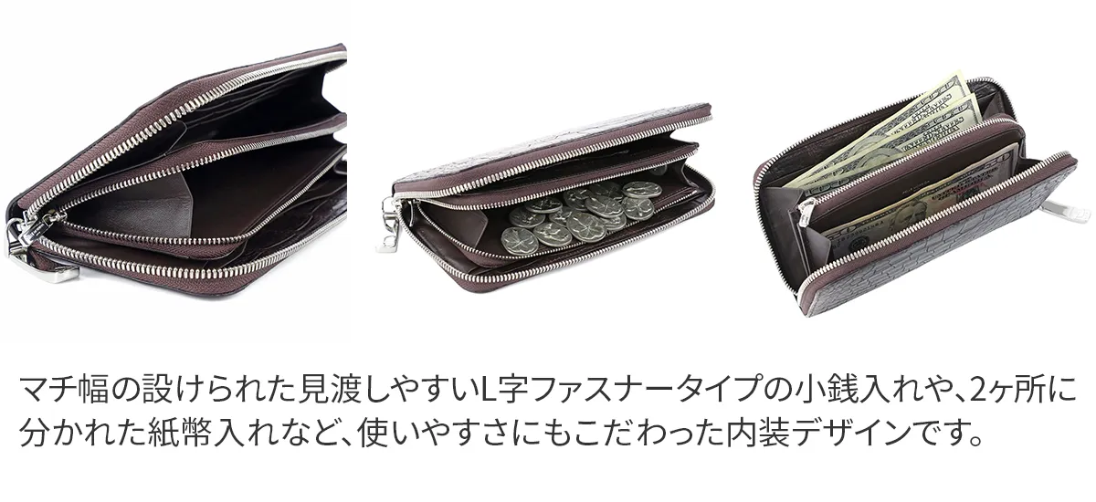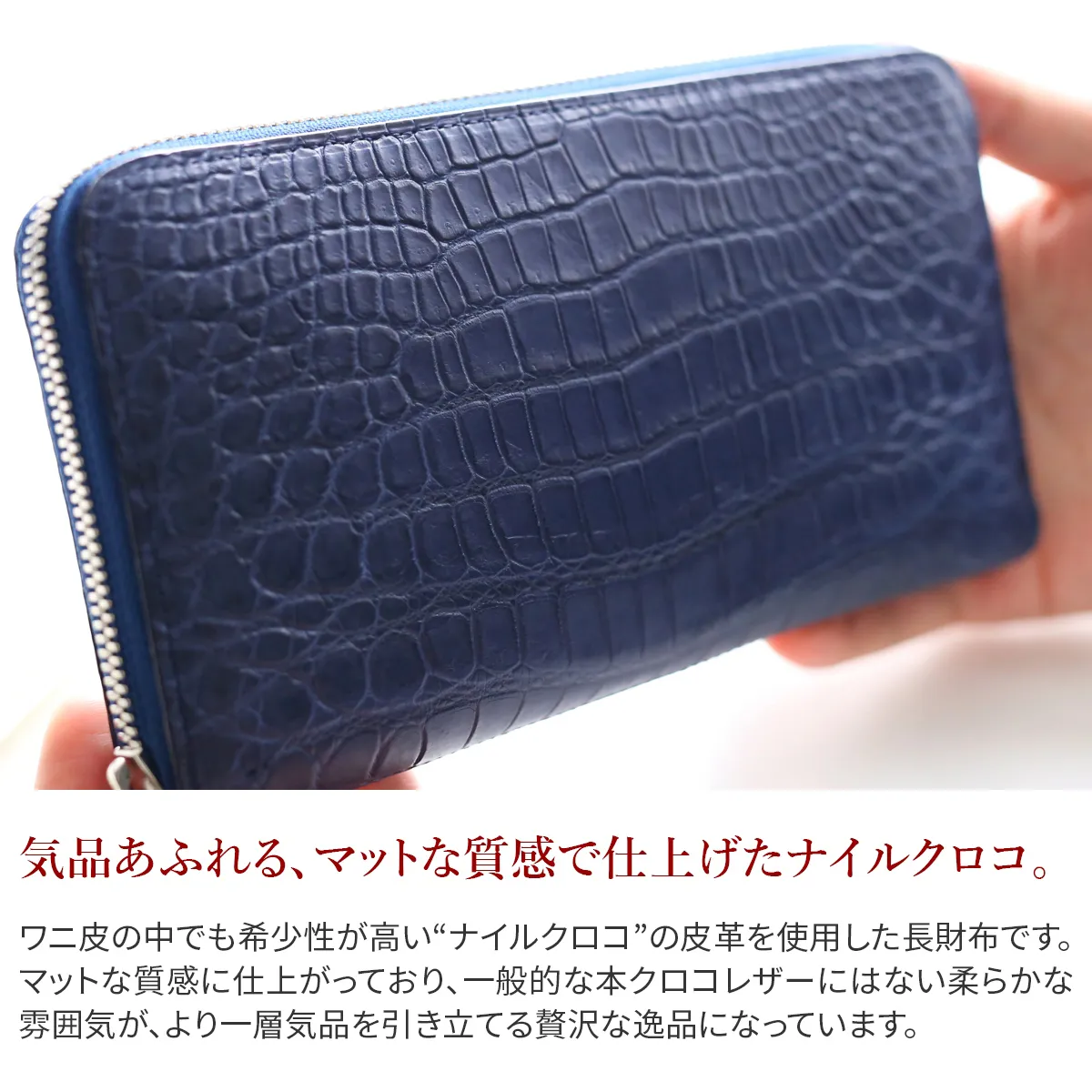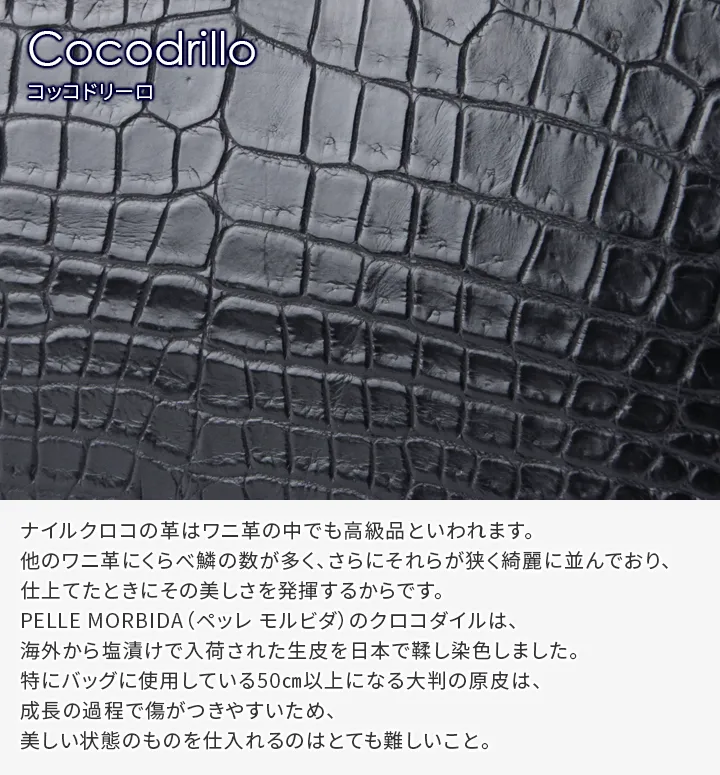 上質なナイルクロコレザーを贅沢に使用した、ラグジュアリーライン。高級感のある上品なカラーと、やさしい光を放つマット調の仕上げが優美さを醸し出します。 もちろん収納力も優れており、紙幣や小銭、カードや通帳サイズまでこれ一つでスマートに収納できます。 デザインと機能性を兼ね備えた申し分のないラウンドジップ長財布です。 ナイルクロコの革はワニ革の中でも高級品といわれいます。他のワニ革にくらべ鱗の数が多く、さらにそれらが狭く綺麗に並んでおり、仕立てたときにその美しさを発揮するからです。 PELLE MORBIDAのクロコダイルは、海外から塩漬けで入荷された生皮を日本で鞣し染色されています。仕上げは上品なマット仕上げでソフトに加工し柔らかな雰囲気を演出しています。