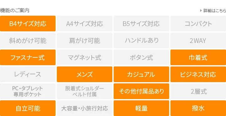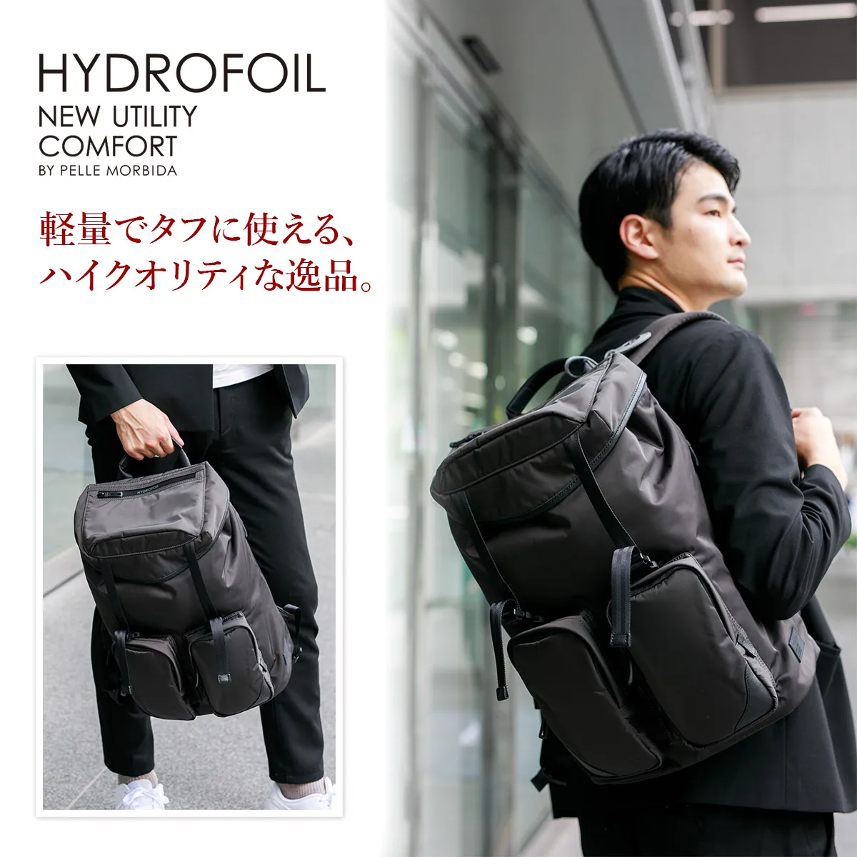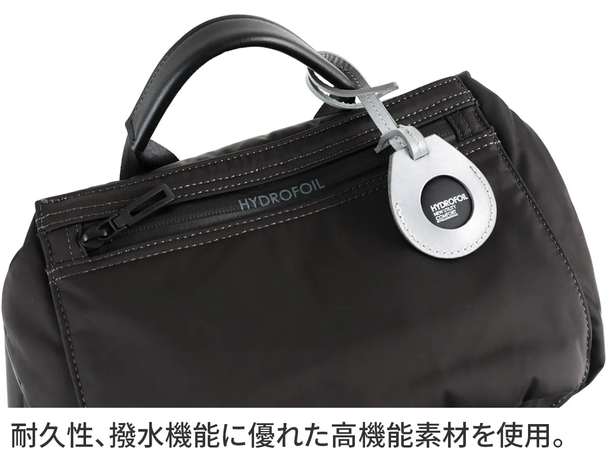 Hydrofoil HYDROFOIL は(ハイドロフォイル)は、船底下部に飛行機の翼に似た水中翼をもつ船のことです。 水流に対する抵抗を揚力に結びつけ、船全体が水面上に浮かび上がり、スピードを増して進んでいきます。 伊ナポリからカプリ島へ渡るときにもこの水中翼船は使われており、多くの人々を楽しませています。 このコレクションはこの美しく海を飛ぶHYDROFOIL の名にちなみ、これまでのラグジュアリーな雰囲気に加え、効率的で機能性や利便性を追求しています。 ≪素材の特性≫ 通常のポリエステルとは異なるPTT 繊維(ポロトリメチレンテレフタレート繊維)である「SOLOTEX(R)(ソロテックス)」原糸を使用している高機能素材。 形態安定性に優れており復元力がある為シワになりにくい、柔らかいのに型崩れしにくいという特徴をもっています。 さらに、耐久性、撥水機能も備わっておりタフさも完備しています。 用途は多岐にわたり、その上品な質感と耐久性、撥水機能からアウトドアのギアやスポーツメーカーのウェアなどでも使われるほどです。 シワになりにくく型崩れしにくい、高性能素材を採用したアイテムです。 正面の立体ポケットは存在感がありアクセントになります。 開口部は巾着仕様で、その上をフラップで覆うデザインです。 サイドには内部につながるファスナーがあるためモノの出し入れがスムーズに行えます。