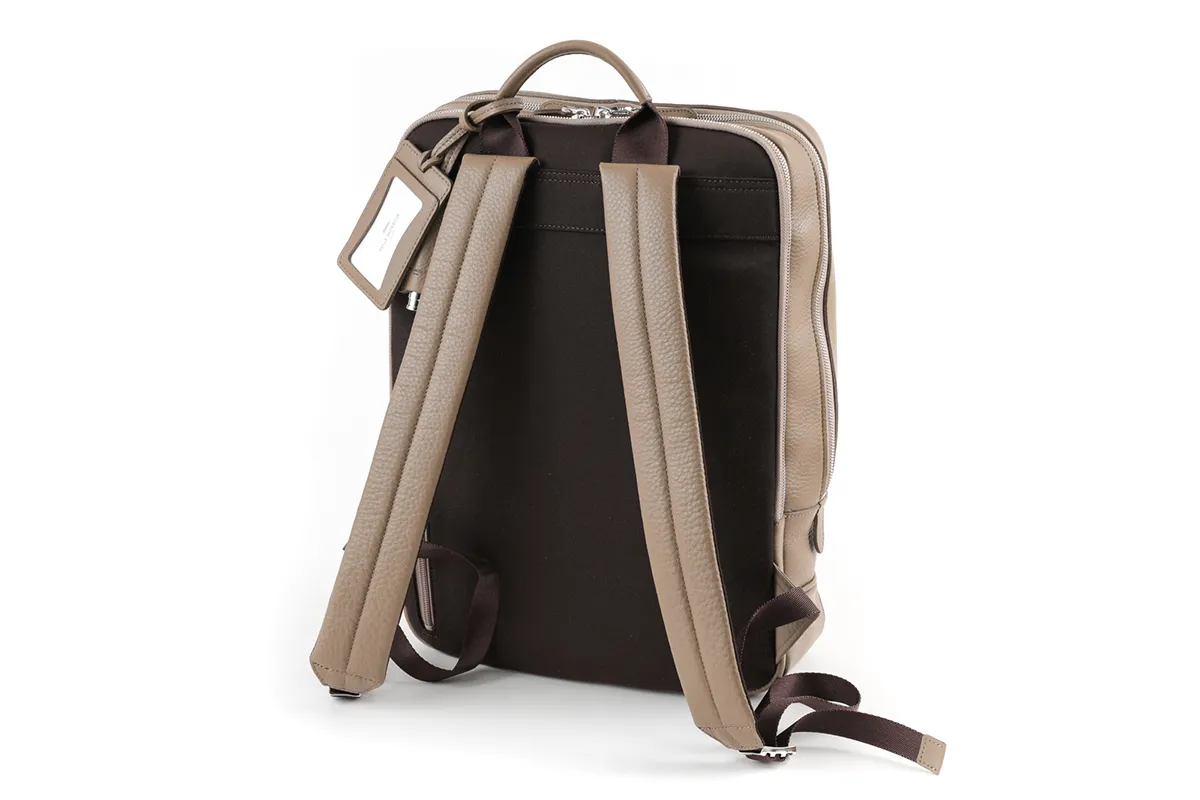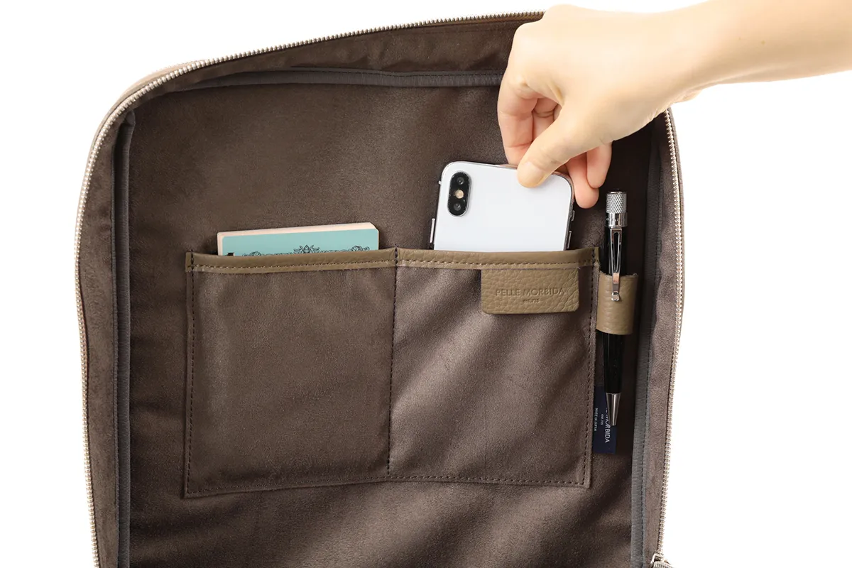 使い勝手の良い2室タイプのビジネスバックパックです。メインの収納は、書類や小物類が十分に入るオープンスペースになっています。背中側の内装はPCポケット付きでガジェットアイテムを安心して収納していただけます。 オリジナルのレシピで開発された、ペッレモルビダの代名詞とも言える上質なシュリンクレザーを贅沢に使用。柔らかなレザーだからこそ、程よく身体へフィットしてくれるほか、耐擦傷性を備えたこだわりの素材です。