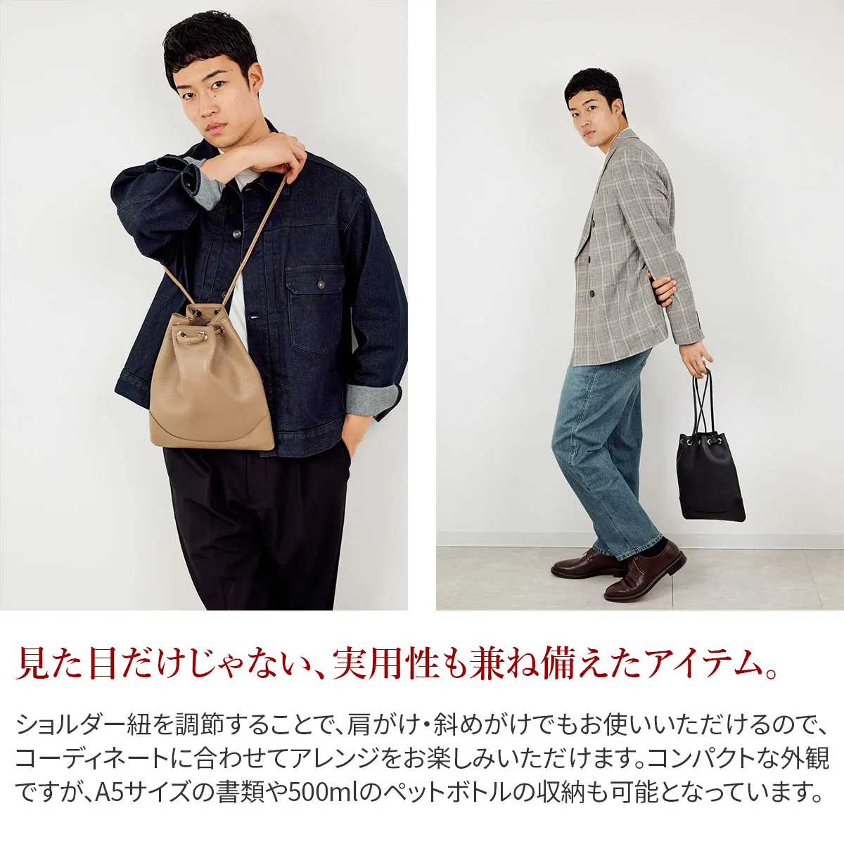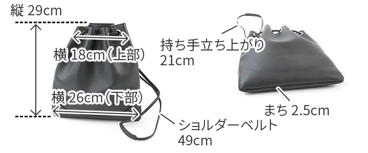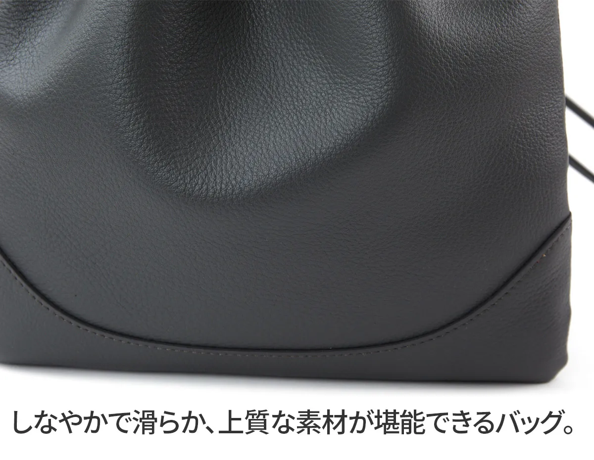 皮革生産地である姫路松原地区で開発したやわらかなシュリンクレザー。 丹念に下地を鞣し、乾燥後にさらに専用のマシーンでバタ振りをすることで上品で味のあるシボ立ちを実現させました。 カラーリングは下地の段階からカラーごとに芯通し(革の中まで染める)する技法で、色の魅力を最大限に引き出しています。 乾燥後、軽くアイロンがけを施し、表面の艶を調整しています。 日本の革職人ならではの勘と知恵と技術を駆使し、約40日かけて作られた革素材を使用しています。 内装はマイクロライトスエードで心地よい肌触りに。スーパーホワイト加工によって輝く金具がアクセントになっています。 コーディネートのポイントになる、デザイン性の効いた巾着バッグです。 見た目以上の収納力があり、パーティーシーン等でも活躍します。 ショルダー紐をスライドさせることで、簡単にスタイルチェンジができ、 スタイルや気分に合わせてアレンジをお楽しみいただけます。