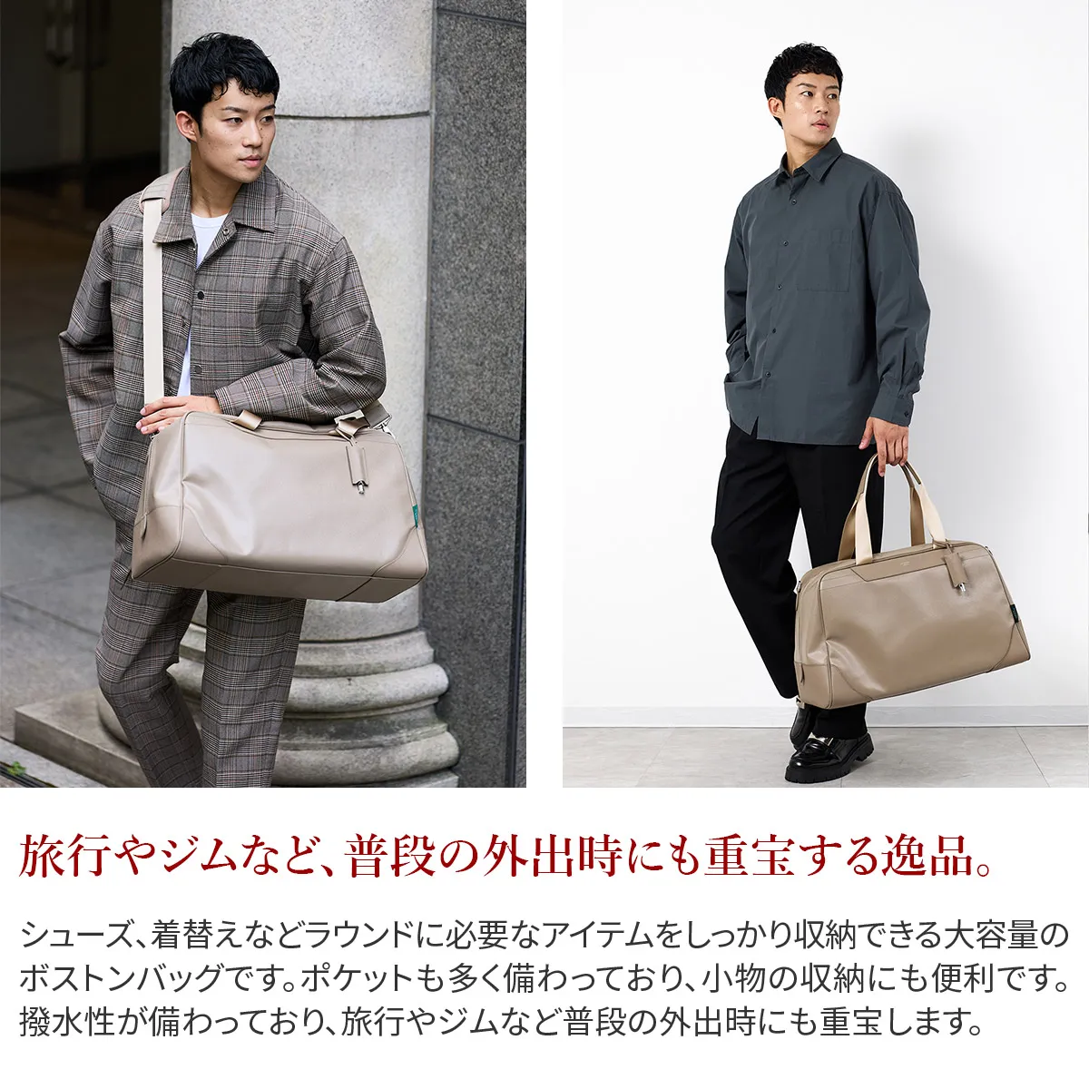 シューズ、着替えなどラウンドに必要なアイテムをしっかり収納できる大容量のボストンバッグです。ポケットも多く備わっており、小物の収納にも便利です。撥水性が備わっており、旅行やジムなど普段の外出時にも重宝します。 メイン素材にはシャープな型押しを施した撥水性のあるPVC素材を使用しています。上質な雰囲気はさることながら、軽量かつ手入れもしやすい素材で利便性が高いのがポイントです。大人の優雅さと清潔感溢れるアイテムです。
