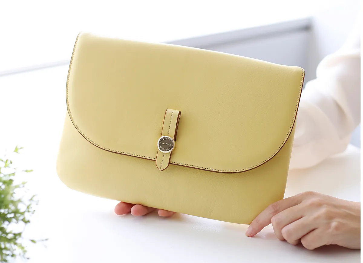パーティーやディナーデートなど、ちょっとした荷物を持って歩きたいシーンで活躍するのがミニバッグ。薄マチで柔らかいラインが特徴的なクラッチバッグに仕上がっています。貴重品などをまとめ、バッグインバッグとしてもお使い頂けます。クリーンな印象を与える優しく透明感のあるカラーが上品な華やかさをプラスします。 VELA(ヴェーラ)=イタリア語で「帆」を意味する、張り出しと膨らみのコントラストが美しいネオクラシックなデザインのライン。皮革生産地である姫路松原地区の牛革に、細やかなシボ型を押した上質なシュリンク風レザー。マットな質感をベースに、ほどよい光沢感を持たせ女性らしい色気を醸し出し、飽きのこない仕上がりに仕上げました。