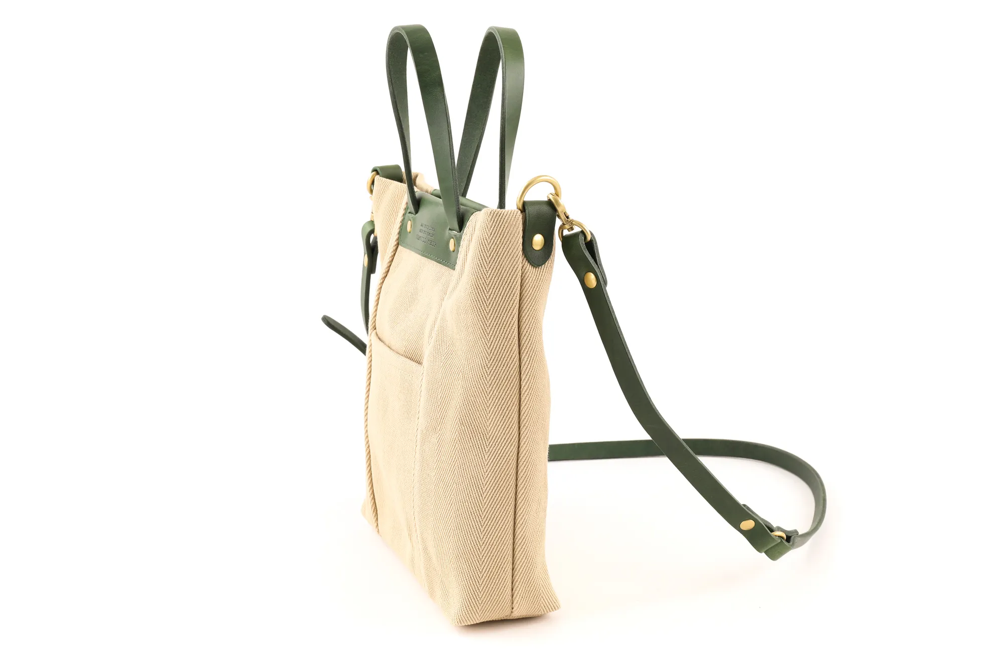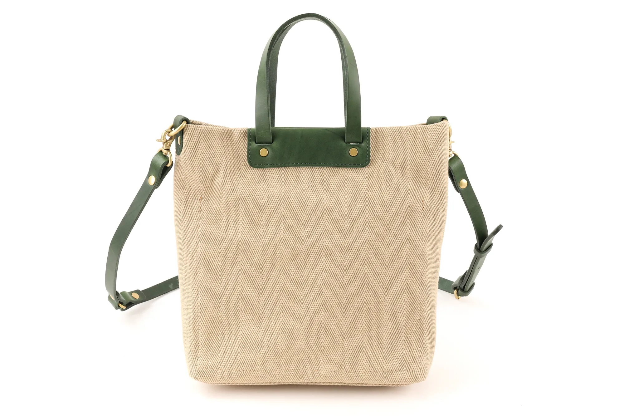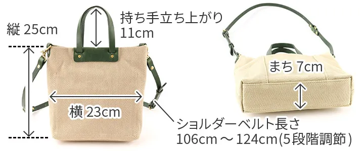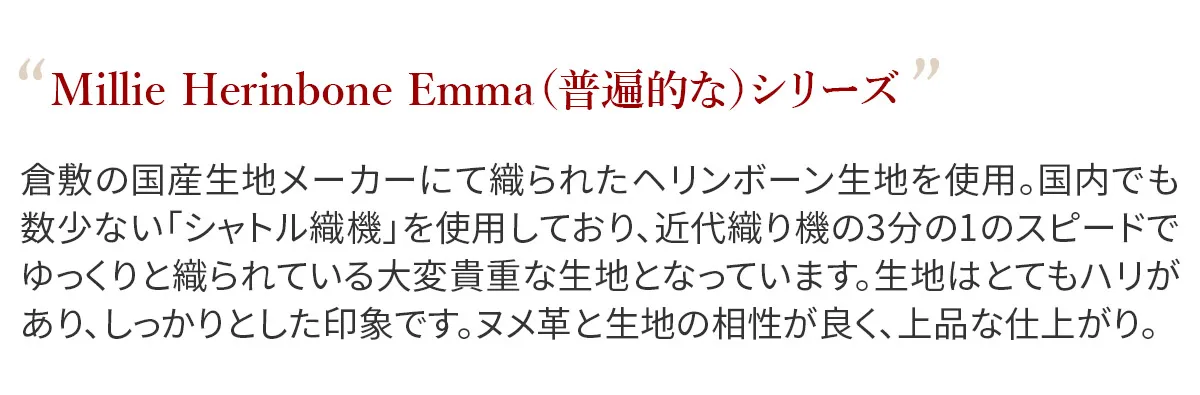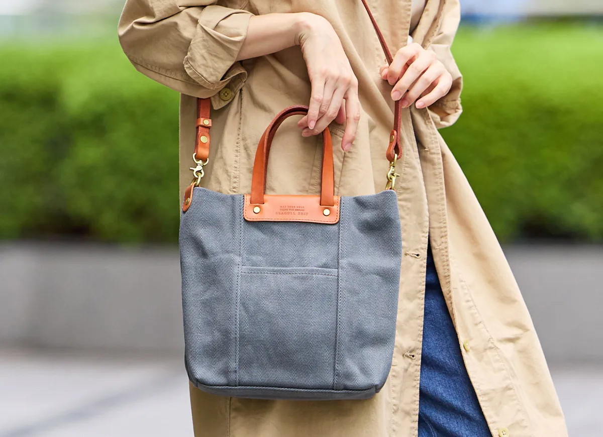 倉敷の国産生地メーカーにて織られたヘリンボーン柄の生地を使用しています。 今や国内でも少数しか存在しないシャトル織機で、通常の近代織り機の三分の一のスピードでゆっくりと織られている大変貴重な生地となっています。 織り上がった生地を精錬(せいれん)と呼ばれる洗いを施し、次にロウのプールに漬け、高熱のドラムに通し乾燥させた後、再度、ロウのプールに漬け、高熱のドラムに通します。 この段階では生地表面にモアレが生じる為、次に、ジーンズ加工で世界的に有名な生産地である岡山の児島で第三次加工の洗い加工を施しています。 これらの工程を経て、糸の目が詰まると同時にモアレの無い、大変綺麗なヘリンボーン柄の生地へと仕上がります。 生地の雰囲気は厚みとコシがあり、長くご愛用いただけます。 A5サイズに対応した大きさのミニトートバッグになります。取り外しが可能なショルダーベルトが付属した2way仕様です。600mlのペットボトルも収納していただけるので、ワンマイルのお出かけにも快適にお持ちいただけます。スマートなフォルムですので、斜めがけの持ち方でもカジュアルになり過ぎず上品な印象です。厚みのある生地と革のコンビネーションも好相性で、大人カジュアルなスタイルにマッチする逸品です。