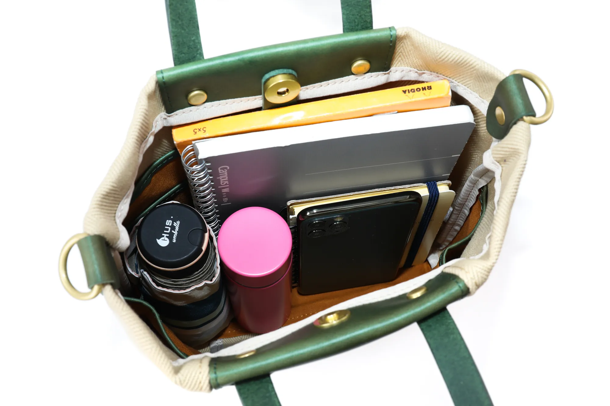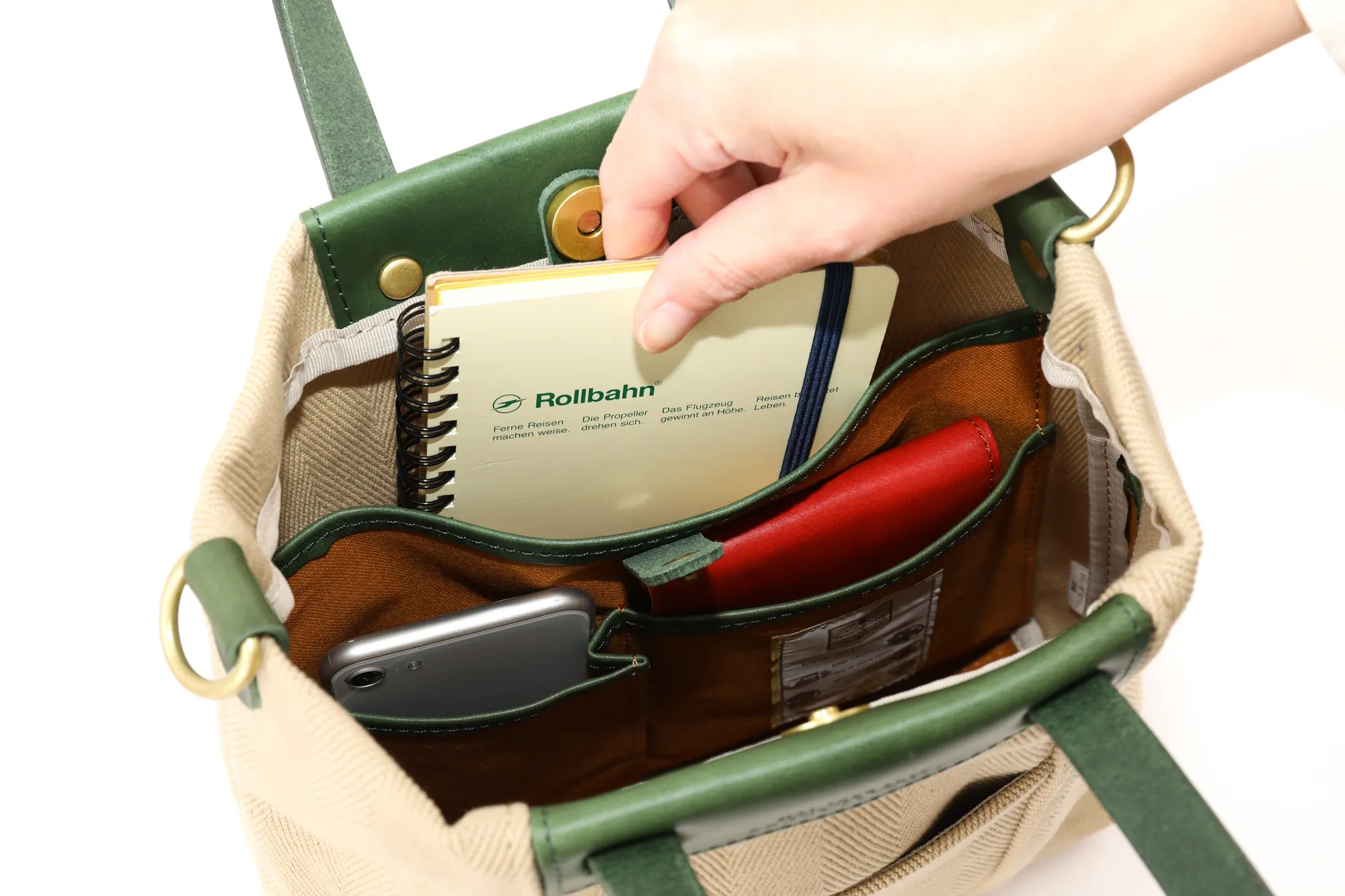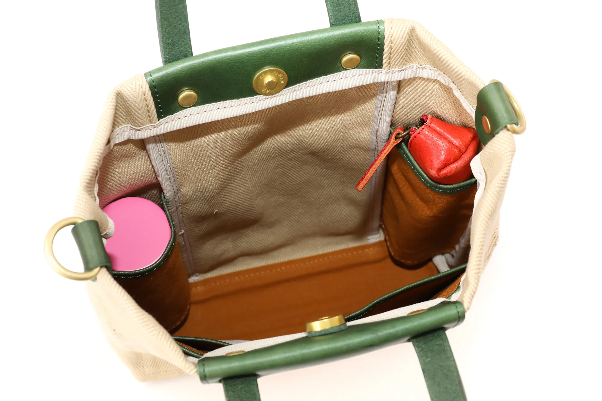 倉敷の国産生地メーカーにて織られたヘリンボーン柄の生地を使用しています。 今や国内でも少数しか存在しないシャトル織機で、通常の近代織り機の三分の一のスピードでゆっくりと織られている大変貴重な生地となっています。 織り上がった生地を精錬(せいれん)と呼ばれる洗いを施し、次にロウのプールに漬け、高熱のドラムに通し乾燥させた後、再度、ロウのプールに漬け、高熱のドラムに通します。 この段階では生地表面にモアレが生じる為、次に、ジーンズ加工で世界的に有名な生産地である岡山の児島で第三次加工の洗い加工を施しています。 これらの工程を経て、糸の目が詰まると同時にモアレの無い、大変綺麗なヘリンボーン柄の生地へと仕上がります。 生地の雰囲気は厚みとコシがあり、長くご愛用いただけます。 A5サイズに対応した大きさのミニトートバッグになります。取り外しが可能なショルダーベルトが付属した2way仕様です。600mlのペットボトルも収納していただけるので、ワンマイルのお出かけにも快適にお持ちいただけます。スマートなフォルムですので、斜めがけの持ち方でもカジュアルになり過ぎず上品な印象です。厚みのある生地と革のコンビネーションも好相性で、大人カジュアルなスタイルにマッチする逸品です。