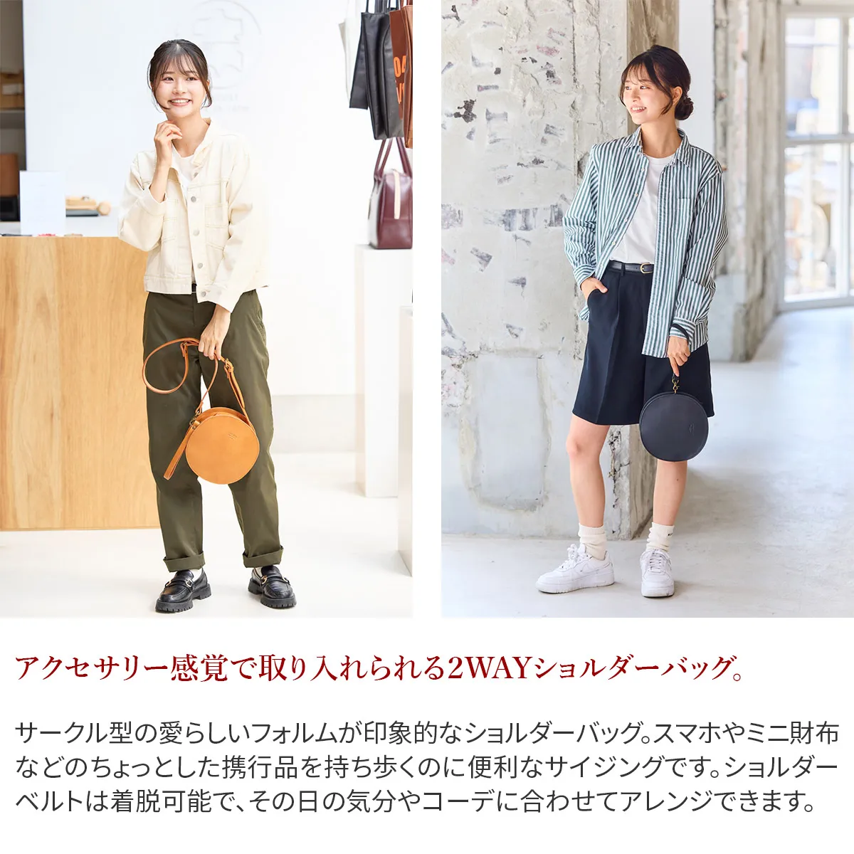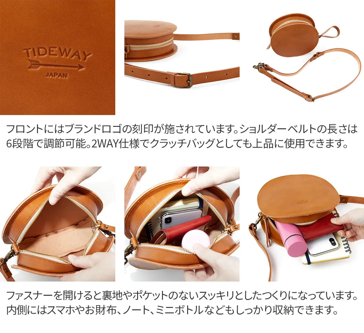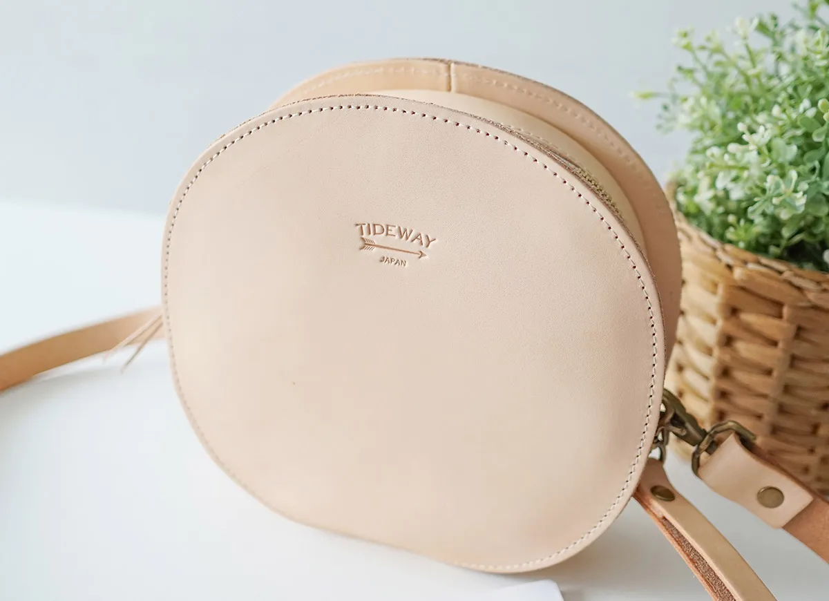 高級感のある厚口ヌメ革(タンニン鞣しを使用しただけの染色・塗装がされていない革)を使用し高い強度と長く使うほど馴染んでくるという革本来の魅力を併せ持っています。 ※カラー「NUME」は染料を一切使用せず、革本来の色味で仕上げています。 使用前は薄いベージュ色(肌色/薄ピンク色等)をしていますが、日光や摩擦により革に元々含まれる油分が染み出す事によって徐々に色艶を増し、やがて飴色へと変化していきます。革の経年変化を楽しみたい方におすすめです。(水や傷に弱いため、取り扱いにはご注意下さい。) 立体感のある丸いフォルムがアイキャッチなサークルバッグです。着脱可能なショルダーベルトは110cm~124cmまで6段階で長さ調節が可能。 ストラップも付属しており、クラッチバッグのようにお持ちいただくのもおすすめです。その日の装いやシーンに合わせて持ち方を自在に楽しめるのも嬉しいポイント。コーデのアクセントになり、アクセサリー感覚としても活躍してくれるアイテムです。