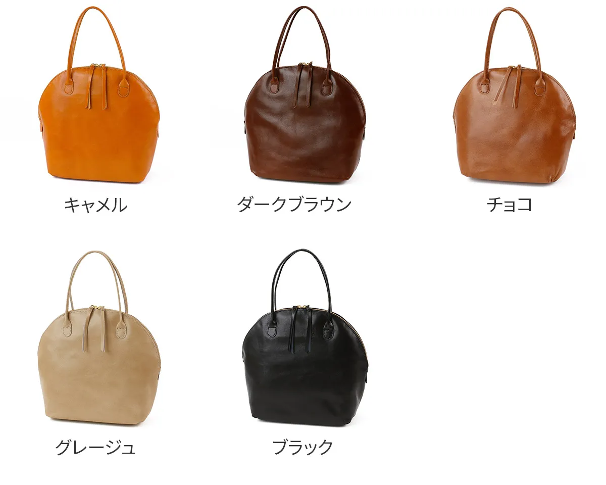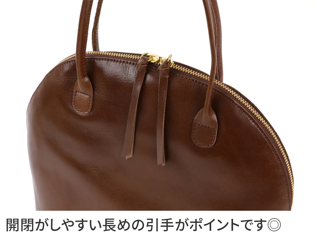独特の製法で手染めのアンティーク加工をし、強さとしなやかさを兼ね備えています。 コロンとした可愛らしいシルエットが目を引くボストンバッグです。丸みを帯びたフォルムと華奢なハンドルの対比がバランスよく、大人のこなれ感を演出してくれます。口元にはタブルファスナー式を採用し、デザイン性と開閉しやすさを両立しました。ややコンパクトですが、マチ幅を広めに設けることで見た目以上の収納力があります。キレイめにもカジュアルにも映えるデザインで、オンオフ両方お持ちいただけます。