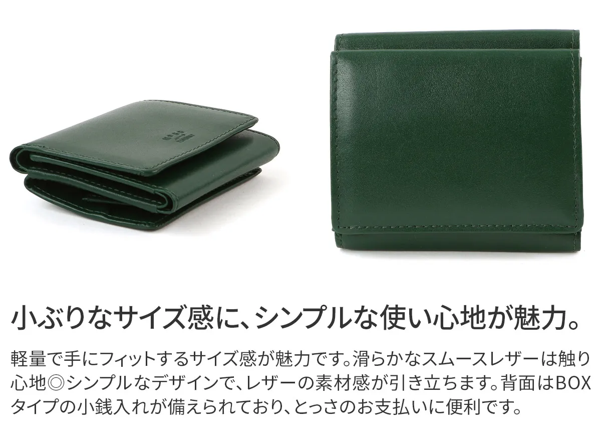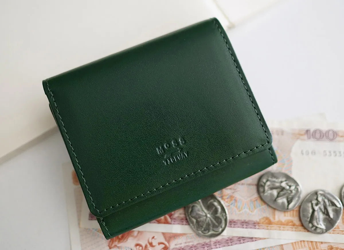TIDEWAYオリジナルレザーMOSS 独自のオイル調整により、厚みがありながらも柔らかくしなやかさを持ち合わせた革です。職人の手で革1枚ずつを揉みほぐし、より深いツヤ感に拘りました。 スタイリッシュで飽きの来ないデザインが特徴です。内部はカード入れが3ヶ所にお札入れが1ヶ所備えられいます。小銭入れは外部に備えられています。BOXタイプで視認性が良く、スムーズに取り出すことができます。 バッグに入れてもかさばりにくく、スマートにお持ちいただけます。