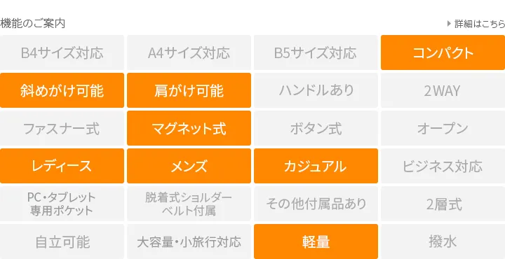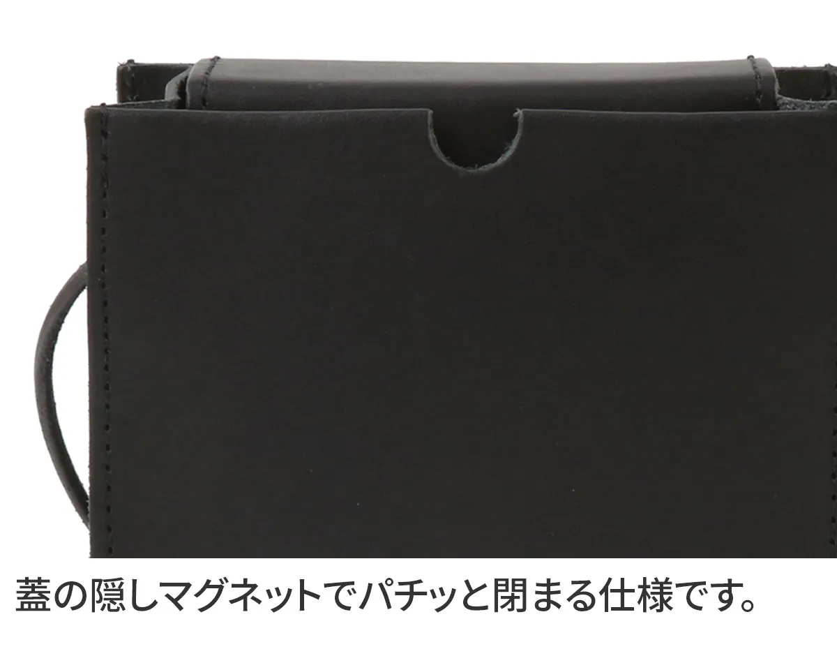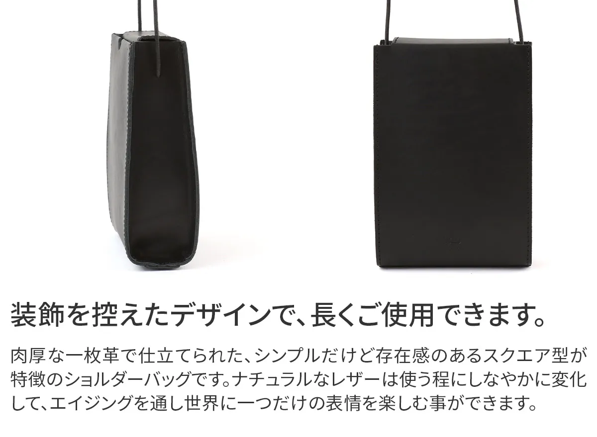 高級感のある厚口ヌメ革(タンニン鞣しを使用しただけの染色・塗装がされていない革)を使用し高い強度と長く使うほど馴染んでくるという革本来の魅力を併せ持っています。 ※カラー「NUME」は染料を一切使用せず、革本来の色味で仕上げています。 使用前は薄いベージュ色(肌色/薄ピンク色等)をしていますが、日光や摩擦により革に元々含まれる油分が染み出す事によって徐々に色艶を増し、やがて飴色へと変化していきます。革の経年変化を楽しみたい方におすすめです。(水や傷に弱いため、取り扱いにはご注意下さい。) レザーを一枚で仕立てた、ナチュラルな素材感が魅力のとっても軽いショルダーバッグです。メイン開口部は蓋の様な形状で、マグネットでカチッと閉まります。中が見えにくく、安全面でも安心です。内部はお出かけの必須アイテム、お財布やハンカチ、スマホなどをコンパクトに収納。ショルダー紐はお好きな位置で結び目を作ることで長さ調節ができ、斜め掛けや肩掛けでなどでお持ちいただけます。