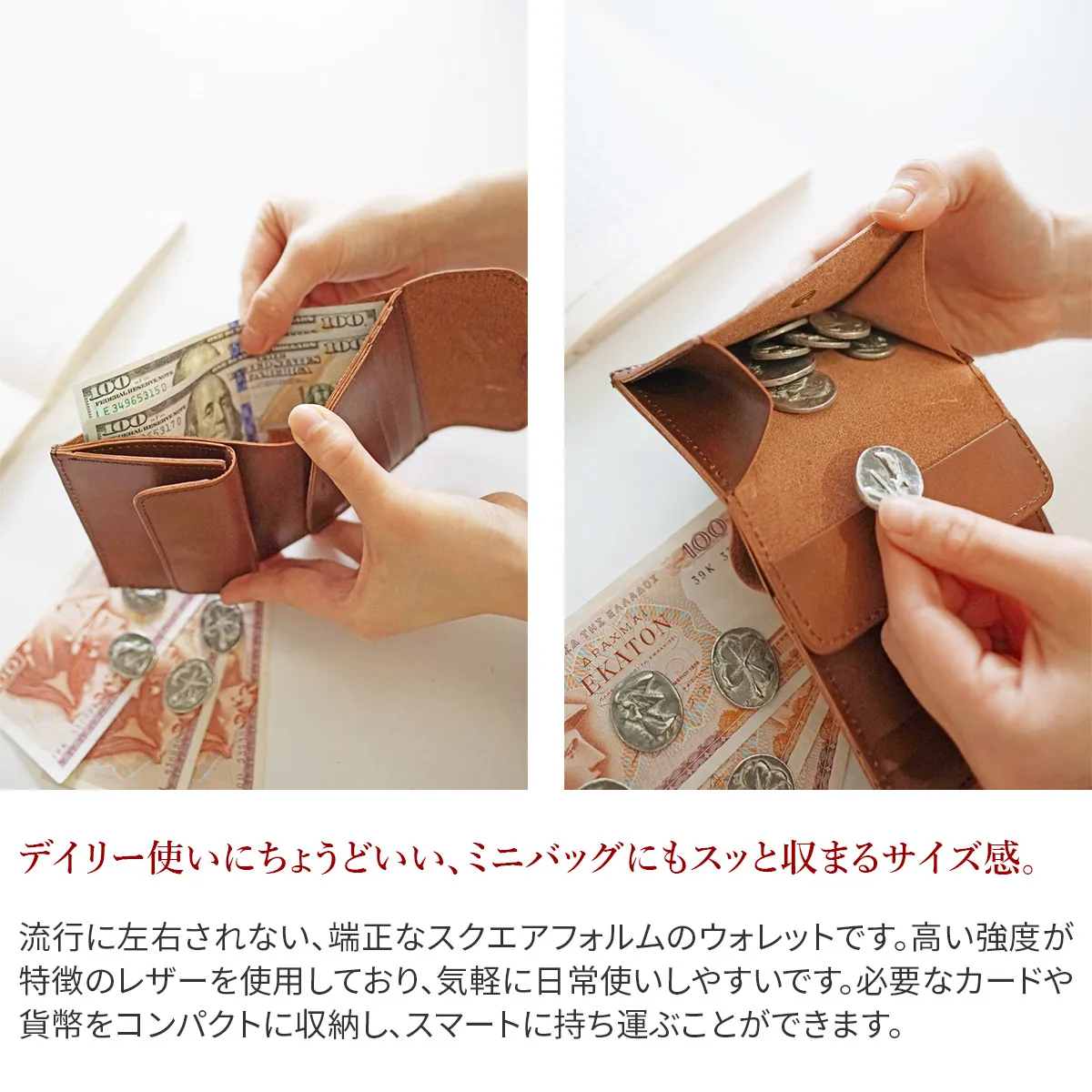 高級感のある厚口ヌメ革(タンニン鞣しを使用しただけの染色・塗装がされていない革)を使用し高い強度と長く使うほど馴染んでくるという革本来の魅力を併せ持っています。 ※カラー「NUME」は染料を一切使用せず、革本来の色味で仕上げています。 使用前は薄いベージュ色(肌色/薄ピンク色等)をしていますが、日光や摩擦により革に元々含まれる油分が染み出す事によって徐々に色艶を増し、やがて飴色へと変化していきます。革の経年変化を楽しみたい方におすすめです。(水や傷に弱いため、取り扱いにはご注意下さい。) すっきりした端正なデザインで、男女問わずお使い頂けるNUMEシリーズ。スマートに持ち運びしやすいコンパクト設計のウォレットです。厳選したカードを5枚と、貨幣を収納できます。中身を把握しやすく、スムーズにお支払いが可能。使う程にヌメ革のエイジング過程を楽しめます。