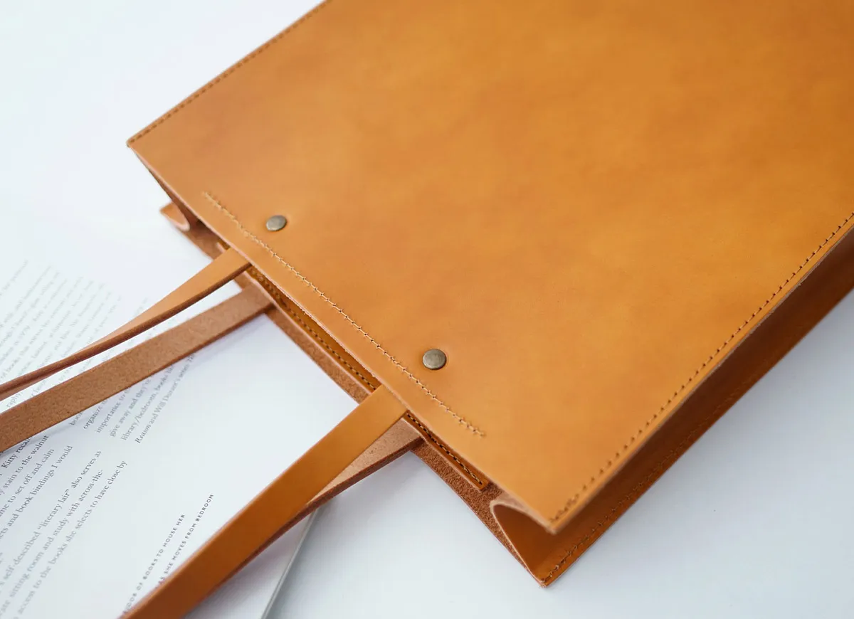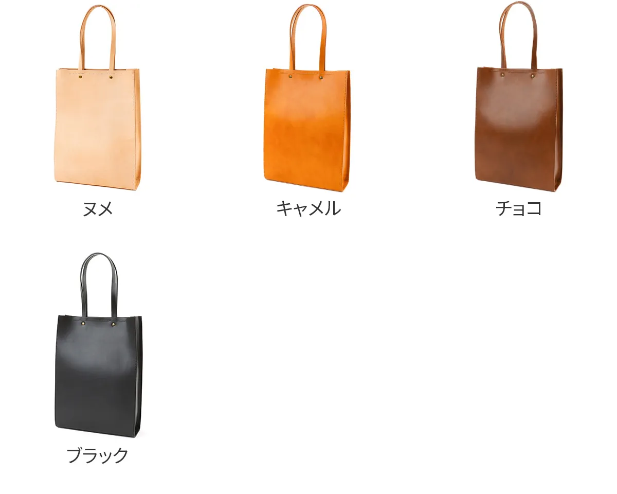 高級感のある厚口ヌメ革(タンニン鞣しを使用しただけの染色・塗装がされていない革)を使用し高い強度と長く使うほど馴染んでくるという革本来の魅力を併せ持っています。 ※カラー「NUME」は染料を一切使用せず、革本来の色味で仕上げています。 使用前は薄いベージュ色(肌色/薄ピンク色等)をしていますが、日光や摩擦により革に元々含まれる油分が染み出す事によって徐々に色艶を増し、やがて飴色へと変化していきます。革の経年変化を楽しみたい方におすすめです。(水や傷に弱いため、取り扱いにはご注意下さい。) 縦型の端正なルックスと、滑らかなスムースレザーが上品な印象のレザートートバッグ。ナチュラルな素材感で、レザーの色味をそのまま楽むことができる、一枚革の仕立てとなっています。内部は大きなポケットが2ヶ所とペン入れ用のポケットを完備。A4書類が楽に縦に収めることができます。