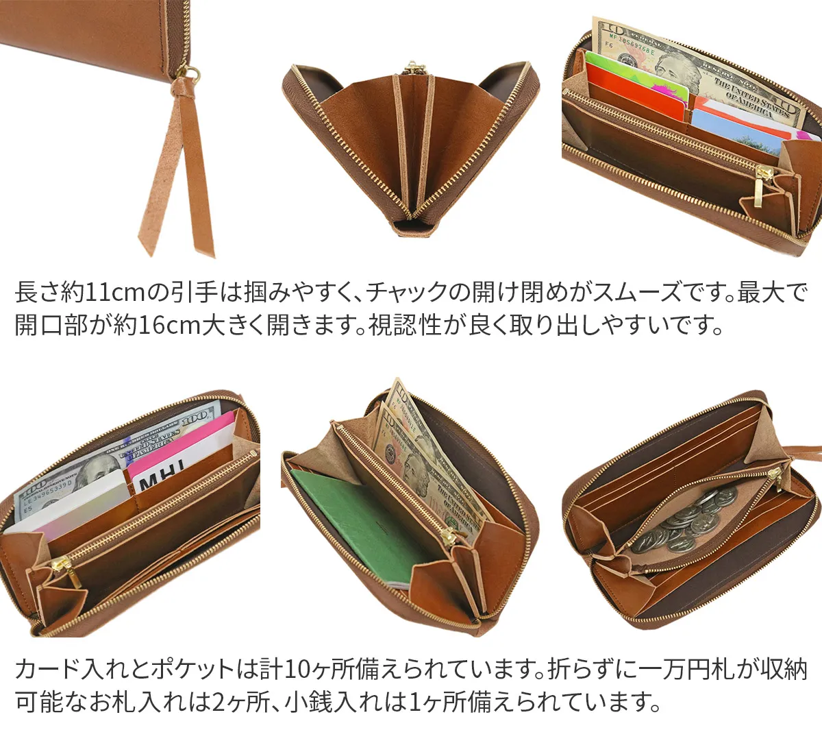 独自の製法で手染めのアンティーク加工を施し、強さとしなやかさを兼ね備えています。 滑らかなレザーが心地良く手にフィットします。スムーズに滑るラウンドファスナーを開けると、蛇腹状に大きく開口する内部は視認性抜群。内部はカード入れが8ヶ所、ポケットとお札入れが各2ヶ所ずつ、小銭入れが1ヶ所備えられおり通帳も収納可能です。綺麗なフォルムを保ちながら、スマートにお持ちいただけます。