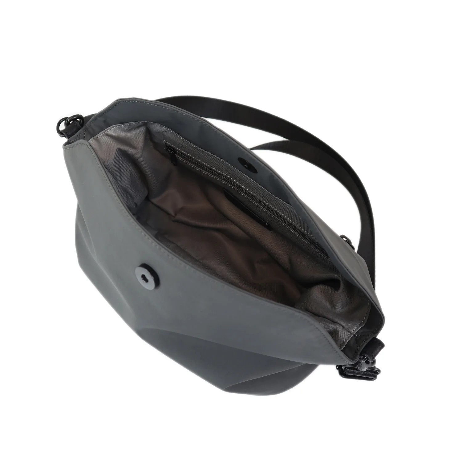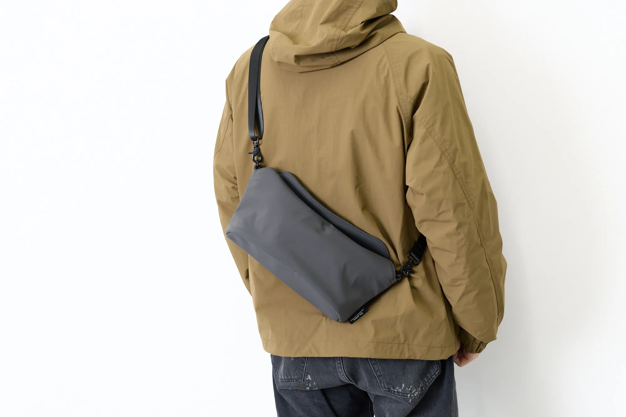 コンパクトミニマルハーフフラップショルダーです。ミニマルフェイス、こだわりのハー フフラップのデザインが特徴。コンパクトながら500mIペットボトル・長財布が同時 収納可能なスペックで実用的です。背面にはファスナーポケットを配置。