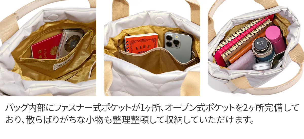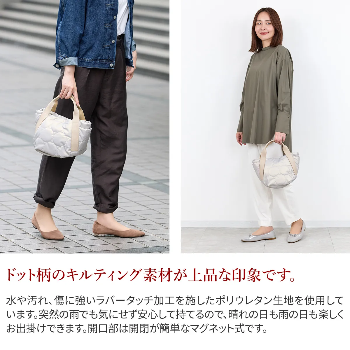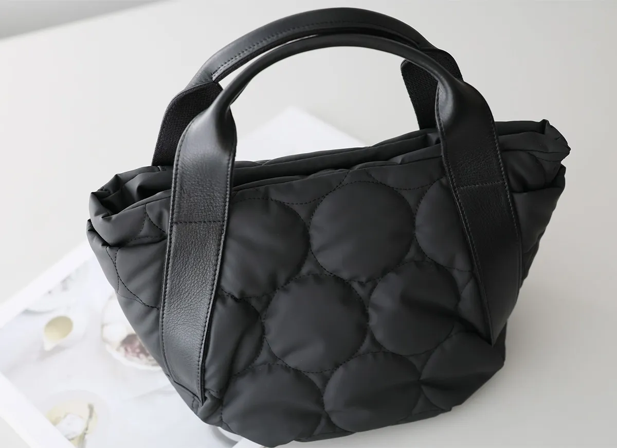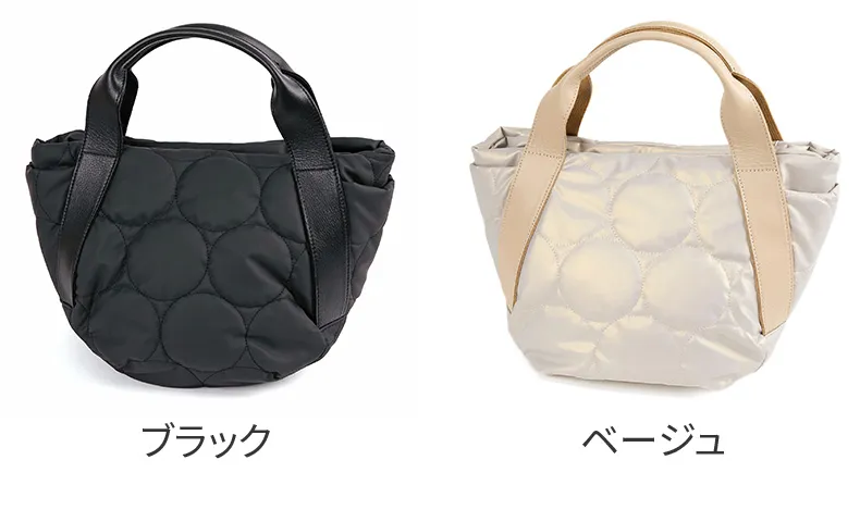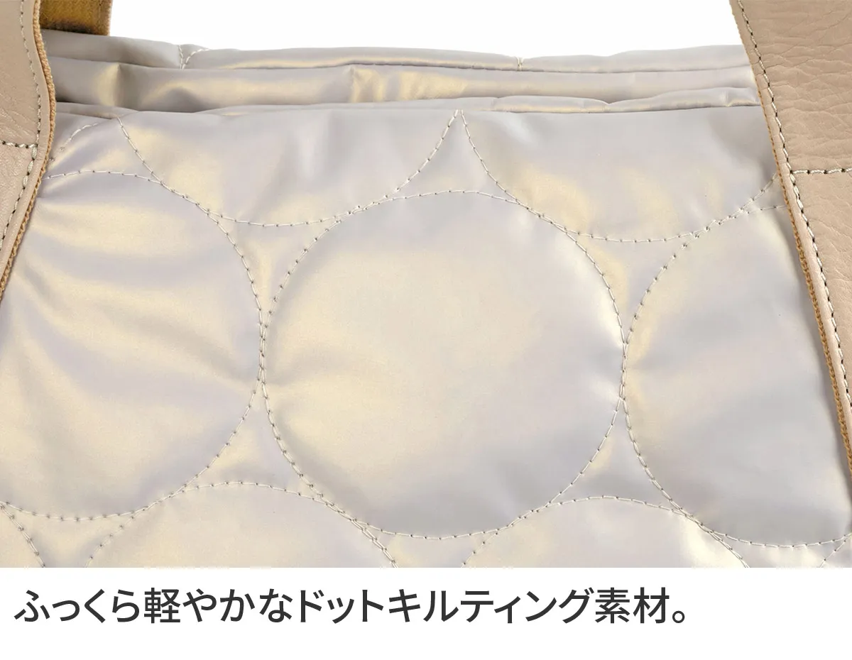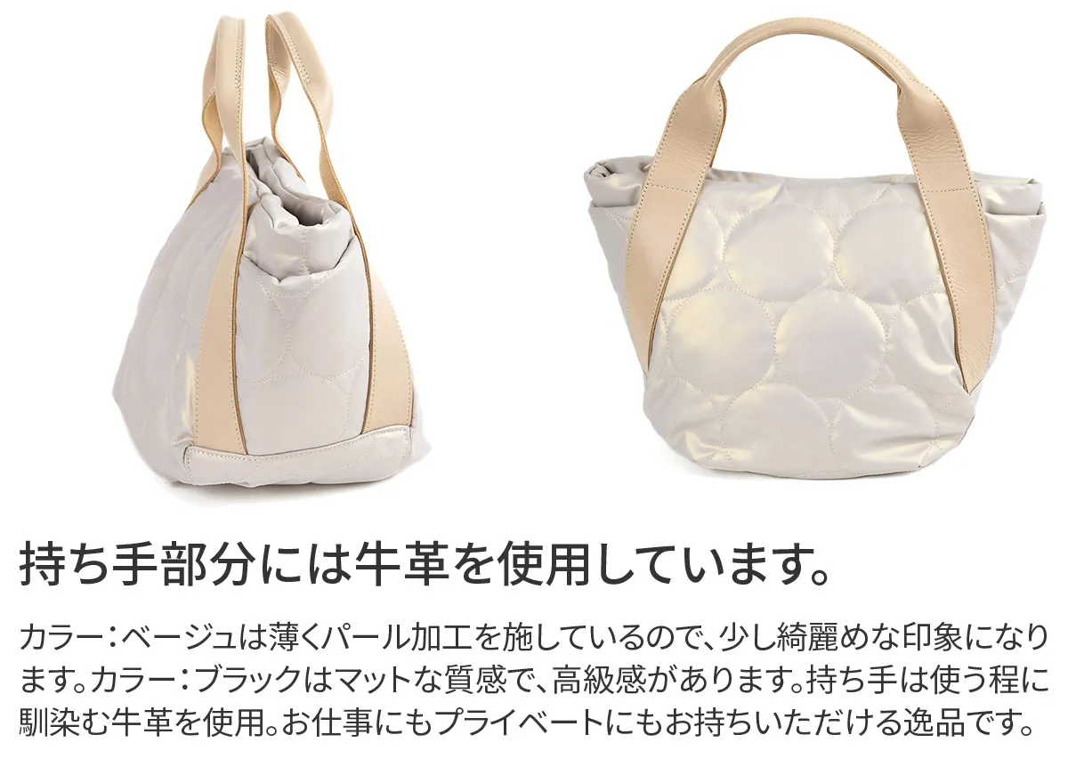 ふっくら軽やかなドットキルティングバッグシリーズ。 雨や汚れに強いラバータッチのポリウレタン生地を使用しています。 《素材の特性》 ・アルコール系や防水スプレー等の薬品を吹きかけると変色の恐れがあるので使用しないでください。 ・汚れた場合は乾いた柔らかい布か、水で濡らして強く絞ったもので、優しく拭くようにしてください。 ・状態により、色や質感など写真と多少異なる場合がございます。 ・模様の指定できません。予めご了承ください。 ・革の特性上、細かいキズ・しわ・点などが見られる場合がございますが、不良品ではございません。 マットな質感で大きめのドットステッチが目を惹く手さげバッグ。 太マチなので、お出かけに必要なものをたくさん収納できます。 持ち手部分は、牛革を使用しているため、カジュアルと上品を兼ね備えた逸品です。
