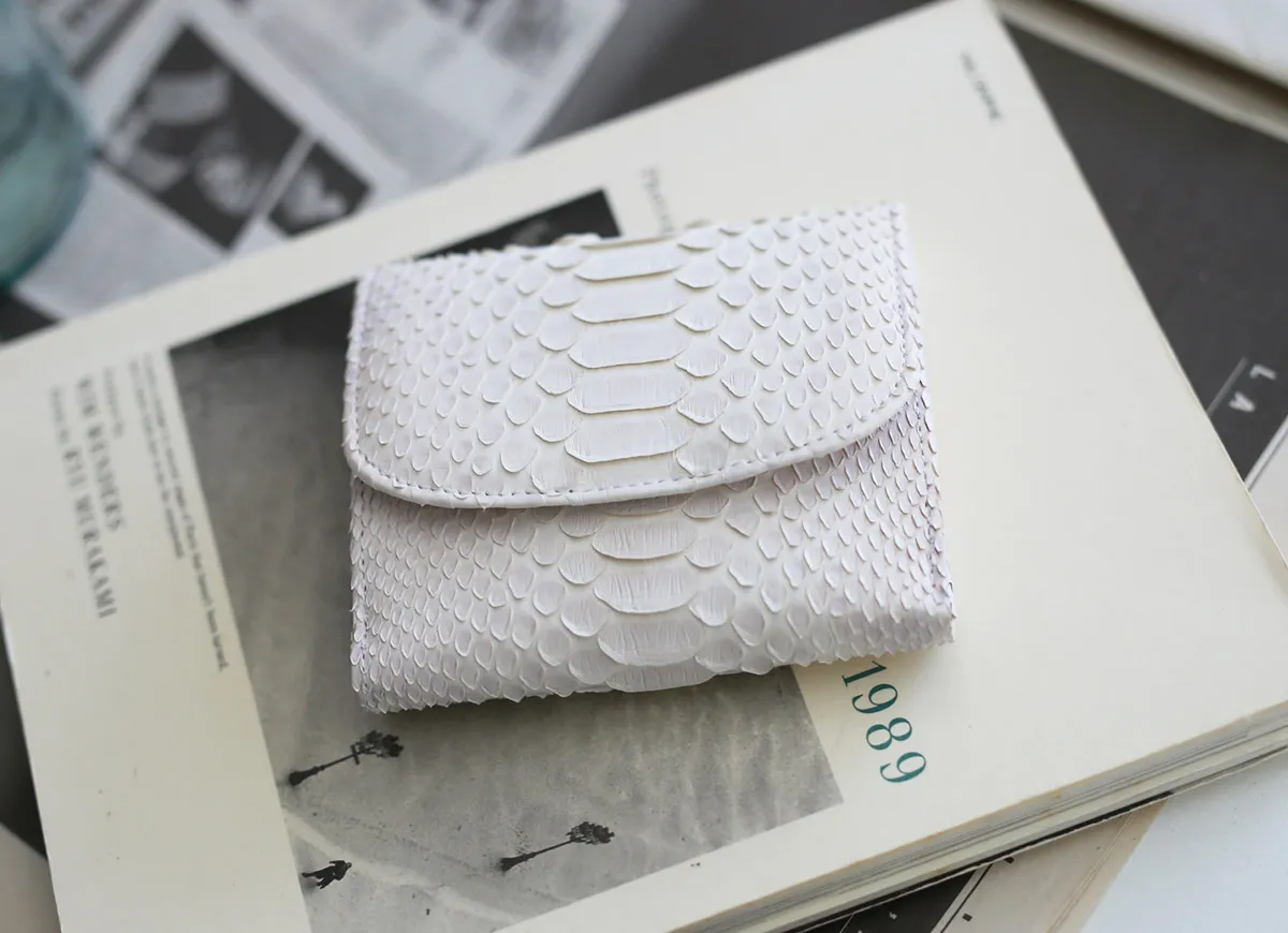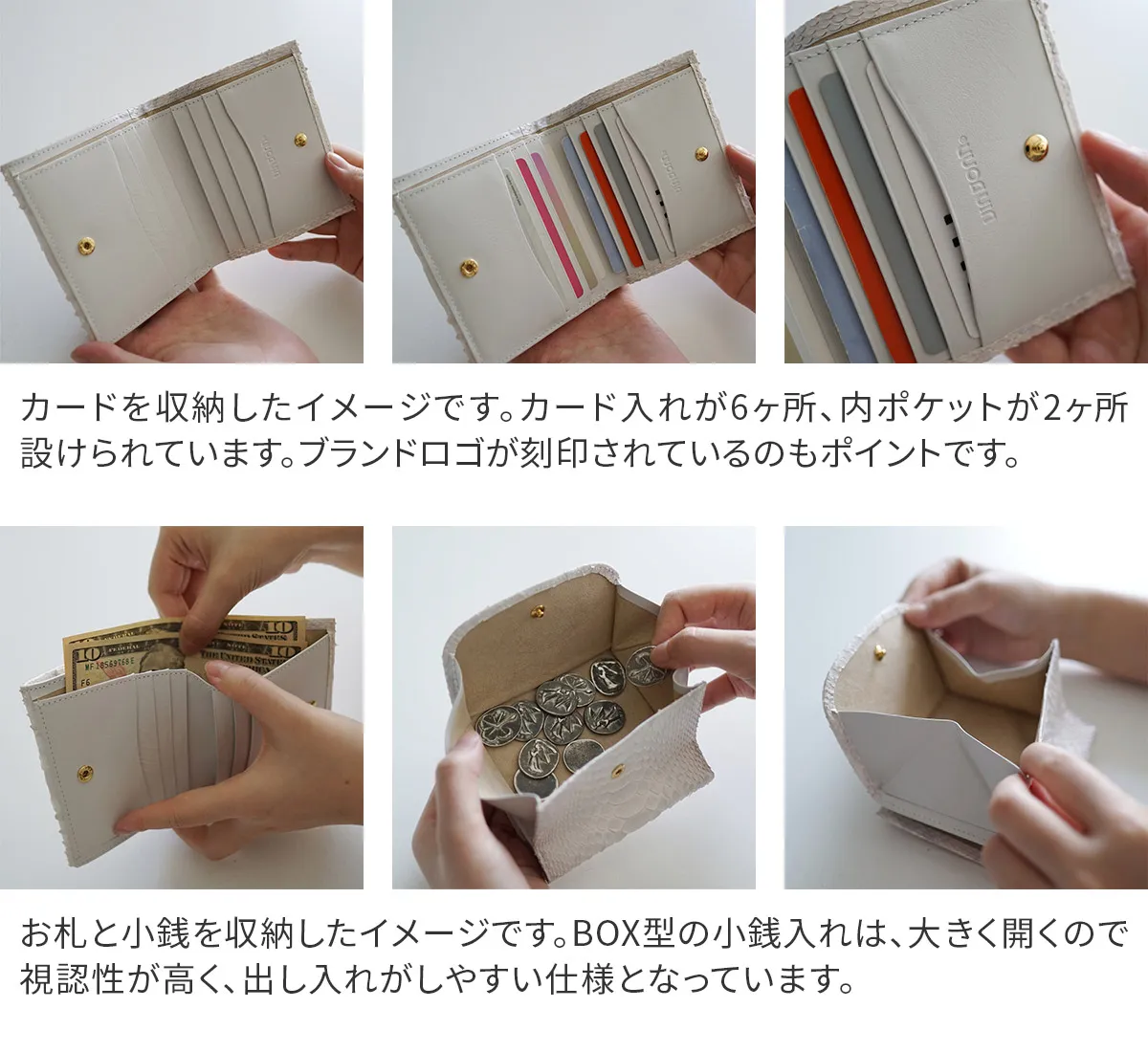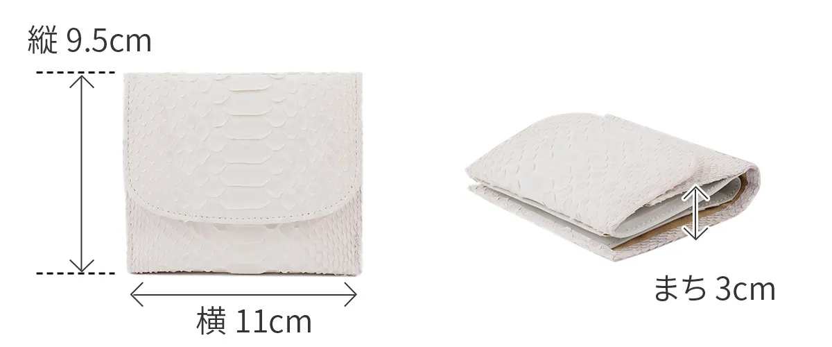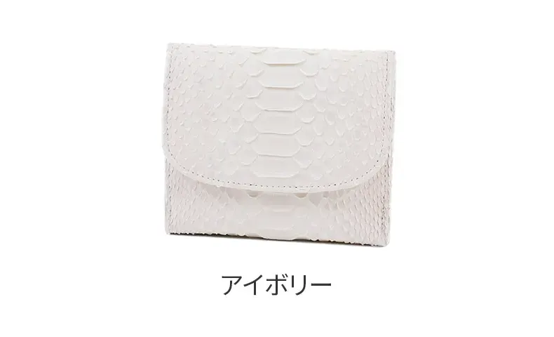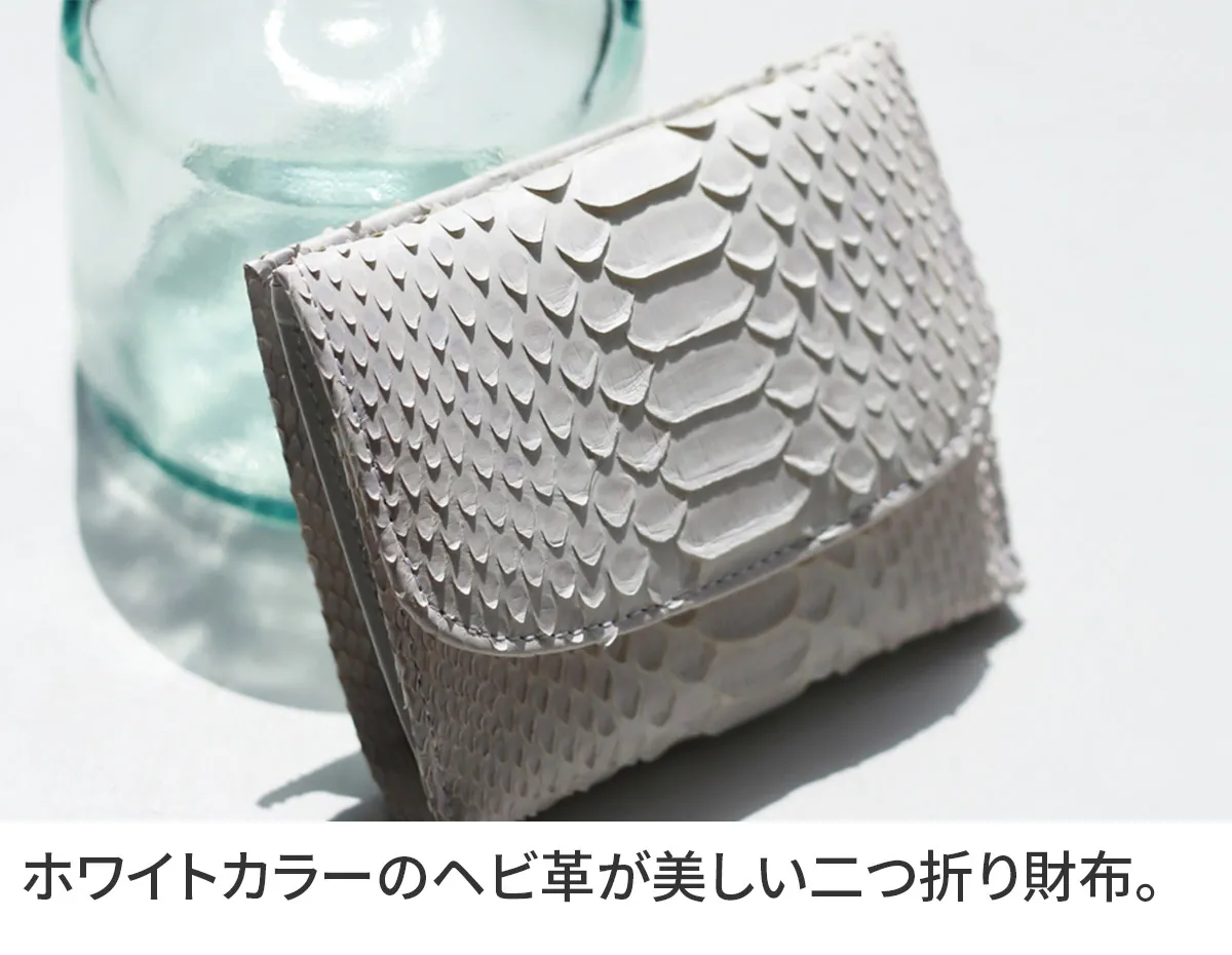 清楚で優しいホワイトカラーのパイソンにヘビ革本来の柄の濃淡をほのかに残したフェミニンなお財布シリーズ。 天然のパイソンの模様を薄く残した、ホワイトカラーが美しい二つ折り財布。 コンパクトながら、紙幣・カード・小銭をスマートに収納できます。 小銭入れもBOX型になっているので視認性が高く、使い心地の良いアイテムです。