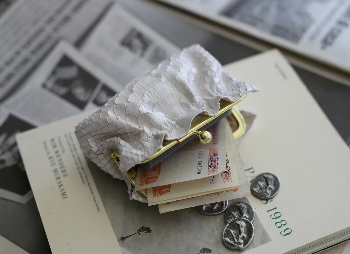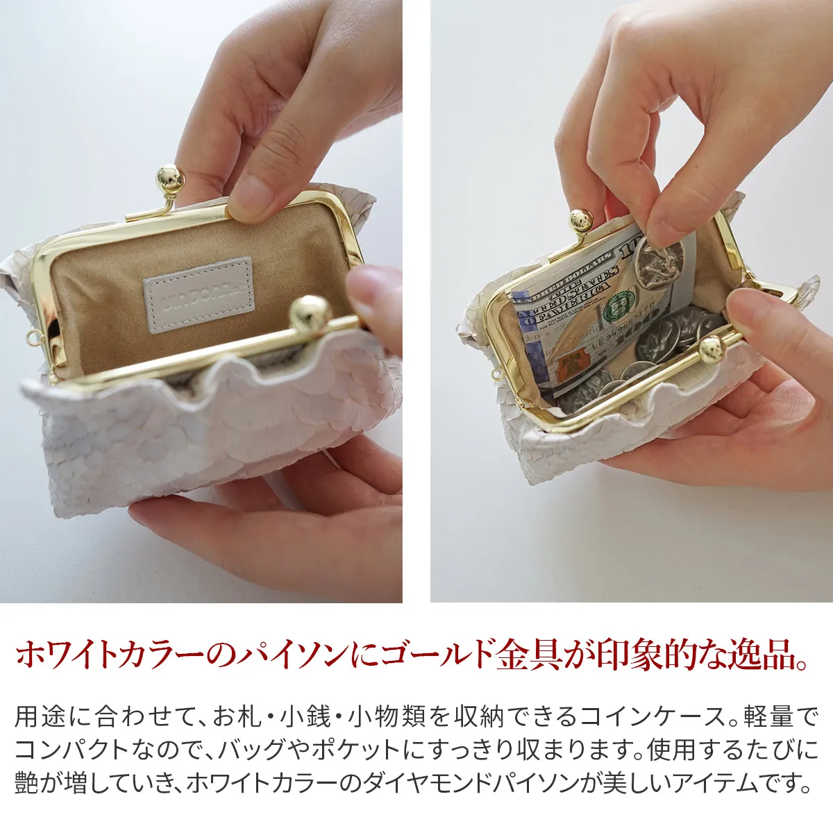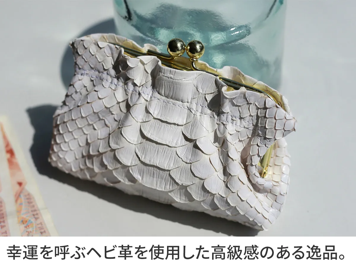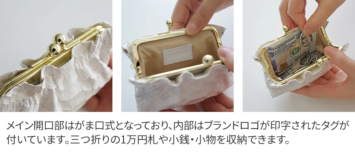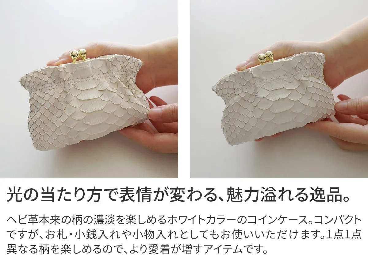清楚で優しいホワイトカラーのパイソンにヘビ革本来の柄の濃淡をほのかに残したフェミニンなお財布シリーズ。 天然のパイソンの模様を薄く残した、ホワイトカラーが美しいコインケース。 コンパクトなサイズ感で、ちょっとした外出に重宝します。 三つ折りにした1万円札・小銭・カードが収納でき、小物入れとしてもお使いいただけるアイテムです。