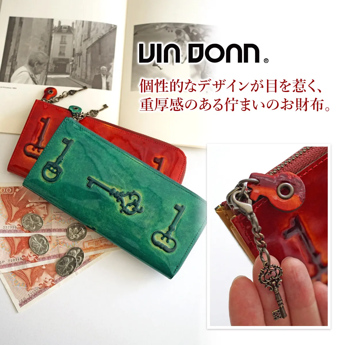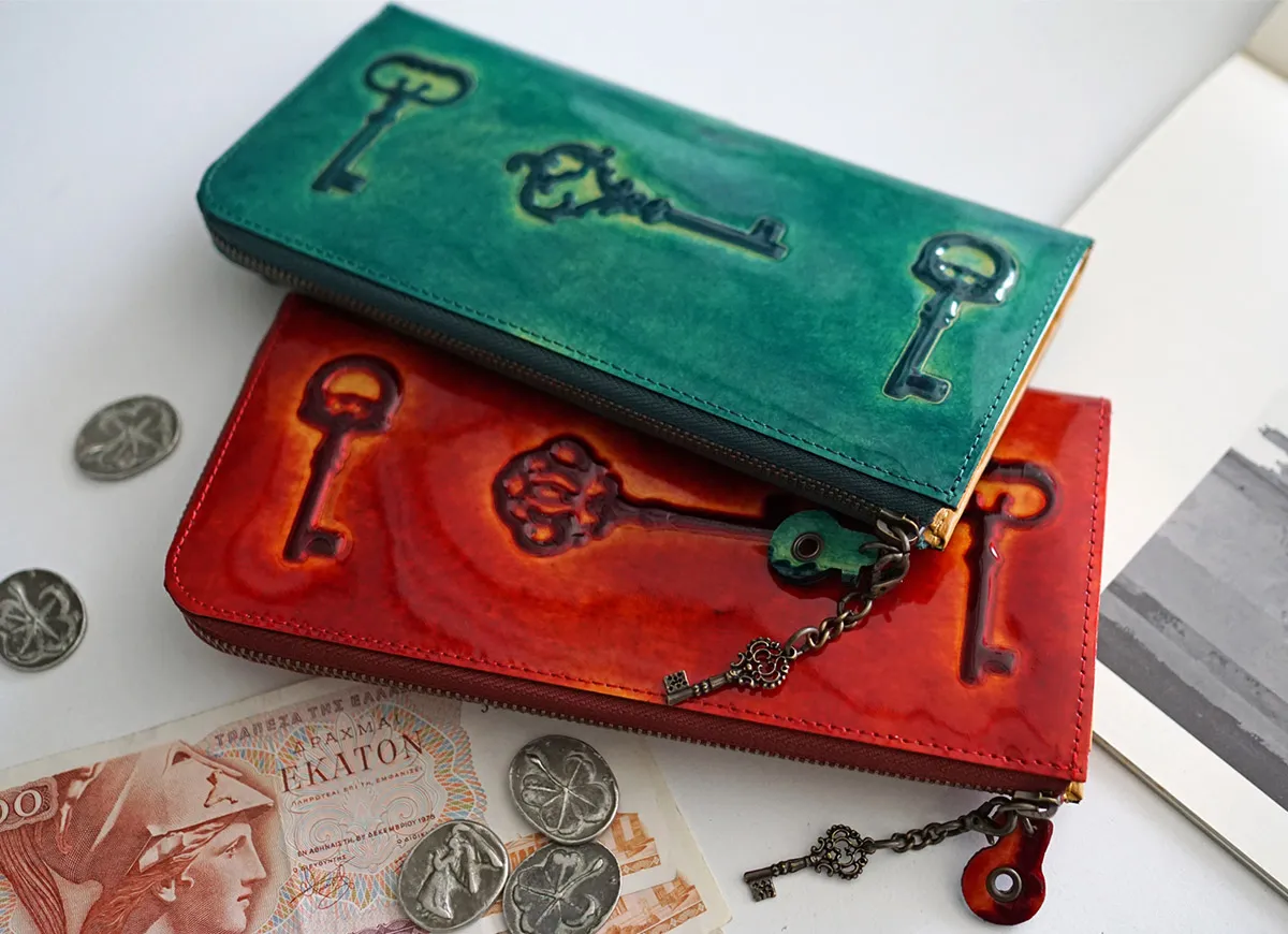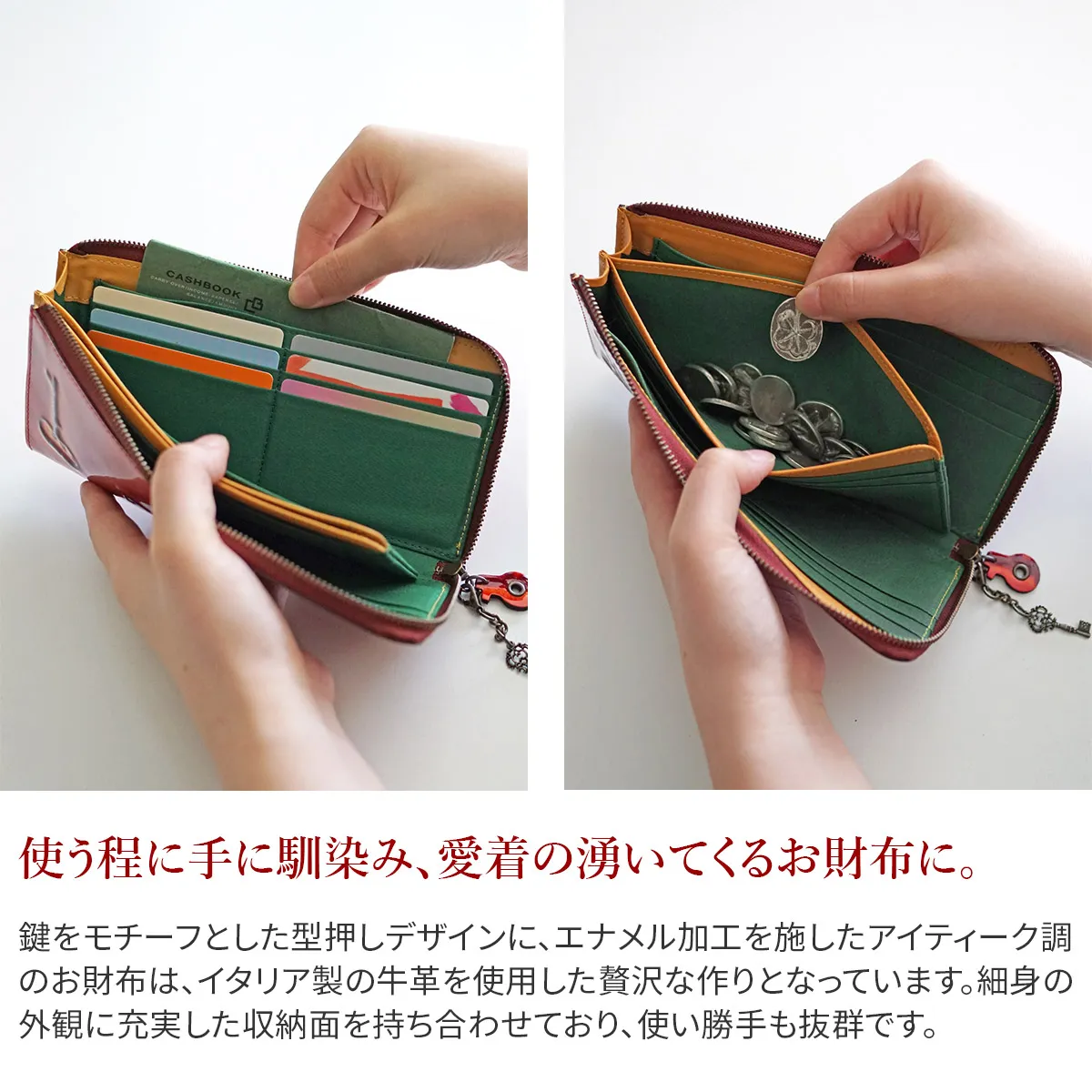 レトロ調の落ち着いた色合いが雰囲気たっぷりのアンティークキーがそのまま革になったようなシリーズです。 鍵デザインが引手にも施されたアンティーク調のロングウォレット。開口はL字ファスナーでスムーズな開閉が可能。中身を一目で見渡せる視認性の良い作りとなっています。薄マチながら計20枚のカードが収まり、フォルムが崩れにくい作りの為、スッキリと持ち運ぶことができます。
