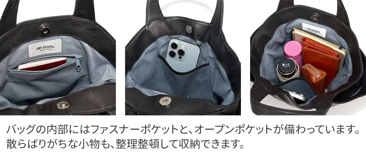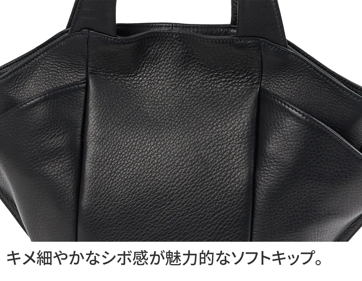 キメ細やかでしっとりと手に吸い付くようなソフトキップを贅沢に使った、20年以上続くVIADOAN定番のシリーズです。 サイドポケットにより扇状に広がる、シェルフォルムが目を惹くトートバッグ。 シボの美しい、上質感漂うソフトキップで仕立てており上品な印象です。 開口部は、マグネットで簡単に開閉を行えます。マチ幅をしっかり確保している為、 中身を一目で見渡せ荷物の出し入れもスムーズに行えます。