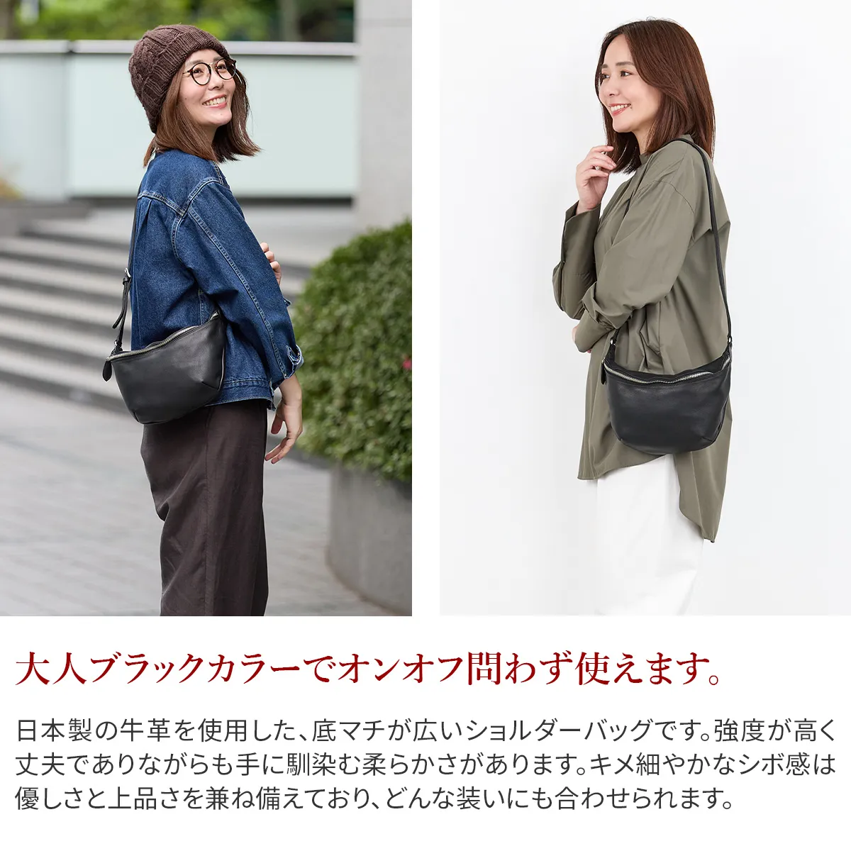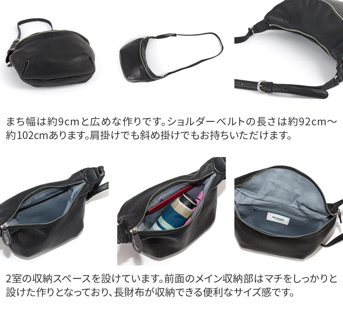 キメ細やかでしっとりと手に吸い付くようなソフトキップを贅沢に使った、20年以上続くVIADOAN定番のシリーズです。 2室の収納スペースを設けており、用途に合わせて整理収納できるショルダーバッグです。 前面のメイン収納部にはマチをしっかり設けた作りとなっており、長財布が収納できる便利なサイズ感です。 ショルダーや斜め掛けで持つことができ、ソフトな素材が身体に寄り添い心地良く持つことができるユニセックスデザインのアイテムです。