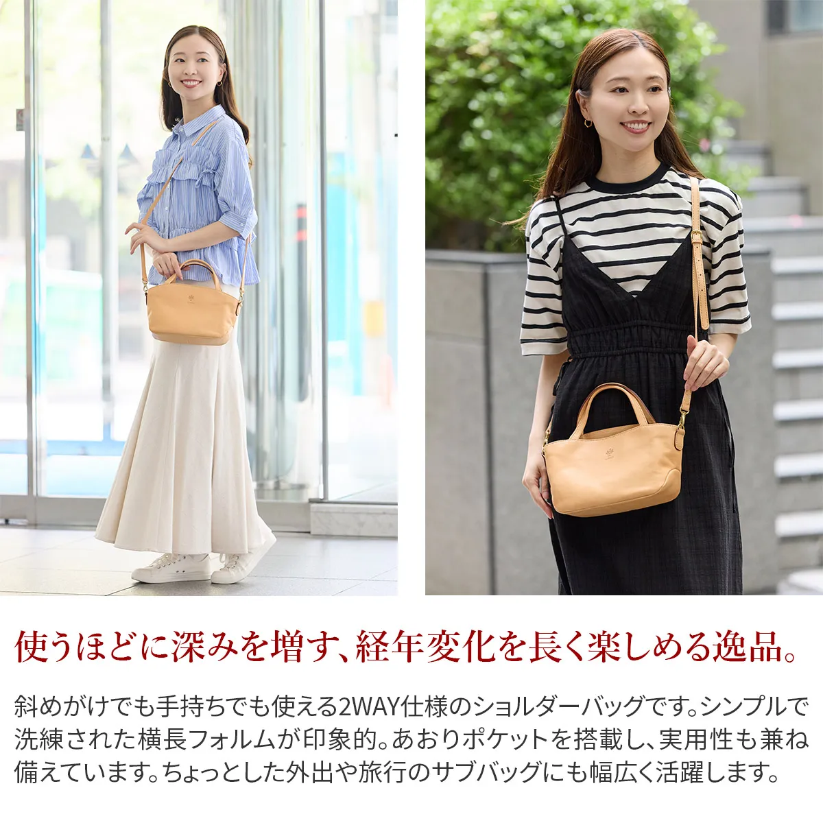 「自然を大切にしたい」はALBEROのフィロソフィー。 Naturaleは、それを象徴するシリーズ。 牛革ショルダー部を植物タンニンでなめし染色を施さず使う程に飴色に変化して光沢が増す素材。 小ぶりなサイズ感が上品な印象の、ヌメ革仕立ての2WAYショルダーバッグ。 ナチュラルな革の風合いを楽しめる、シンプルなデザインが魅力となっています。 前後にあおりポケットを設けた3室構造の為、荷物の整理がしやすく取り出しもスムーズに行えます。 2WAY仕様となっており、コーデや様々なシーンに対応し重宝する逸品です。