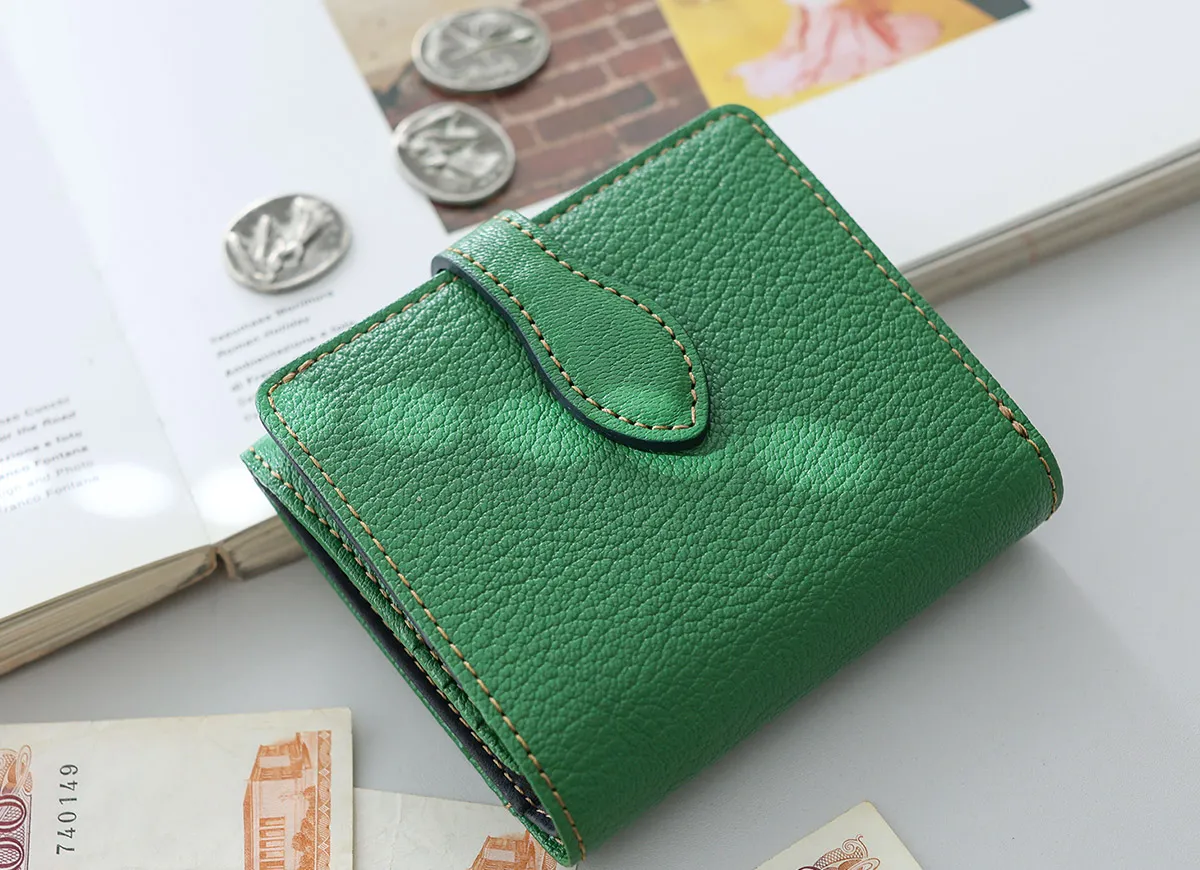 “Capretta”小ヤギ=伊美しいシボと発色の良さが魅力の仏製シェーブル (小ヤギ革)は、品格溢れる洗練された趣き。丈夫でとても軽く、高級感のあるシリーズです。 シンプルなデザインに、内装のバイカラーが美しく映える二つ折り財布。スナップボタンを開けると、7ヶ所のカード入れと仕切り付きのお札入れ、大きく開くBOX式の小銭入れへとアクセスできます。大人の遊び心を感じさせるカラーアクセントが、日常にさりげない彩りを添えてくれるアイテムです。