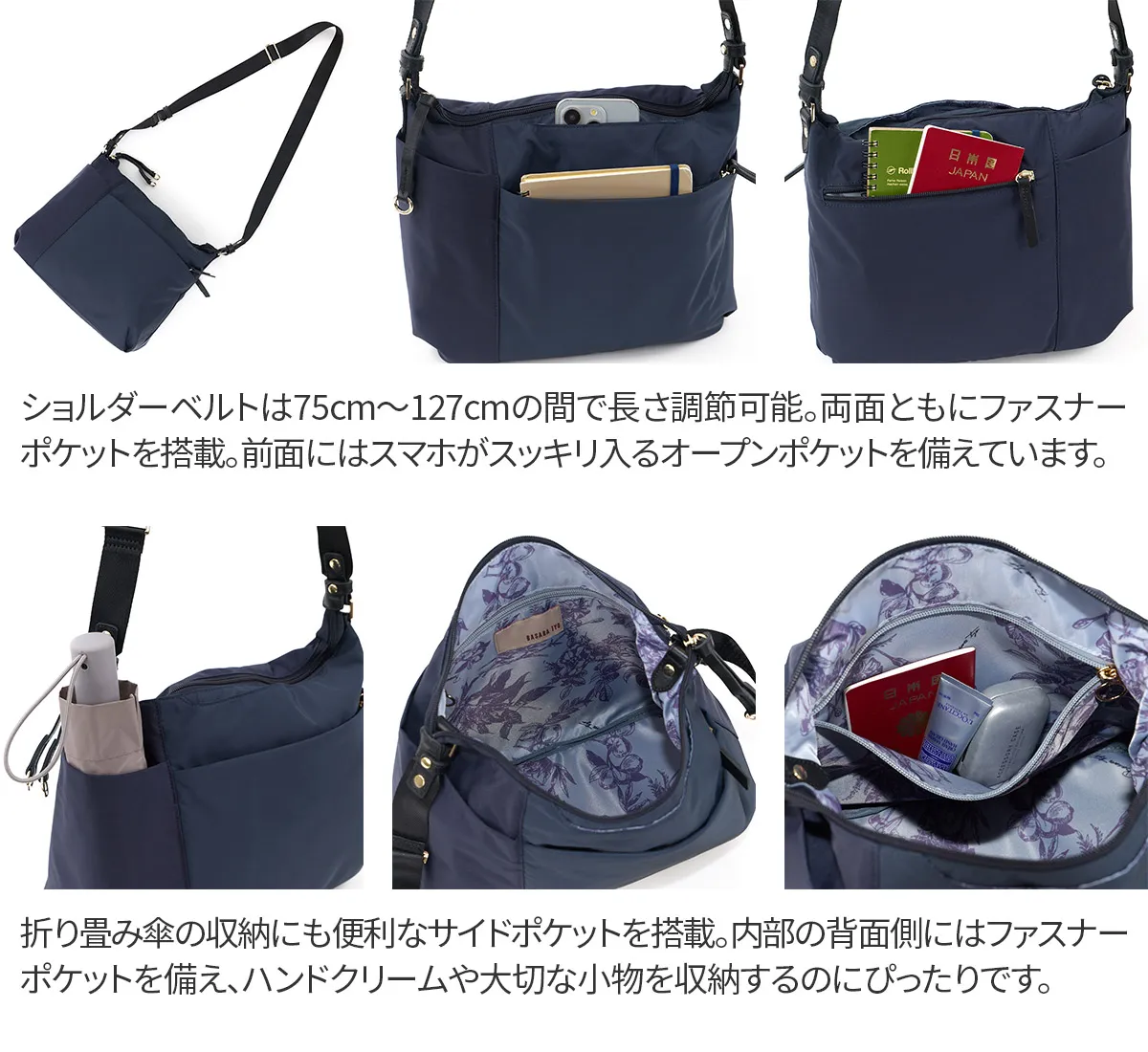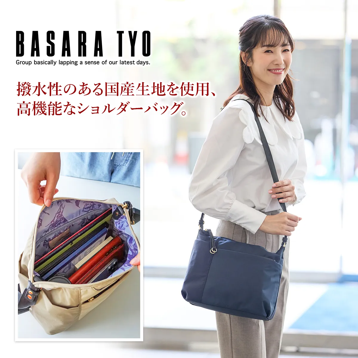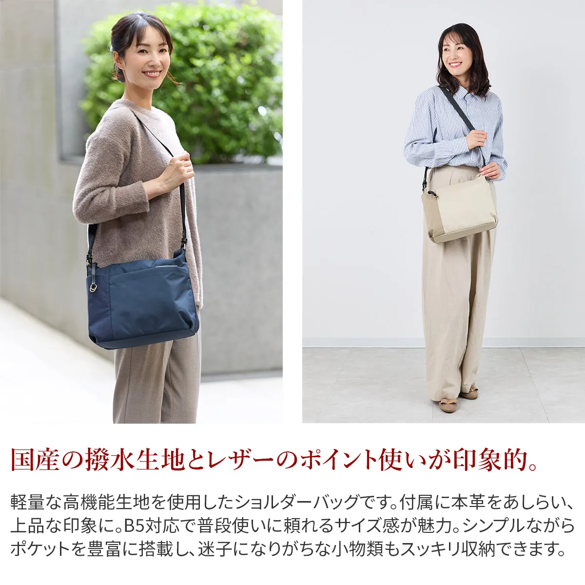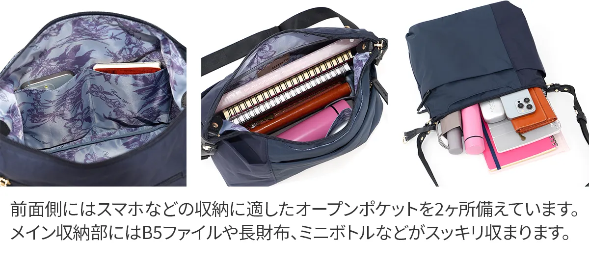 国産の撥水生地と優しいタッチ感の牛革を使用しています。 水や汚れを弾き、軽量でお手入れもかんたん。空模様を気にせず、抜群の使い勝手で毎日活躍してくれるバッグです。 《素材の特性》 天然皮革を使用しており、革そのものの風合いを生かすため、過度な色止め加工などは行っておりません。そのため、水に濡れたり、強い摩擦などにより、色落ちする恐れがございます。 高機能なナイロン素材で、軽くて快適に使えるショルダーバッグ。 大小さまざまなポケットを設けており、小物をサッと取り出せます。 メイン収納部は長財布もすっぽり収まる実用的なサイズ感。 撥水機能を備えている為、毎日のお出かけや旅行先のお供として、 急な雨でも安心して気兼ねなくご使用いただけます。