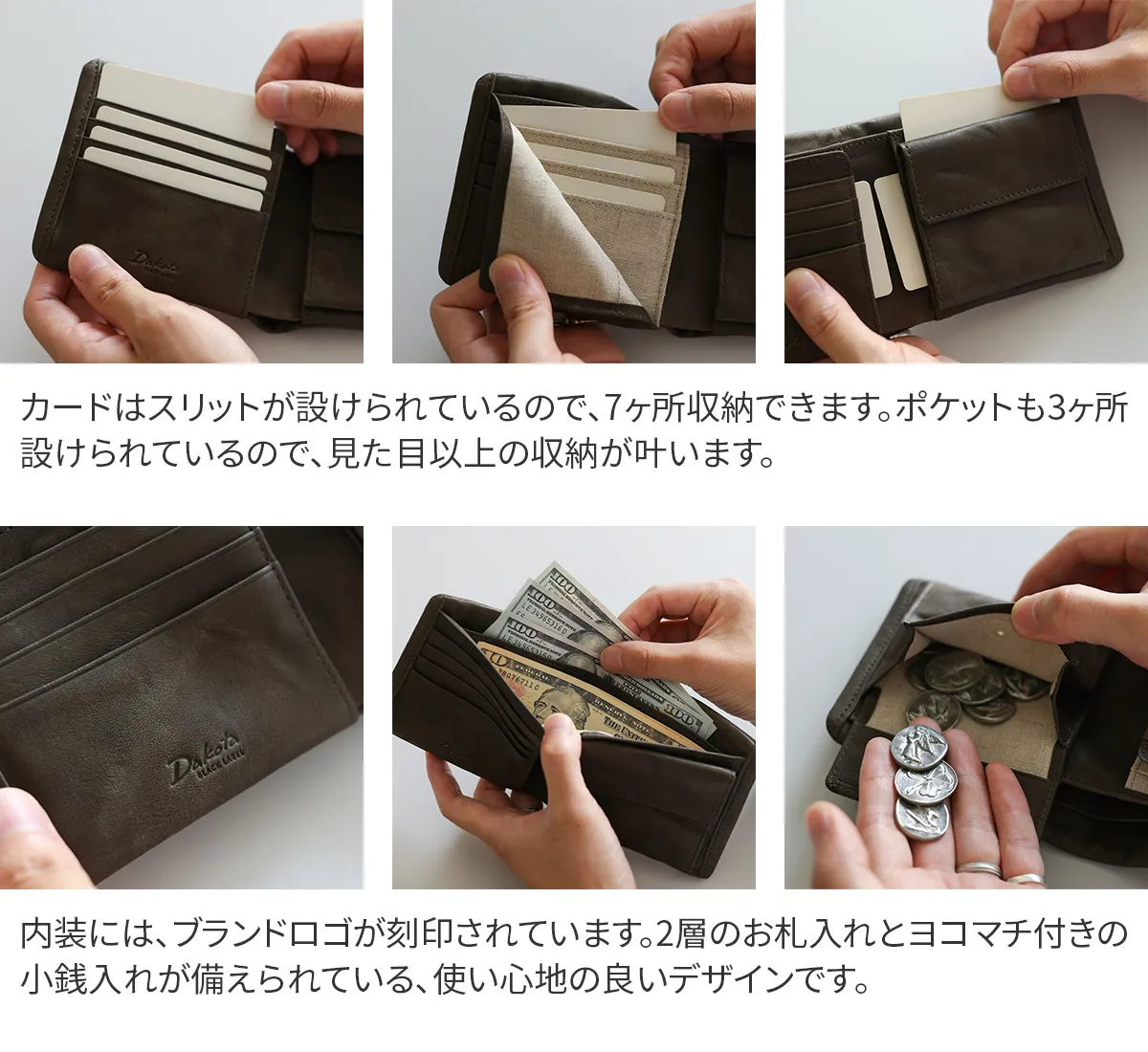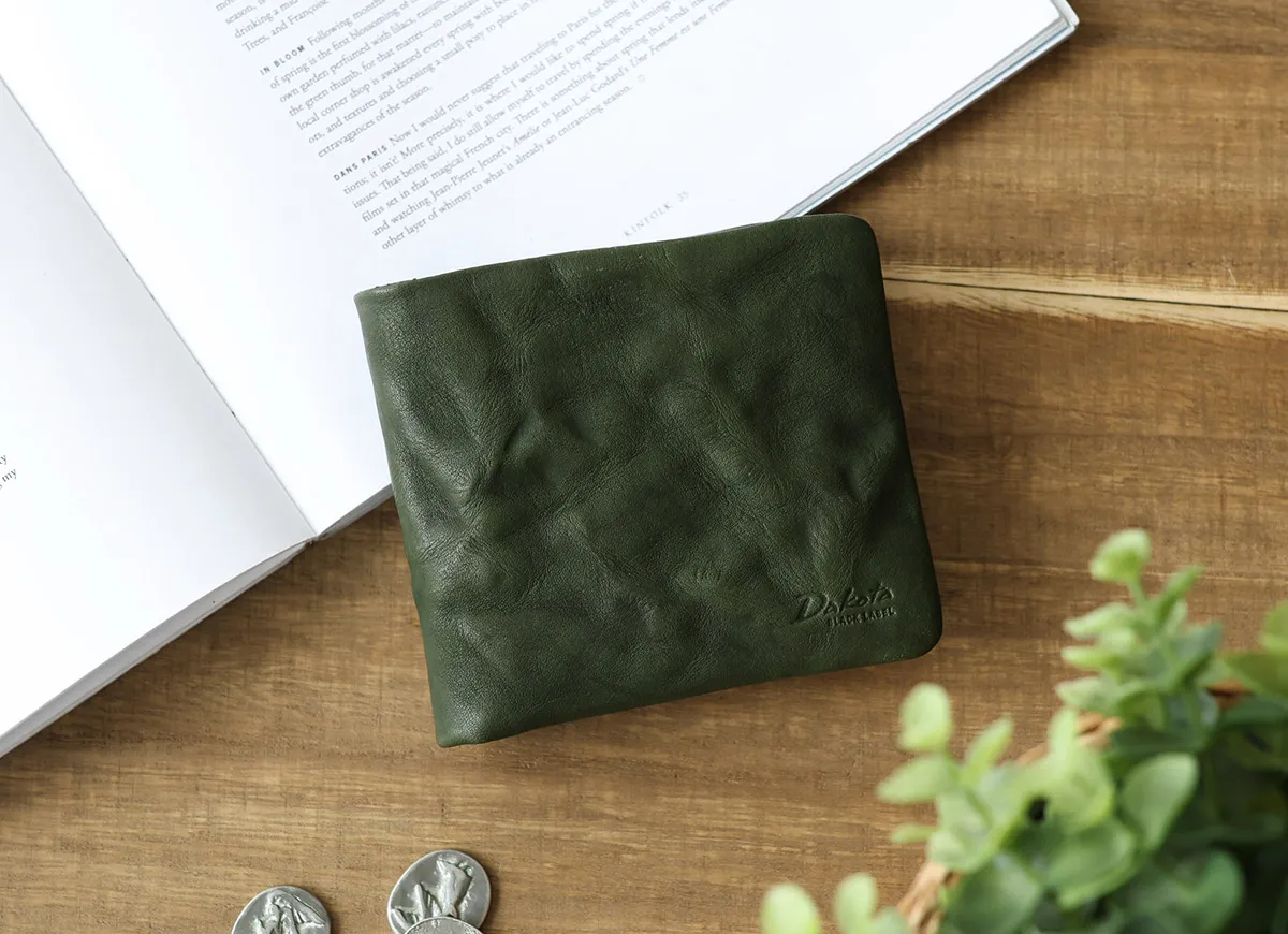 手作業で揉み加工を施した革を使用したヴィンテージ感あふれるシリーズ「ワンダラー」。 同じものが二つとしてない凹凸感と、オイルを含み、使い始めから柔らかい革の質感が特徴です。 袋縫いのつくりや、風合い豊かな麻の裏地がナチュラルな素材本来の魅力にあたたかみを与えます。 時間と幾多の行程を経た迫力ある革は、使うほどに重厚な艶が増し、唯一無二の表情へと変化していきます。 柔らかな質感が手に馴染む、独特な凹凸感が魅力の二つ折り財布。 小銭入れは、ヨコマチがついているので出し入れがしやすい仕様となっています。 裏地は、麻の生地を使用しておりナチュラルな雰囲気も感じられます。 シンプルながらも周りと差をつけるヴィンテージ感のあるデザインです。