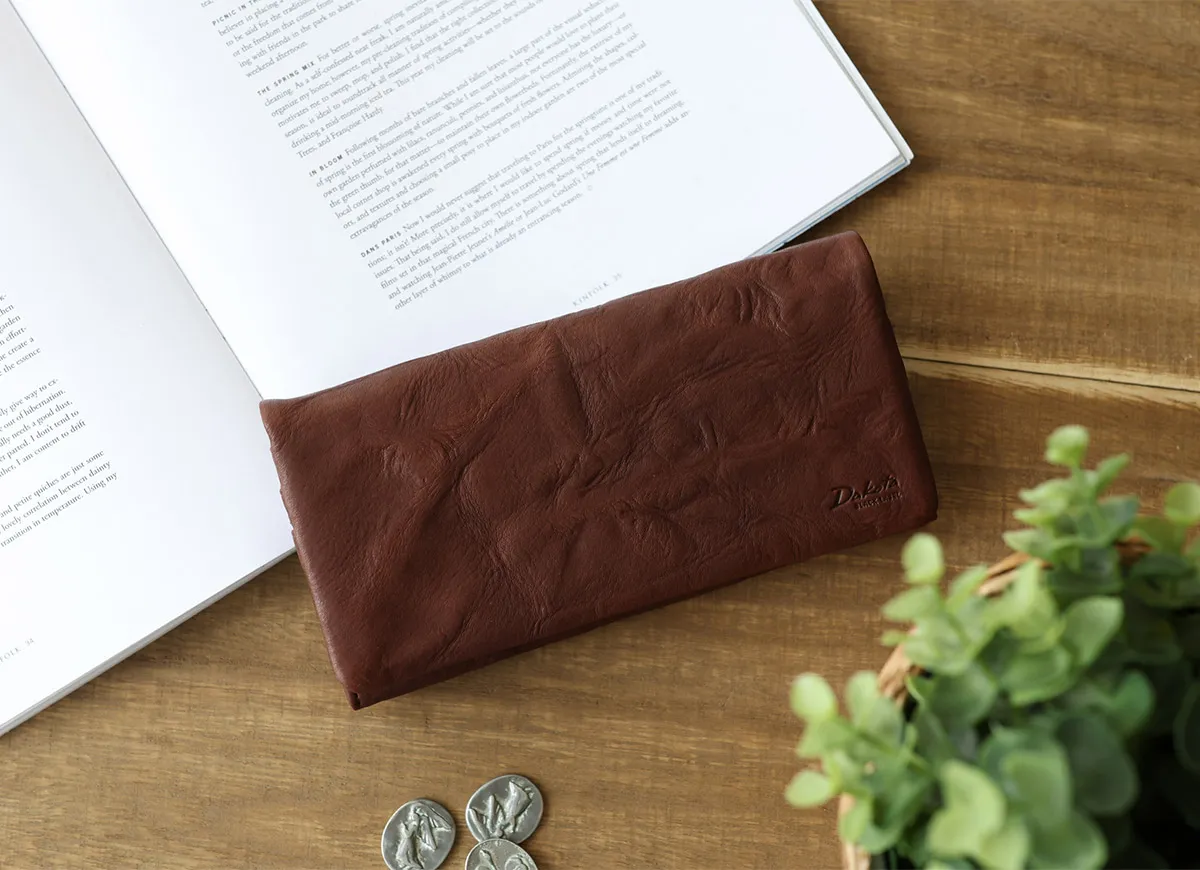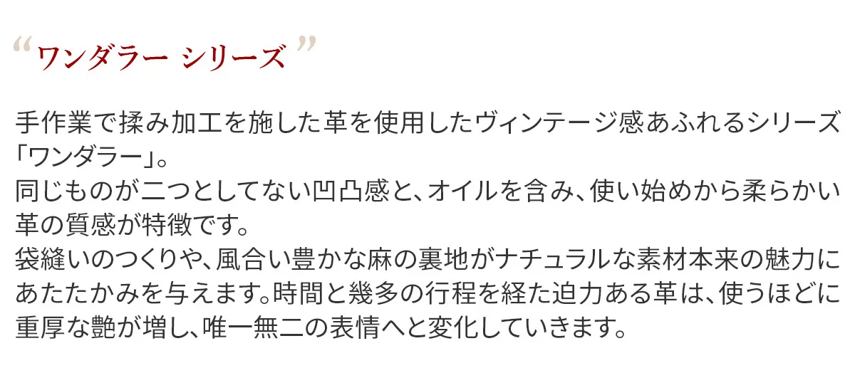 手作業で揉み加工を施した革を使用したヴィンテージ感あふれるシリーズ「ワンダラー」。 同じものが二つとしてない凹凸感と、オイルを含み、使い始めから柔らかい革の質感が特徴です。 袋縫いのつくりや、風合い豊かな麻の裏地がナチュラルな素材本来の魅力にあたたかみを与えます。 時間と幾多の行程を経た迫力ある革は、使うほどに重厚な艶が増し、唯一無二の表情へと変化していきます。 柔らかな質感が手に馴染む、独特な凹凸感が魅力の長財布。 内装は、ポケットがたくさん設けられているので収納には困りません。 裏地は、麻の生地を使用しておりナチュラルな雰囲気も感じられます。 シンプルながらも周りと差をつけるヴィンテージ感のあるデザインです。