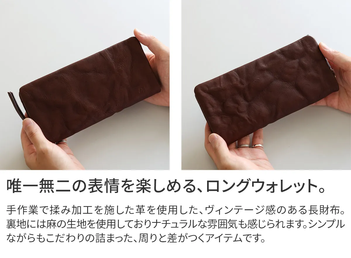手作業で揉み加工を施した革を使用したヴィンテージ感あふれるシリーズ「ワンダラー」。 同じものが二つとしてない凹凸感と、オイルを含み、使い始めから柔らかい革の質感が特徴です。 袋縫いのつくりや、風合い豊かな麻の裏地がナチュラルな素材本来の魅力にあたたかみを与えます。 時間と幾多の行程を経た迫力ある革は、使うほどに重厚な艶が増し、唯一無二の表情へと変化していきます。 柔らかな質感が手に馴染む、使い心地の良い長財布。 内装は、ポケットがたくさん設けられており、収納には困りません。 裏地は、麻の生地を使用しておりナチュラルな雰囲気も感じられます。 シンプルながらも周りと差をつけるヴィンテージ感のあるデザインです。