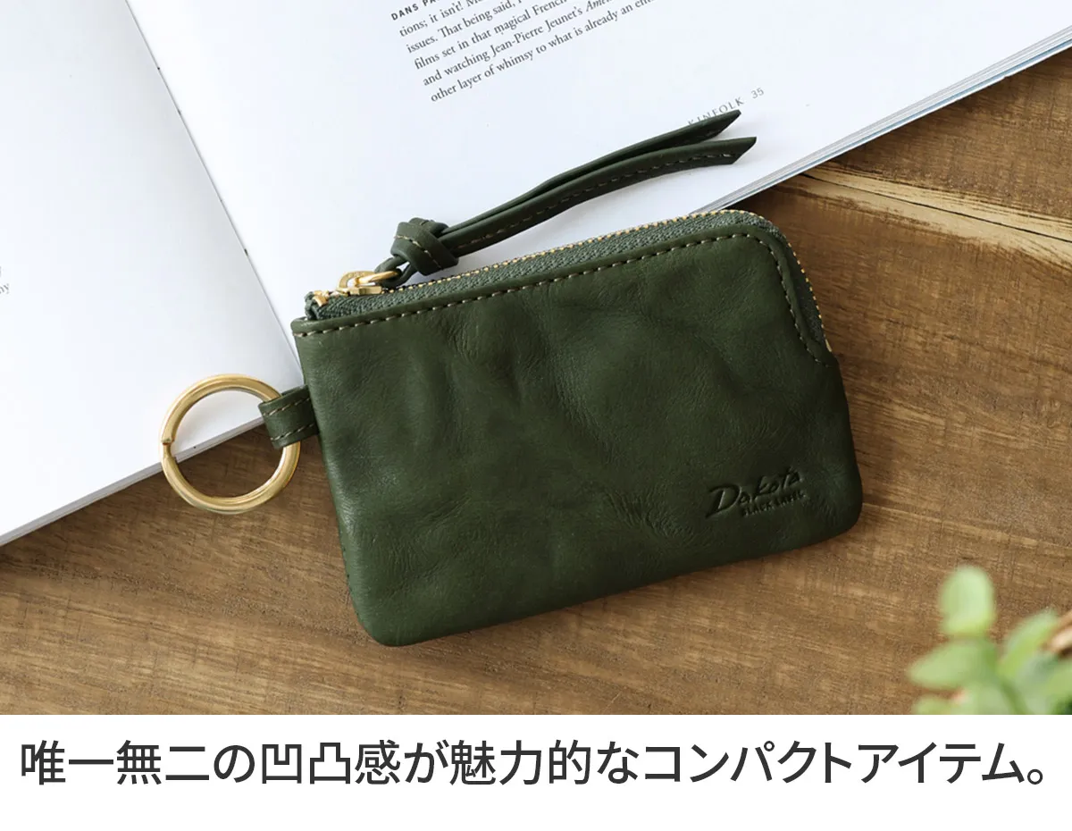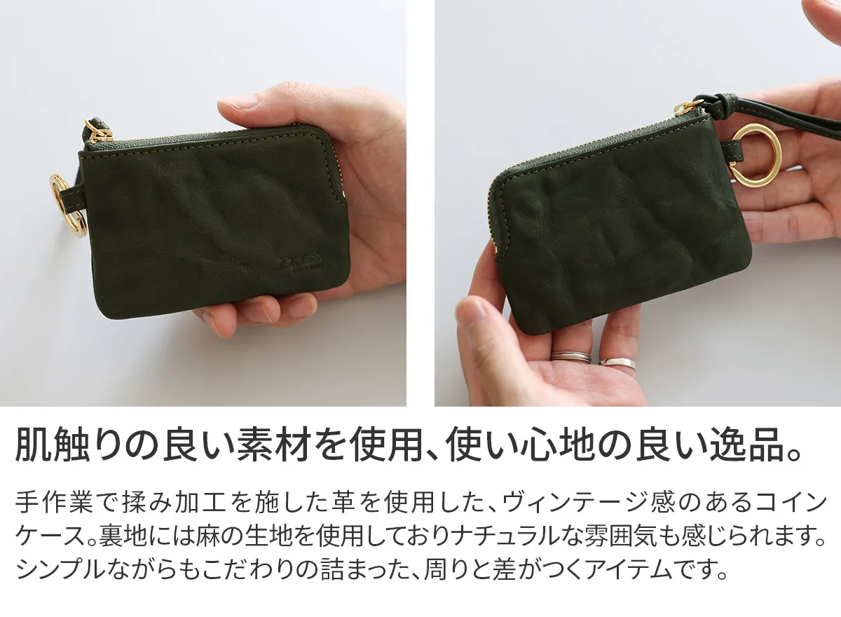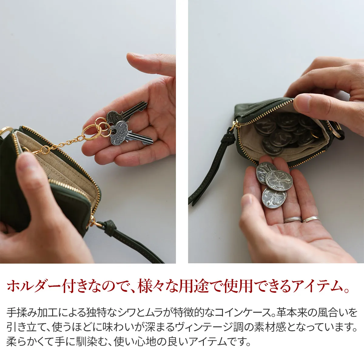 手作業で揉み加工を施した革を使用したヴィンテージ感あふれるシリーズ「ワンダラー」。 同じものが二つとしてない凹凸感と、オイルを含み、使い始めから柔らかい革の質感が特徴です。 袋縫いのつくりや、風合い豊かな麻の裏地がナチュラルな素材本来の魅力にあたたかみを与えます。 時間と幾多の行程を経た迫力ある革は、使うほどに重厚な艶が増し、唯一無二の表情へと変化していきます。 様々な用途で活躍するコンパクトなコインケース。 内部には、鍵を取り付けられるキーリングがついており、使用頻度の高い鍵をまとめて収納できます。 また、キーリングは取り外しが可能なので、コインケースとしてもお使いいただけます。 シンプルながらも周りと差をつけるヴィンテージ感のあるデザインです。