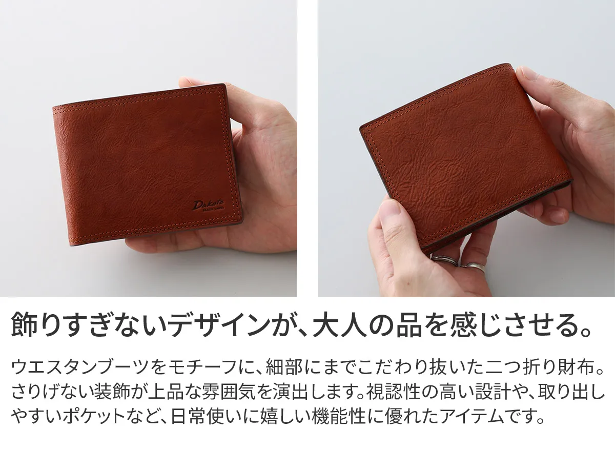 バケッタレザーに西部開拓時代のエッセンスを加えたシリーズ「ハイデ」。 普遍的なデザインに、ウエスタンブーツの装飾を思わせるアウトラインや、鐙を連想させるアンティーク調の引手など、さりげないアクセントが上品な表情を添えています。 荒野や未開拓地を思わせる色合いは、使い込むほどに革の風合いが増し、エイジングの楽しさを存分に味わえます。 伝統的な素材とディティールを大切にしながらも、現代のライフスタイルに合ったサイズ感と機能性を兼ね備えた逸品です。 西部開拓時代のエッセンスを纏った、クラシカルな二つ折り財布。 イタリア製バケッタレザーが、使うほどに深まる艶と風合いを演出。 ウエスタンブーツを思わせる曲線のアウトラインが個性を引き立てます。 収納箇所もたくさんあり、機能性も充実。 さりげないヴィンテージ感も感じられる逸品です。