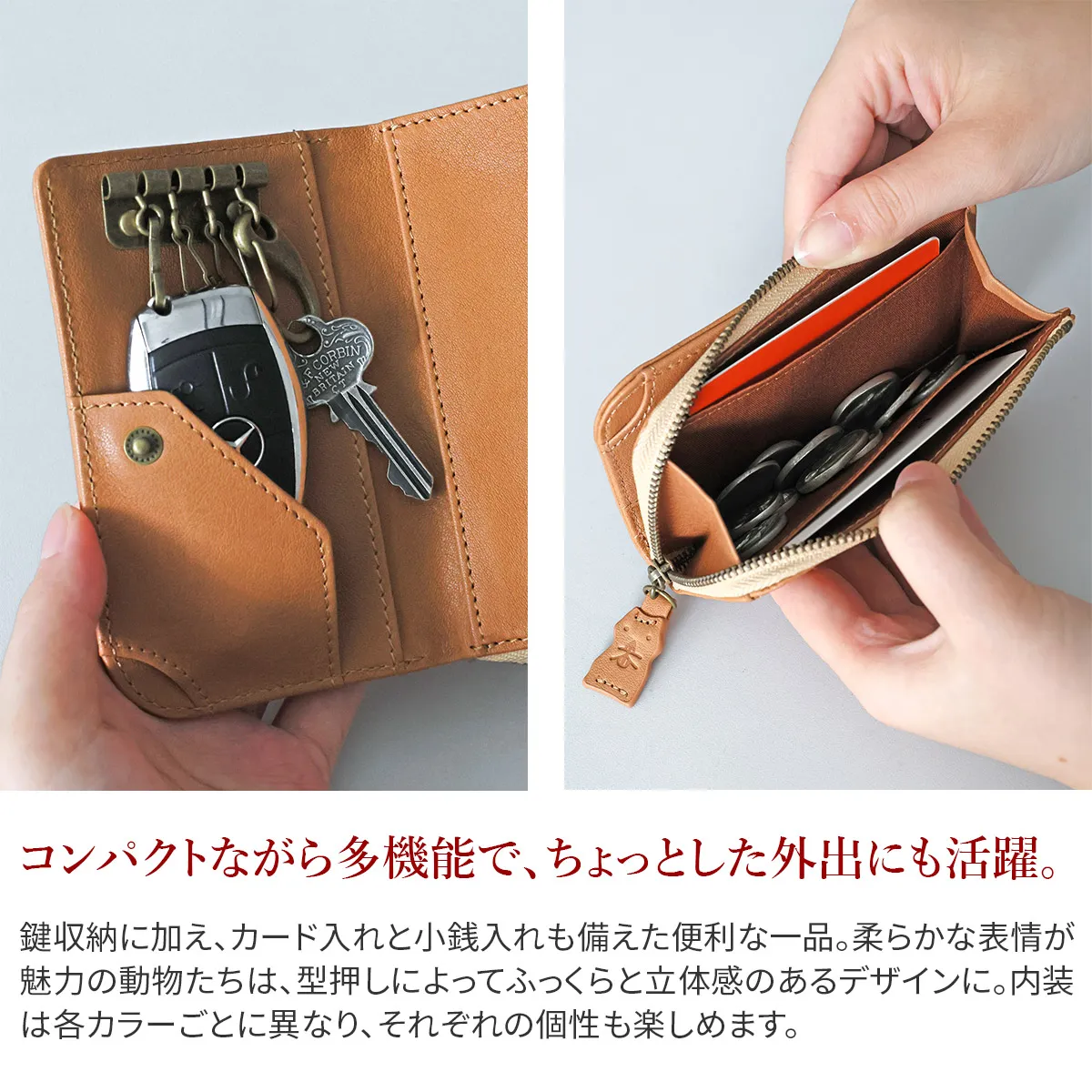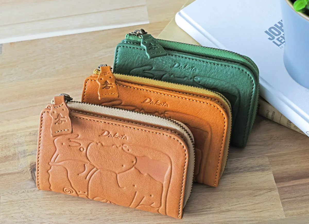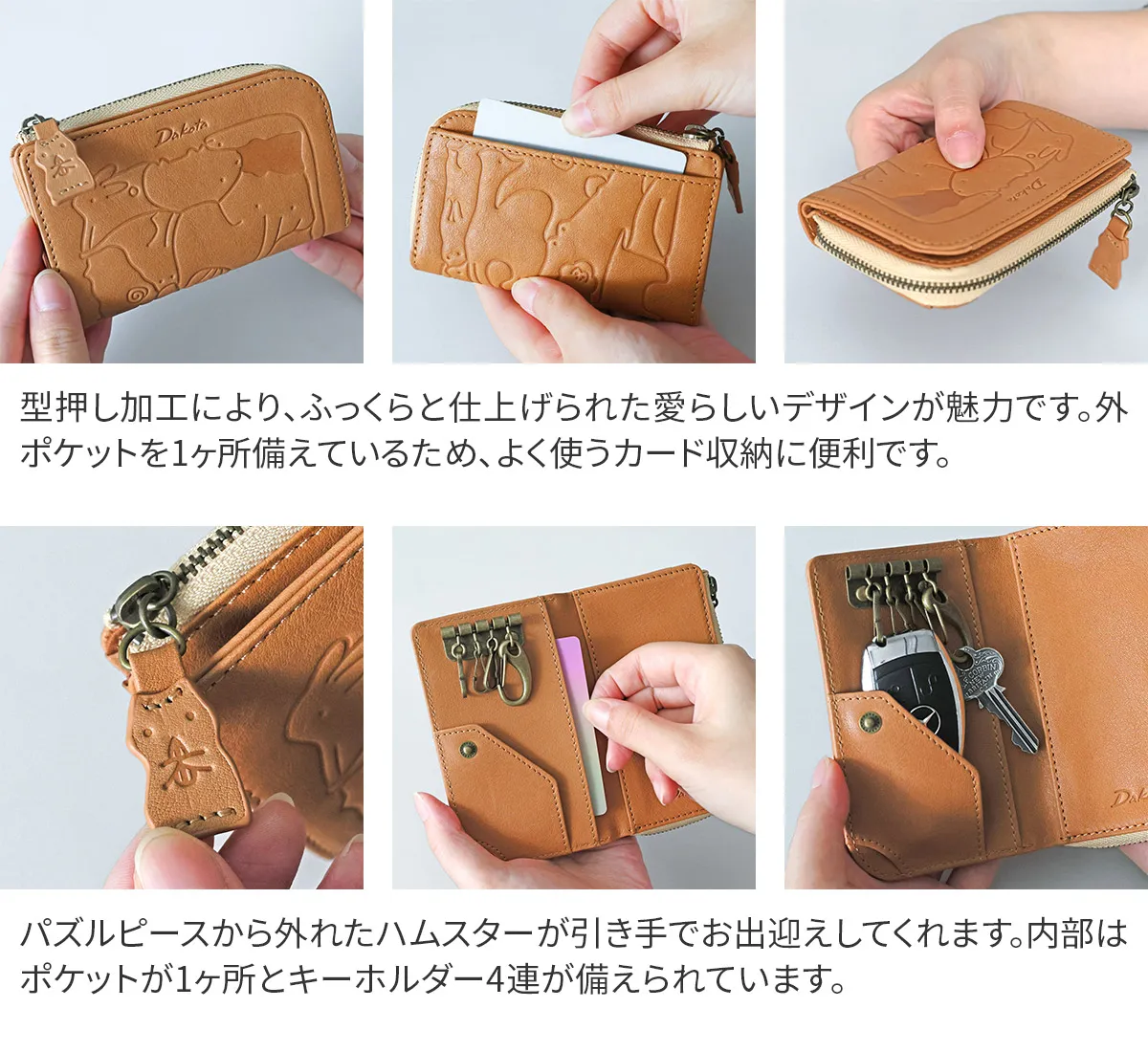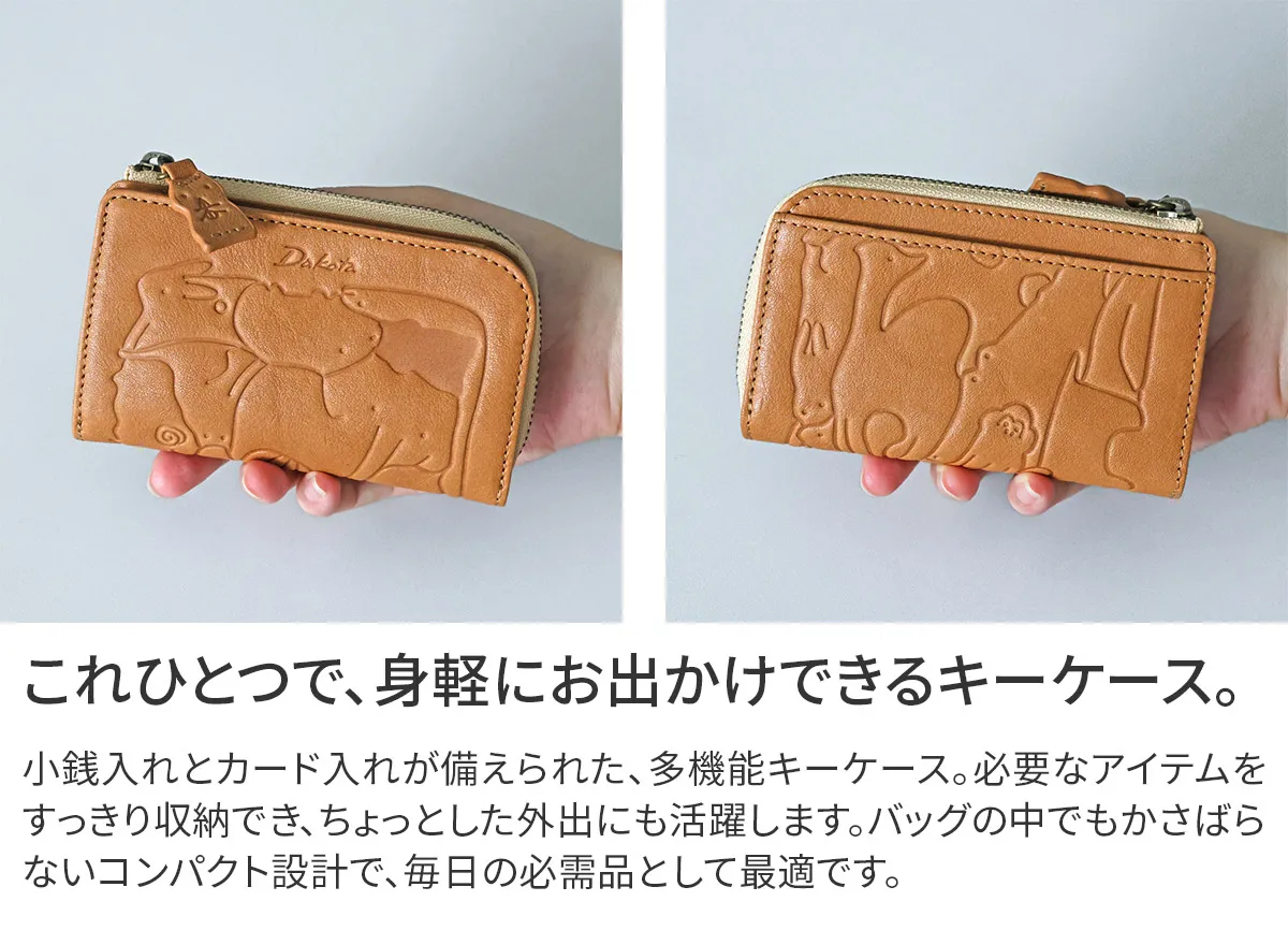 子供の頃を思い出す懐かしい動物パズルを素上げの革に型押ししました。 様々な動物がギュッと詰まった柄は見ているだけで楽しい気持ちにさせてくれます。 引手にはパズルのピースであるハムスターが使用されています。 どんな動物がいるのか探すのも楽しい遊び心いっぱいのシリーズです。 鍵を簡単に取り付けられるナスカン付きキーケース。カードポケットと小銭入れを備え、これ一つで外出も安心。使うほどに味わいが深まり、長く愛用できるアイテムです。