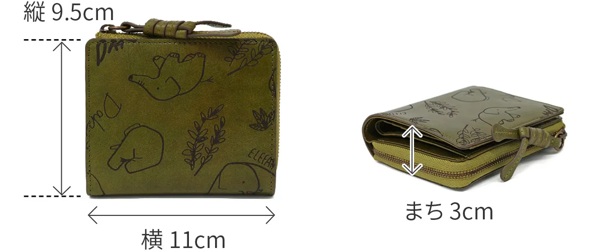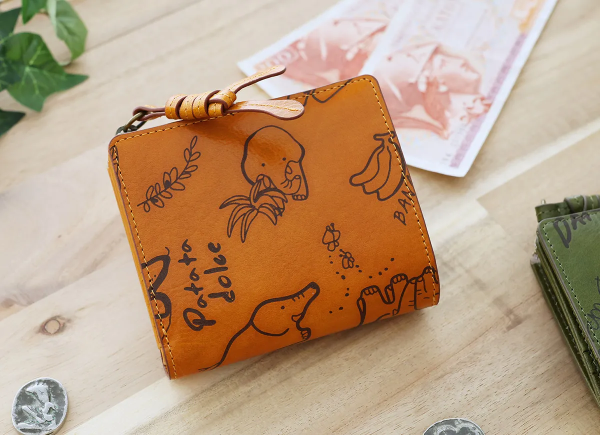 好物を食べたりかくれんぼしたりゆったりと自由気ままに生きるゾウたちに心癒されるシリーズ。深みのあるイタリアンレザーの表面をレーザーで焦がす技法を用いて手描きタッチのイラストが表現されています。 イタリアンレザーの表面に、手描き風タッチのゾウや植物をレーザーで焦がす技法を用いて描いた、温もりあふれる二つ折り財布。繊細なデザインがレザーの質感と調和し、存在感を放ちます。引き手にはユニークな形状を採用し、掴みやすく引っ張りやすい快適な操作性を実現。仕切り付きのお札入れと小銭入れに加え、一目で見渡せるカードポケットを備えており、スムーズなお支払いをサポートします。