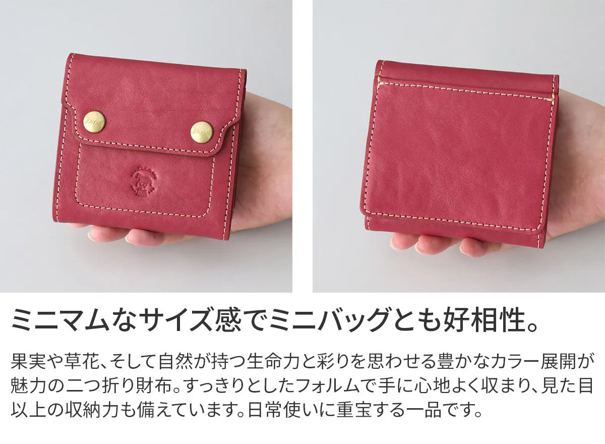 果実や草花、そして自然が持つ生命力と彩り。その色鮮やかな美しさを、厳選されたイタリアンレザーで表現されています。心に響くお気に入りのカラーが、日々の暮らしに上質な彩りと心地よい自分らしさをもたらします。 イタリアンレザーならではの、革本来のシワやトラが生み出す豊かな表情を楽しめる二つ折り財布。使うほどに手になじみ、深みのある艶へと育っていきます。収納スペースは見やすくシンプルに設計され、必要なものをすっきり整理しやすい仕様。素材の上質さと使いやすさを両立した、長く寄り添う一品です。