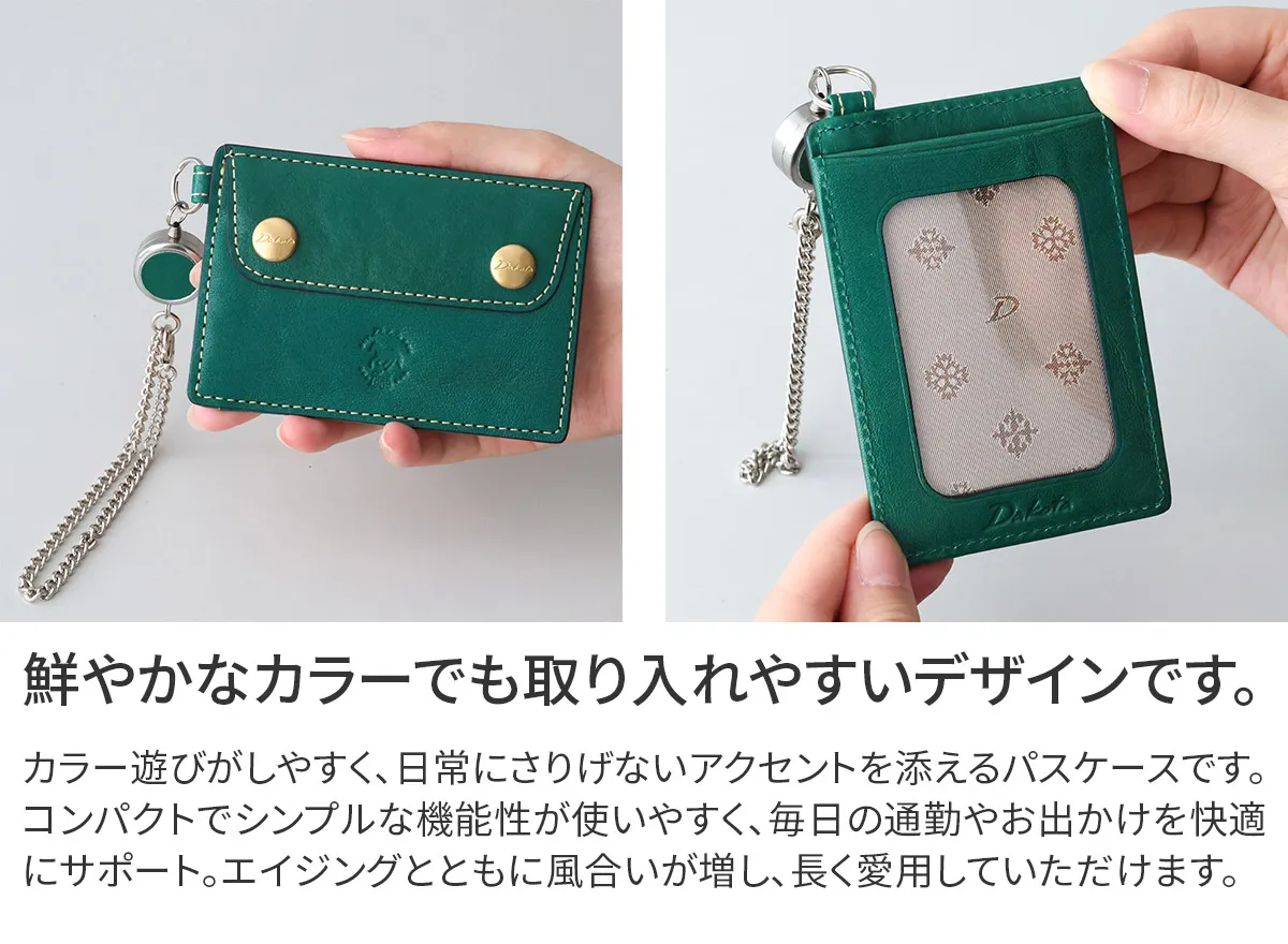 果実や草花、そして自然が持つ生命力と彩り。その色鮮やかな美しさを、厳選されたイタリアンレザーで表現されています。心に響くお気に入りのカラーが、日々の暮らしに上質な彩りと心地よい自分らしさをもたらします。 手紙のような愛らしいデザインのパスケース。定期券やカードを収納できるシンプルな構造で、毎日の通勤・通学をスムーズにサポートします。バッグやリュックに付けておけば、必要な時にさっと取り出せてとても便利です。