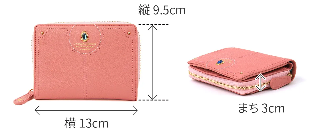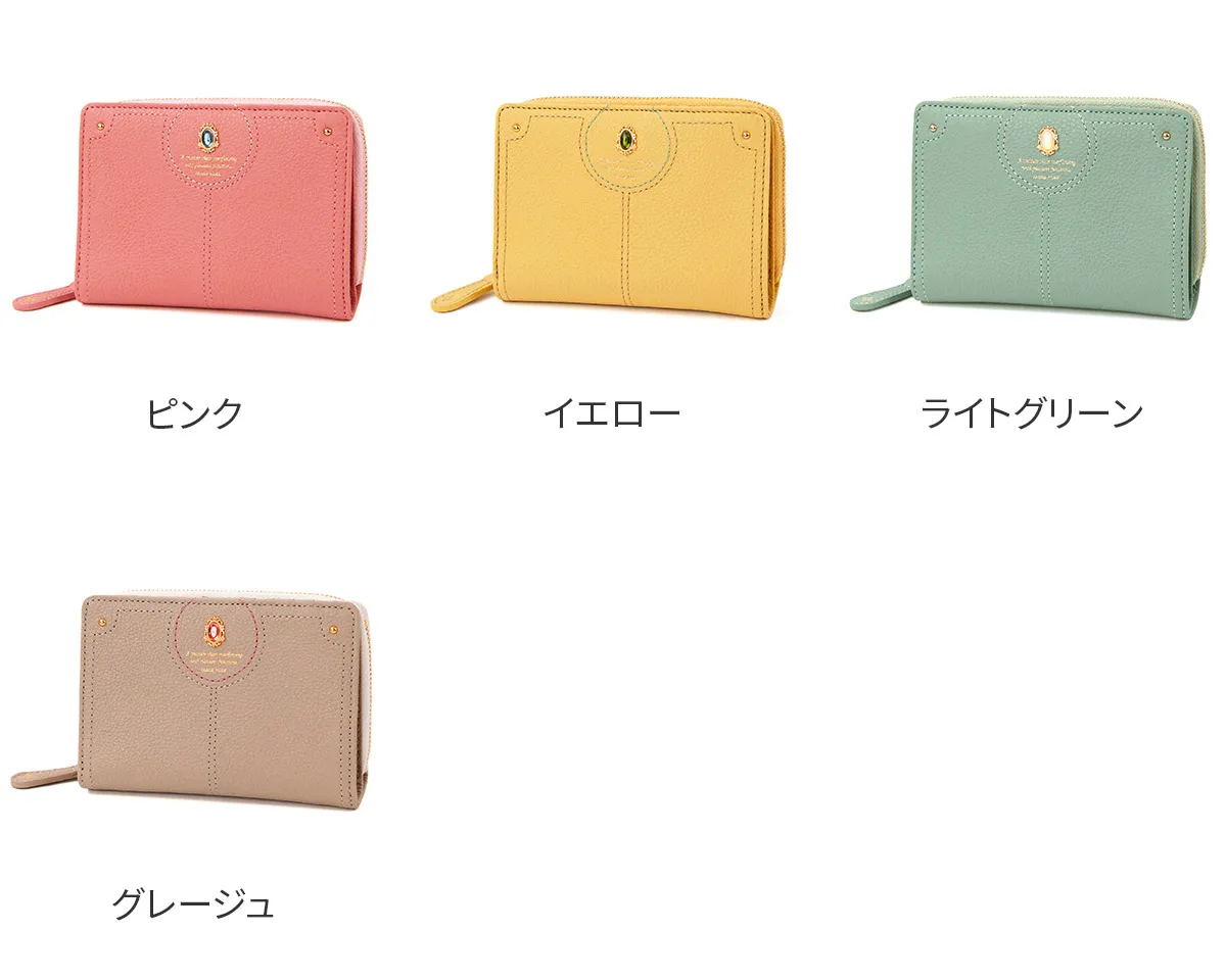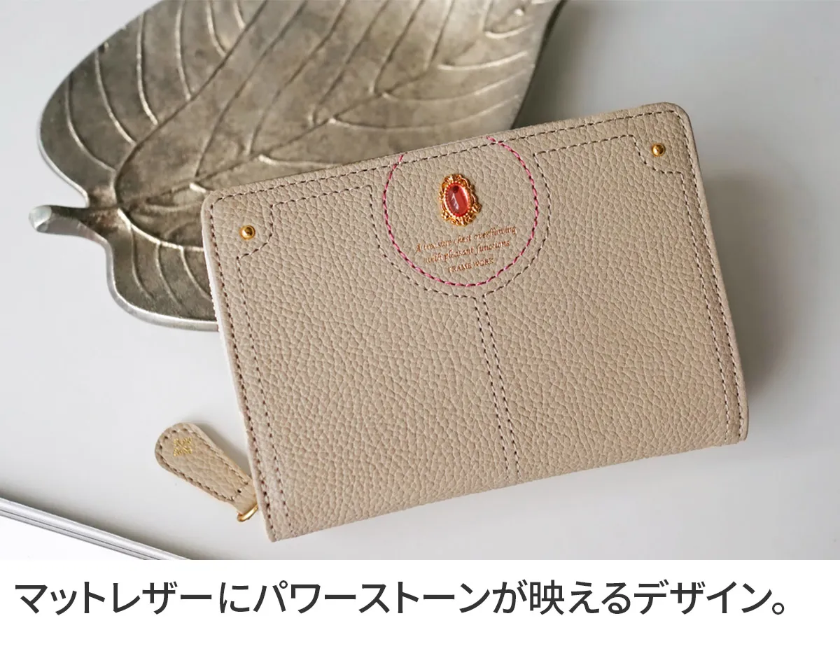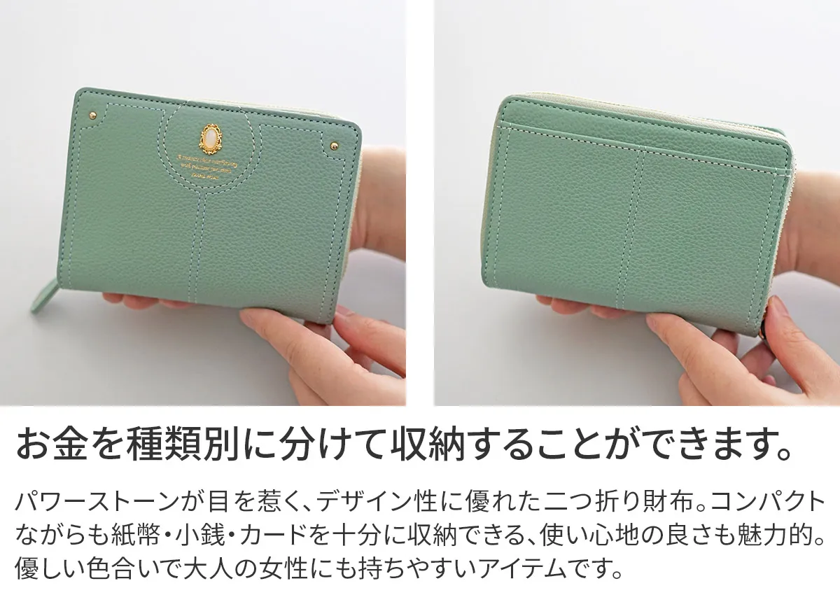 煌めくレザーに、パワーストーンをあしらったシリーズ。ガラスから生まれた鮮やかなストーンは周囲に漂う力を柔らかく変換し、持つ人に優しく寄り添います。色に込めた意味とともに、大人の女性の日常に活力を。 パワーストーンが目を惹く、デザイン性に優れた二つ折り財布。コンパクトながらも紙幣・小銭・カードを十分に収納できる、使い心地の良い逸品です。お札入れと小銭入れは、2層になっているので、分けて収納できるのもポイントです。