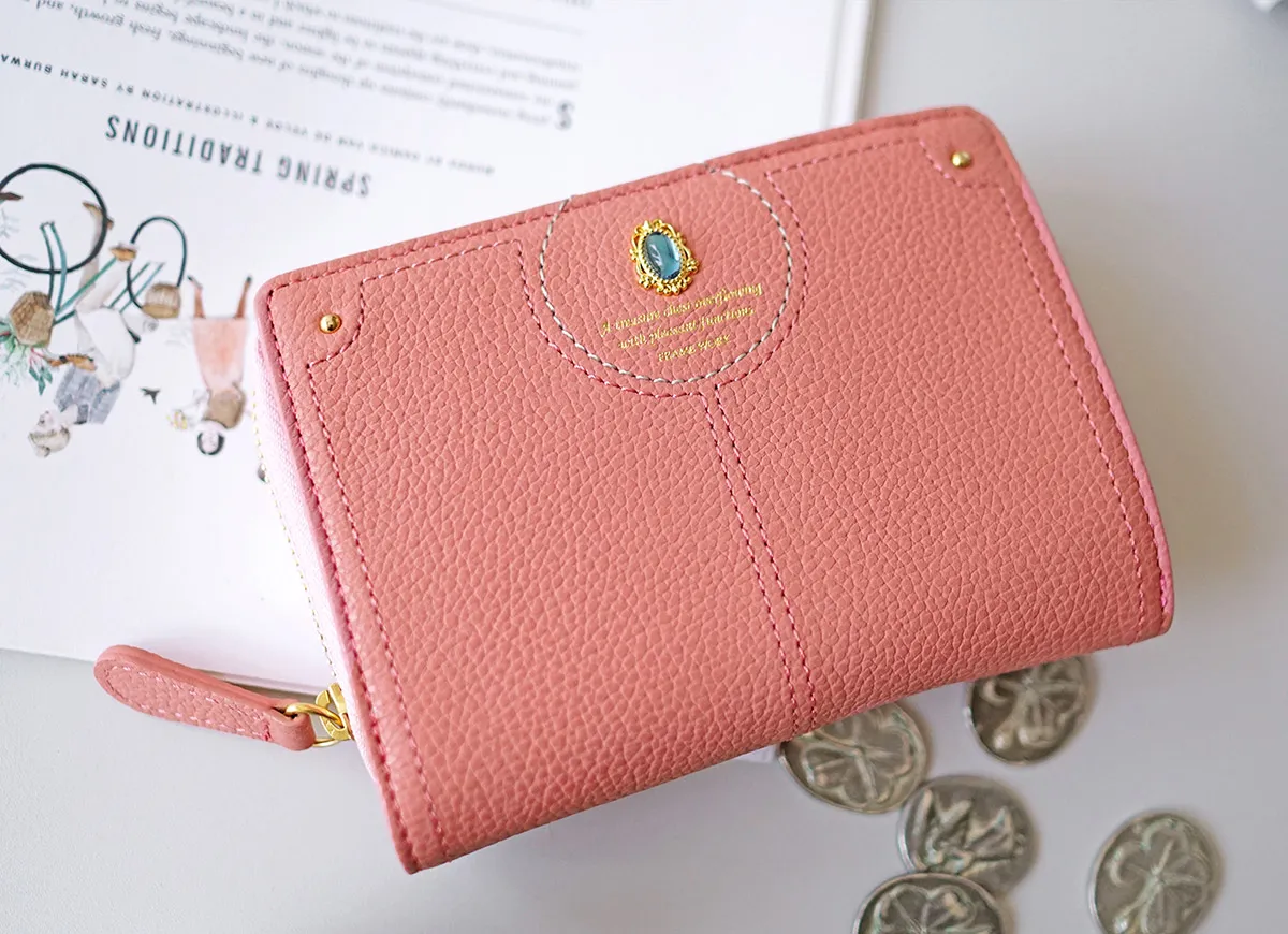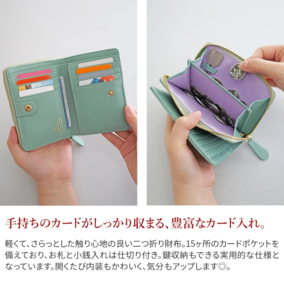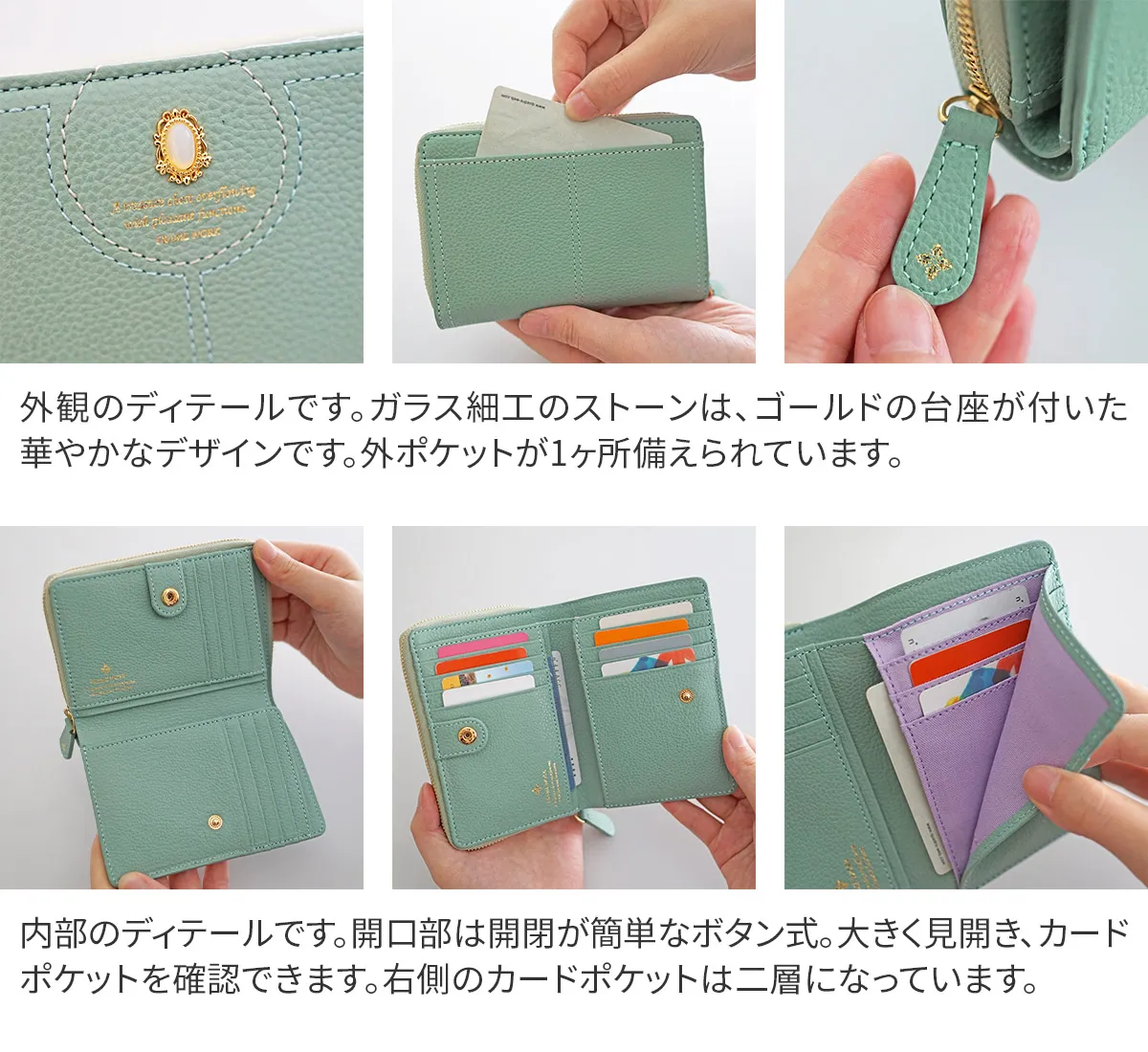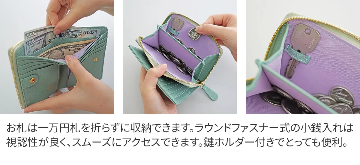 煌めくレザーに、パワーストーンをあしらったシリーズ。ガラスから生まれた鮮やかなストーンは周囲に漂う力を柔らかく変換し、持つ人に優しく寄り添います。色に込めた意味とともに、大人の女性の日常に活力を。 パワーストーンが目を惹く、デザイン性に優れた二つ折り財布。コンパクトながらも紙幣・小銭・カードを十分に収納できる、使い心地の良い逸品です。お札入れと小銭入れは、2層になっているので、分けて収納できるのもポイントです。